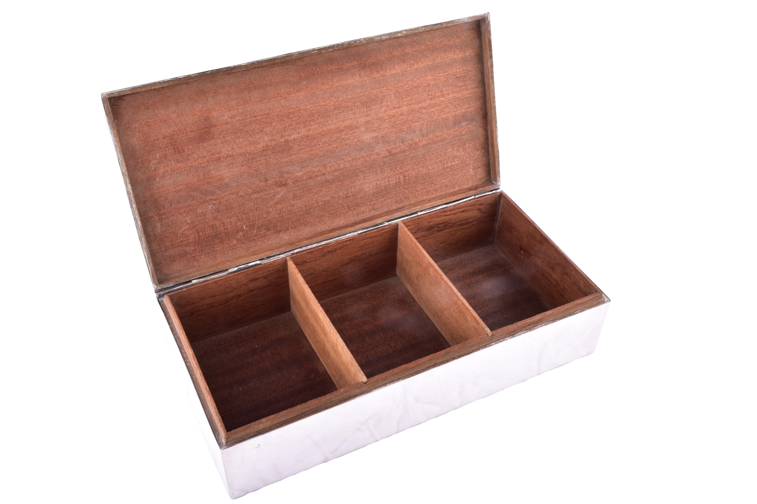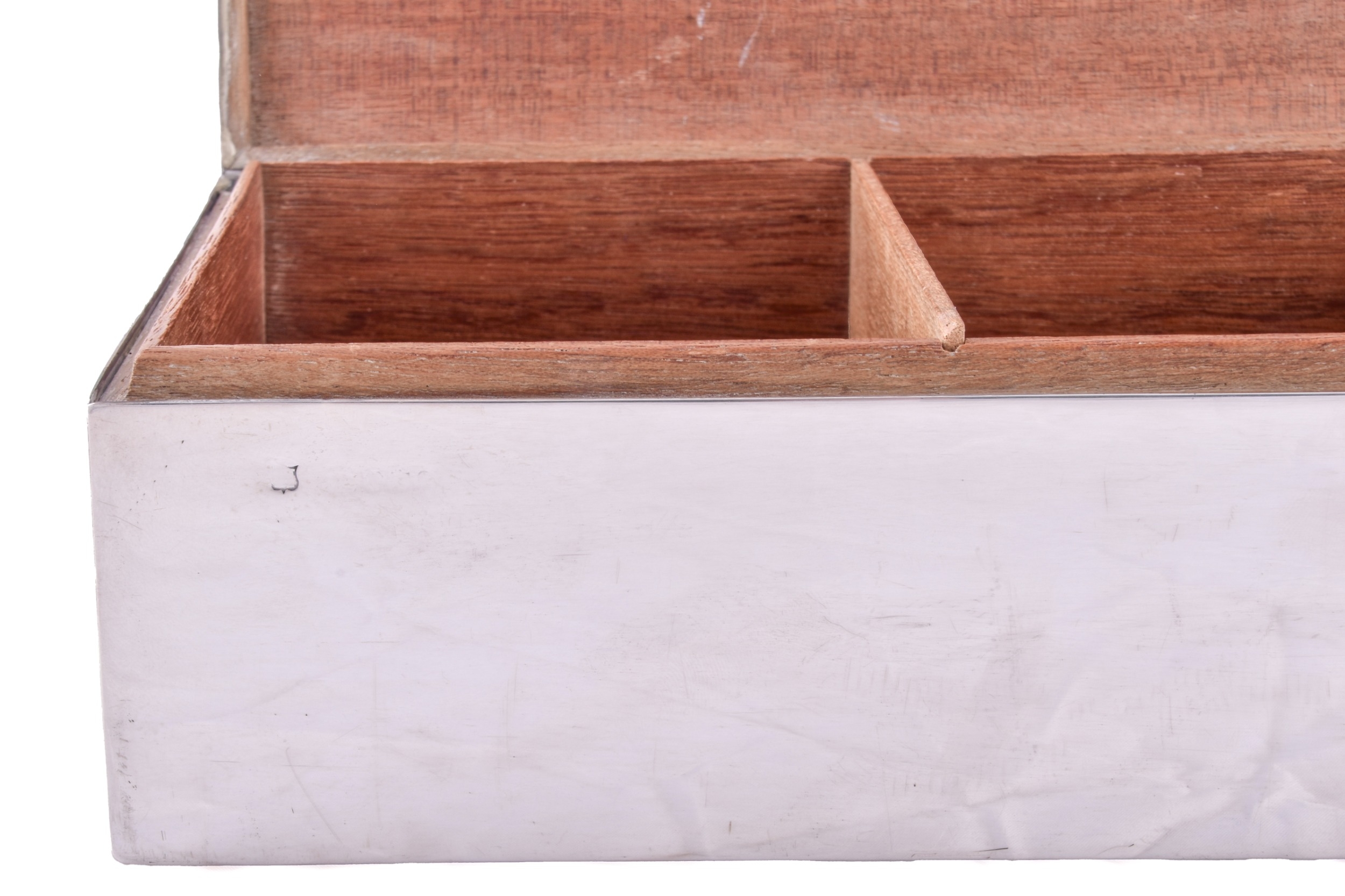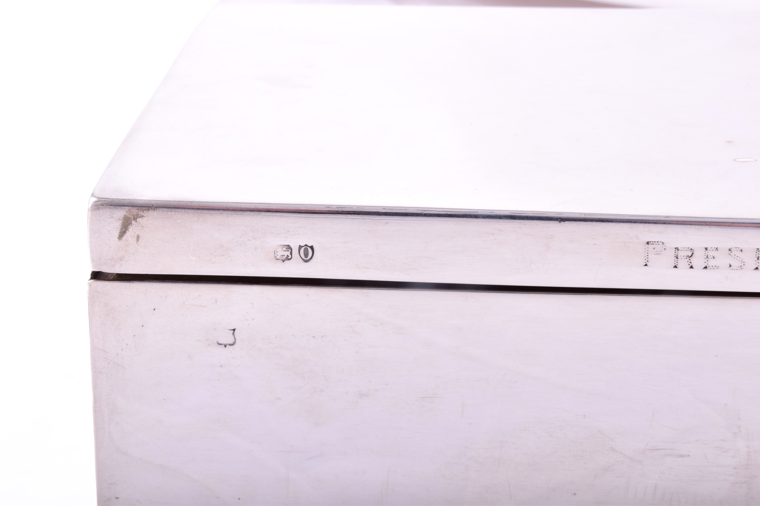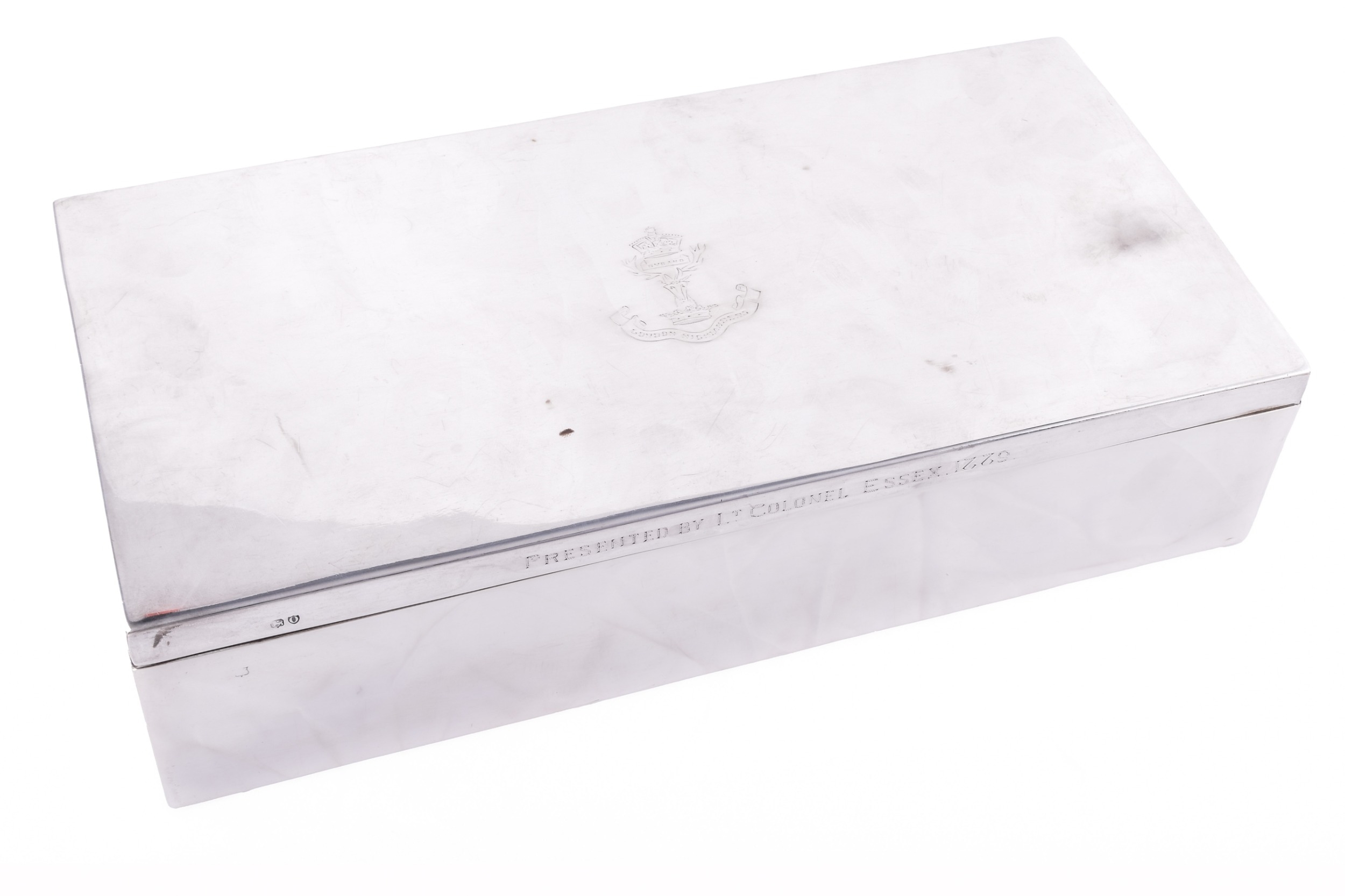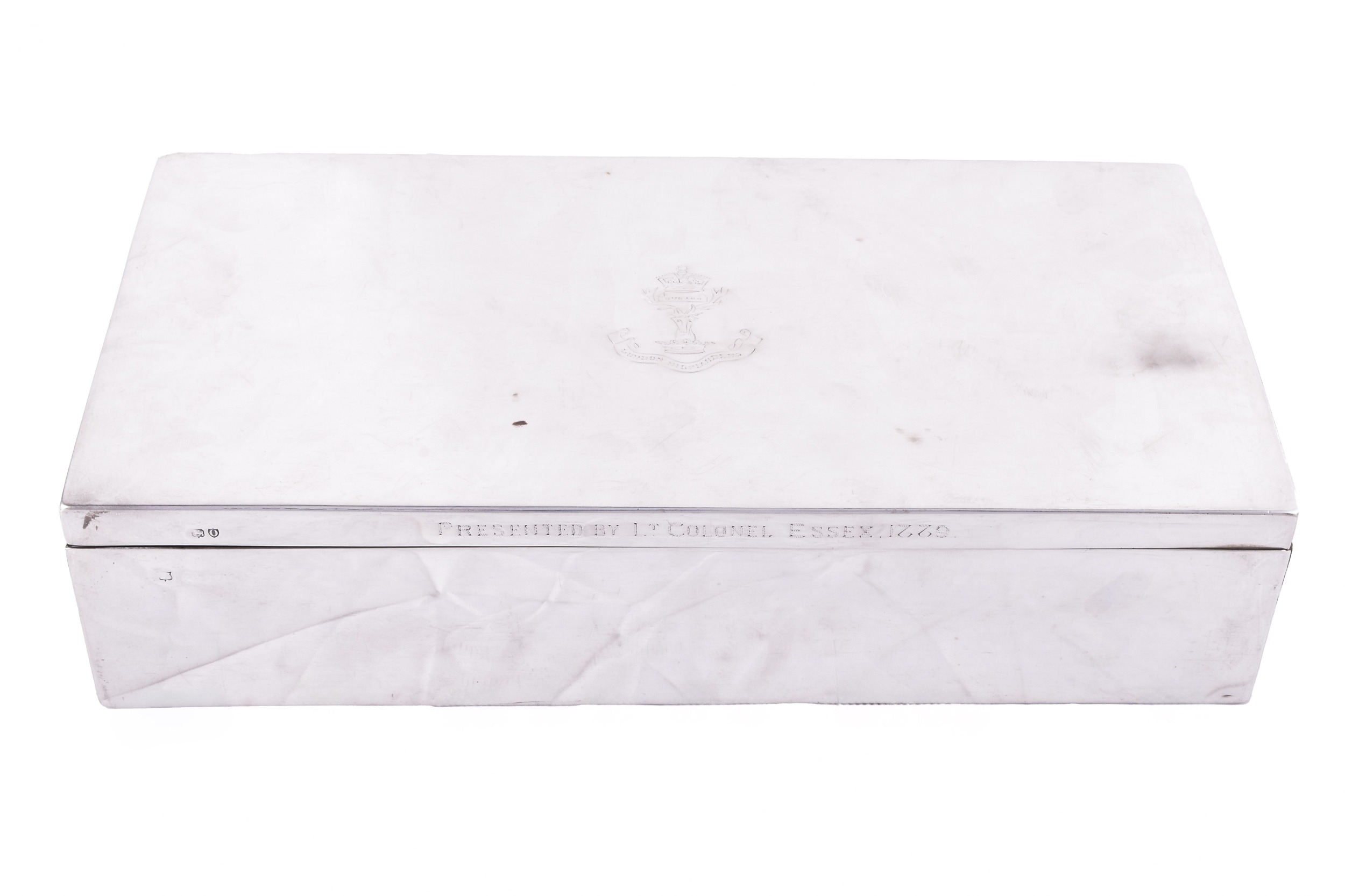A Victorian silver cigar box, engraved to lid with the crest for the London Highlanders regiment, personalised engraving 'Presented by Lt Colonel Essex. 1339' worn hallmarks possibly for London 1889, 31.5 x 15.5 cm.