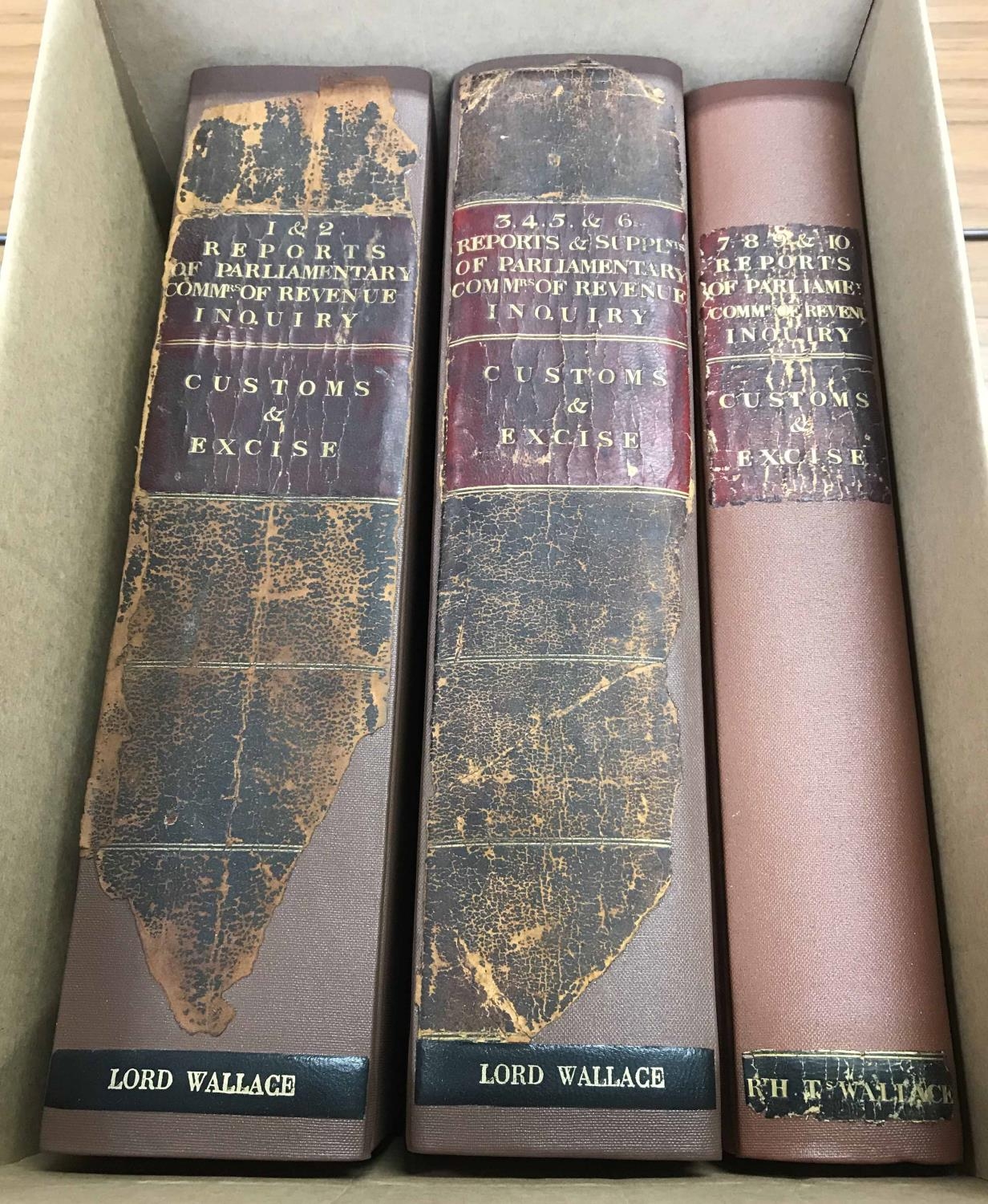 REPORTS OF PARLIAMENTARY COMMISSIONERS OF REVENUE INQUIRY: 3 vols. containing the 1st to 10th reports (1822-24) regarding the "Collection and Management of the Revenue Arising in Ireland". All rebound and in excellent condition. Cross Reference: IRISH POSTAL HISTORY