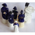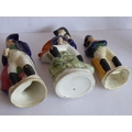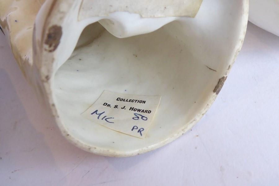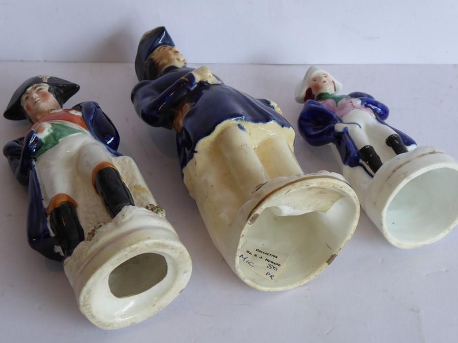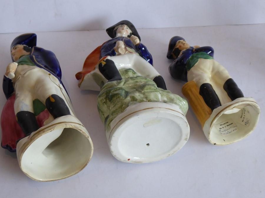 Condition Report: The tallest figure with his right leg on rock work there is a small 1cm firing crack to underside of foot and small hole in rockwork base and item in his hand has been broken at the top. The 2nd tallest has two hairline cracks has two hairlines to the right-hand side of the support (6cm and 4cm long) visible, also a small firing crack to the inside. The 3rd tallest figure has some discolouration and has a collector's paper label to the inside 'Dr S J Howard' - it is noted that this is en-suite to one of the other figures in the lot (which is Wellington rather than Napoleon) these make a pair and both have these labels. The Wellington figure also has some discolouration at the base. The figure with the lot number attached appears in good order although the underside of the base exhibits a hole which may (but probably not) have been there during the manufacture. The smallest figure although dirty appears in good general condition.
