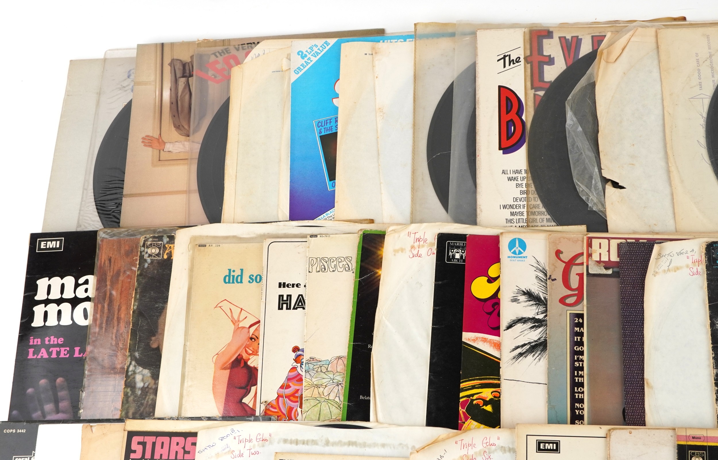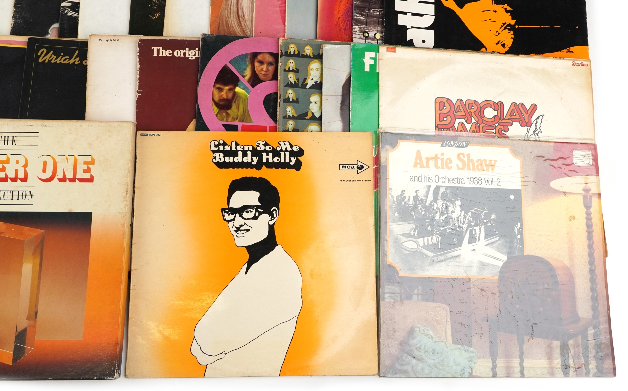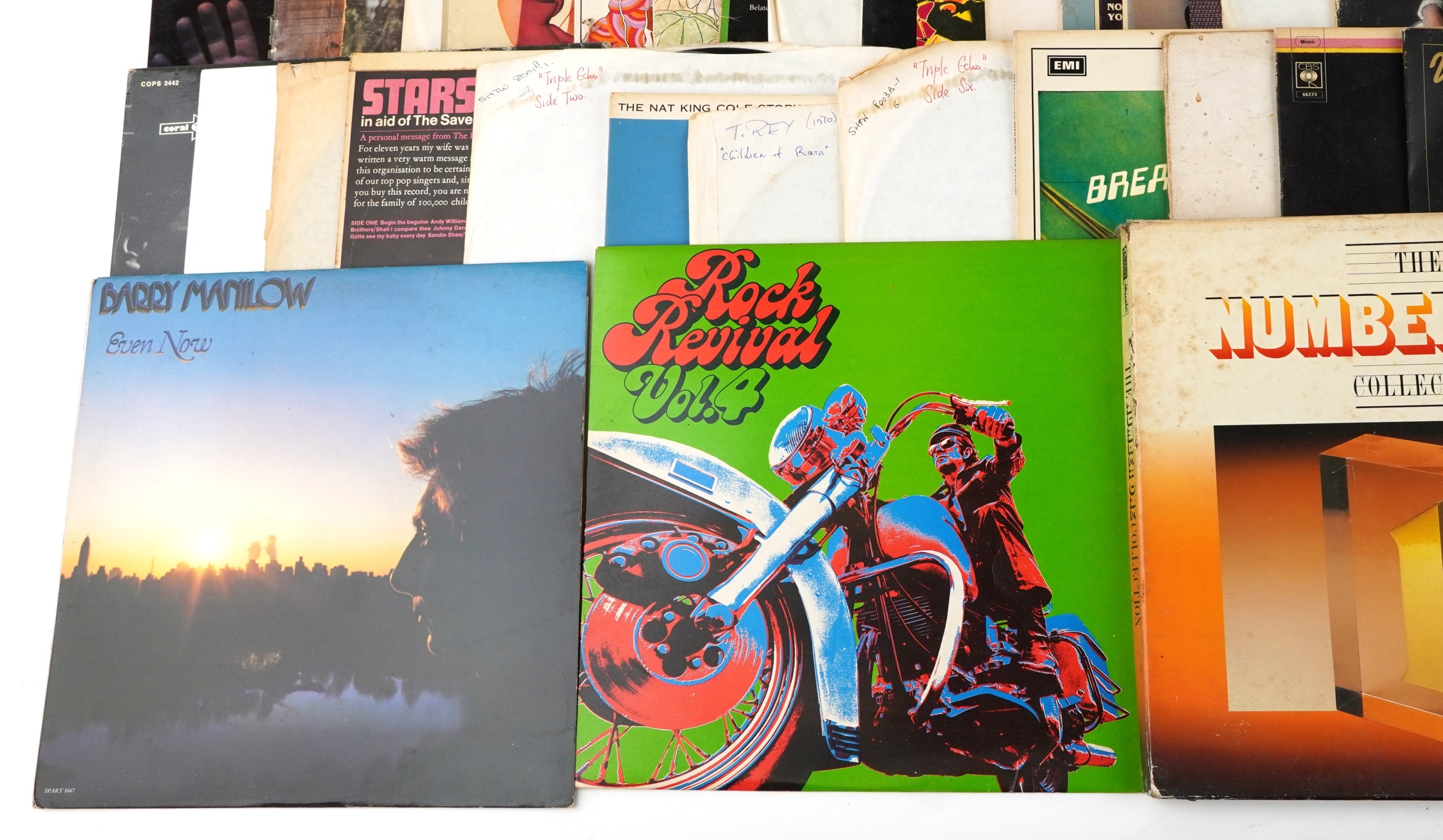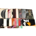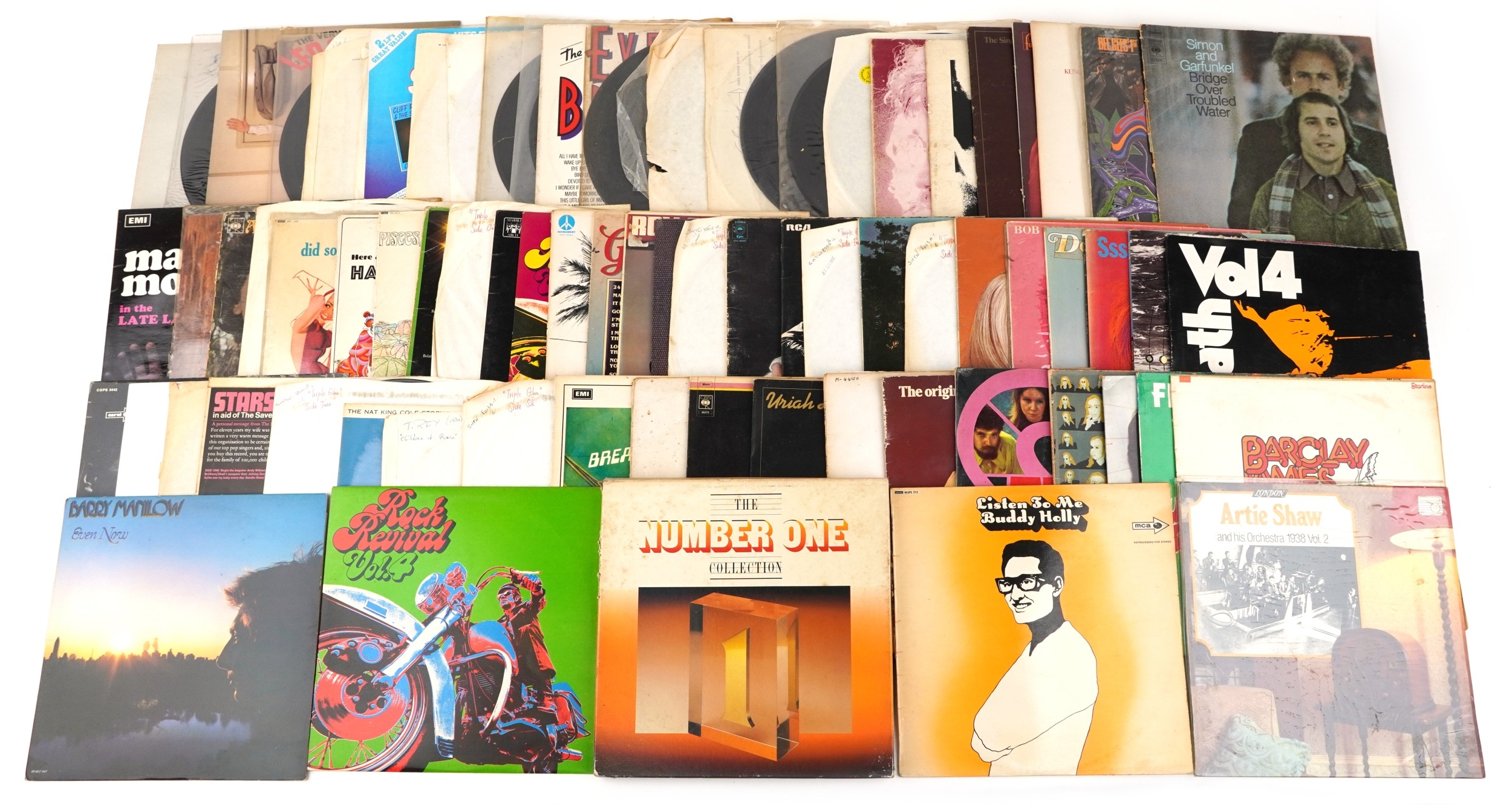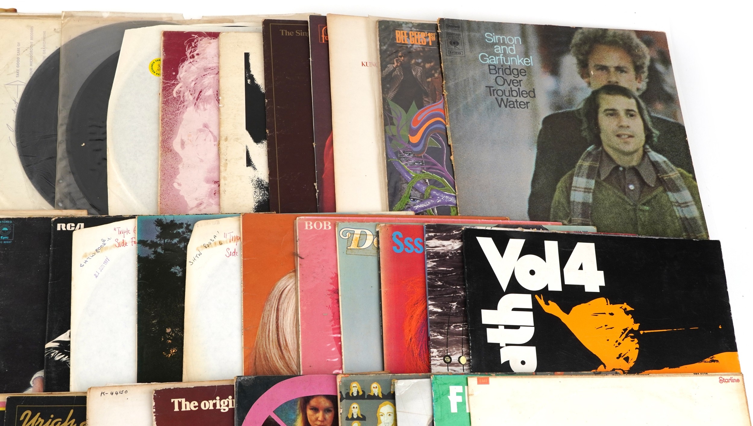 A collection of vinyl LP records including Brian Eno Before & After Science, Marillion Season's End, Black Sabbath Volume 4 and Simon & Garfunkel Bridge Over Troubled Water.