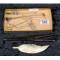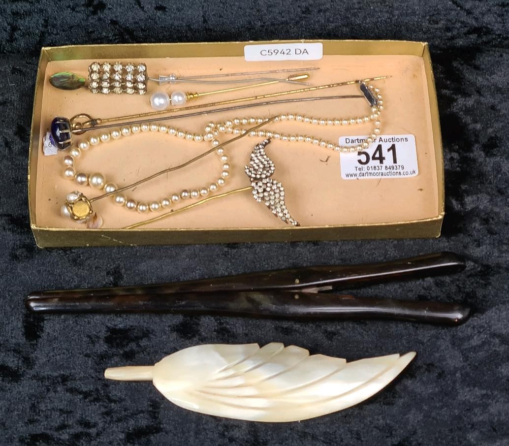 Box of antique hat pins including an abalone shell and a blue glass claw set stone, a faux pearl necklace, glove stretcher and horn hair ornament.