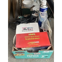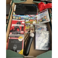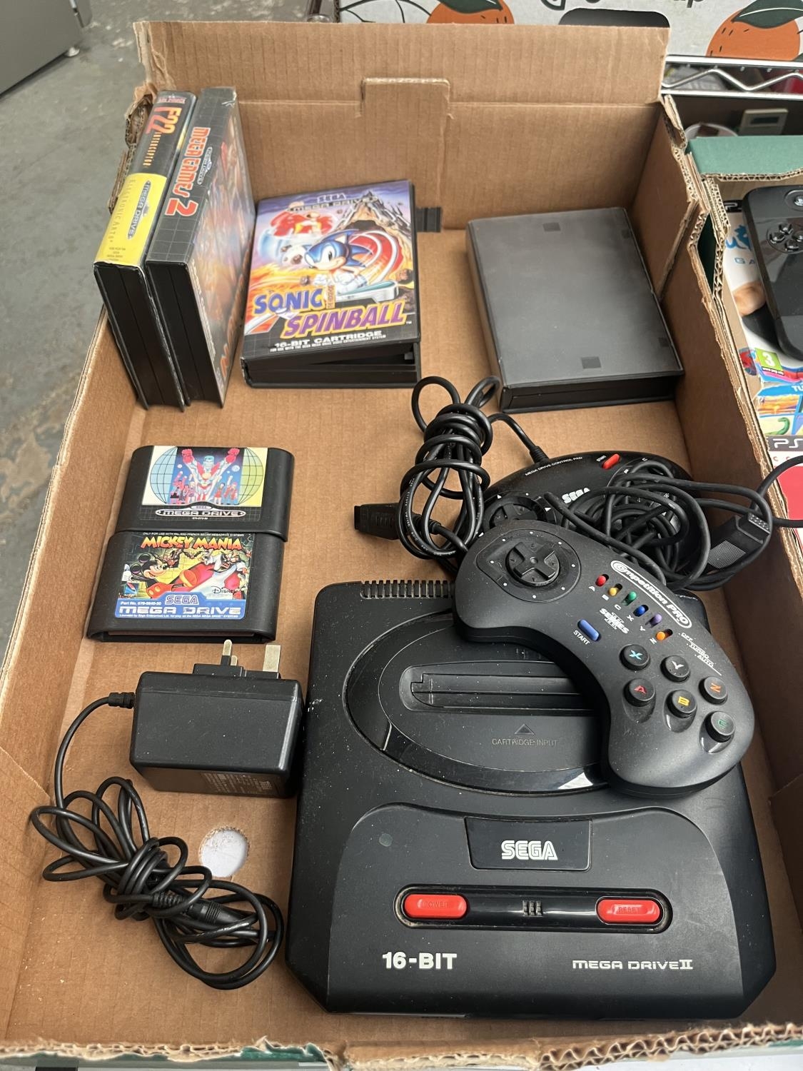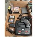 Box containing a Sega Mega Drive, controllers and games etc