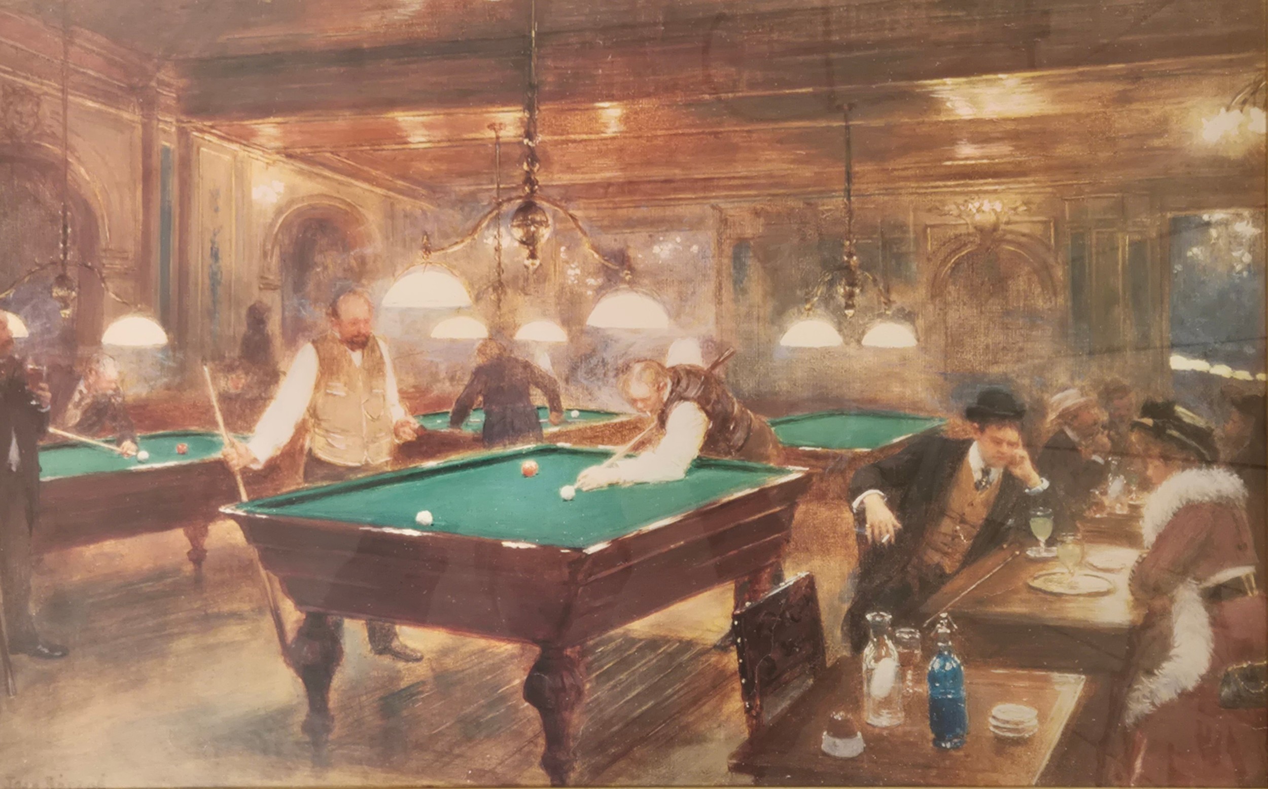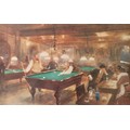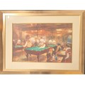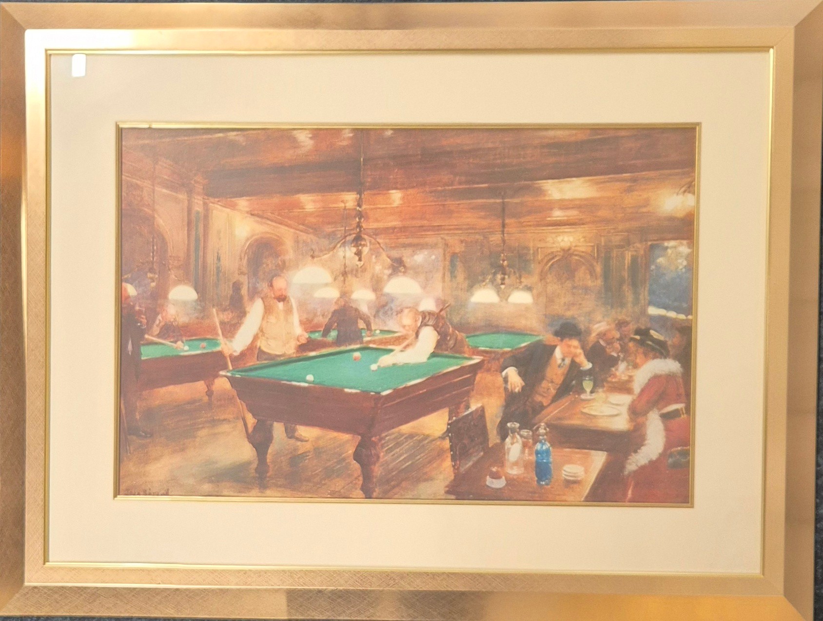 Large Billiard print titled "The Billiard Parlour". Fitted within a contemporary gilt frame. Artwork- 44x69cm. From the private collection of Preston House.