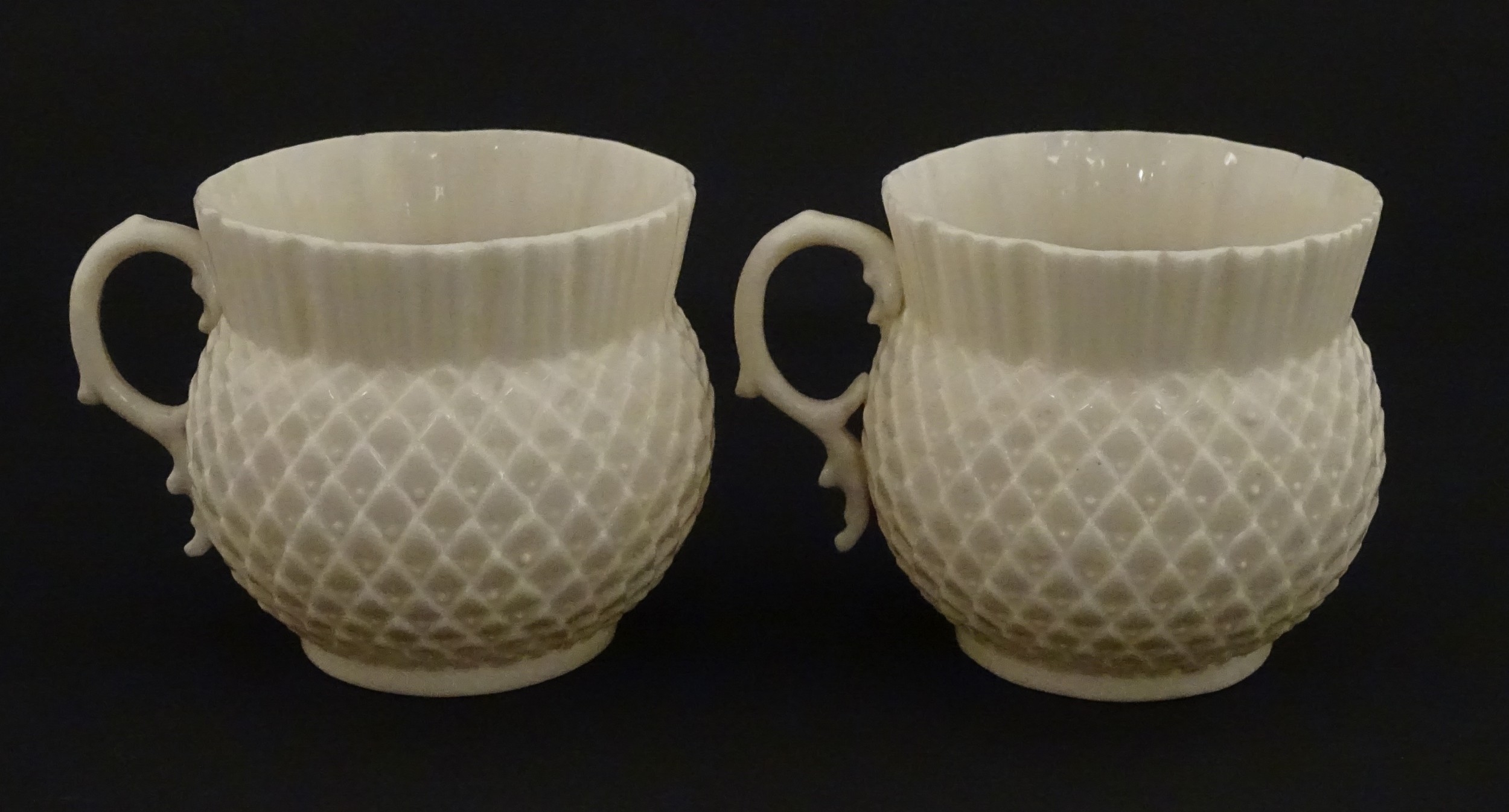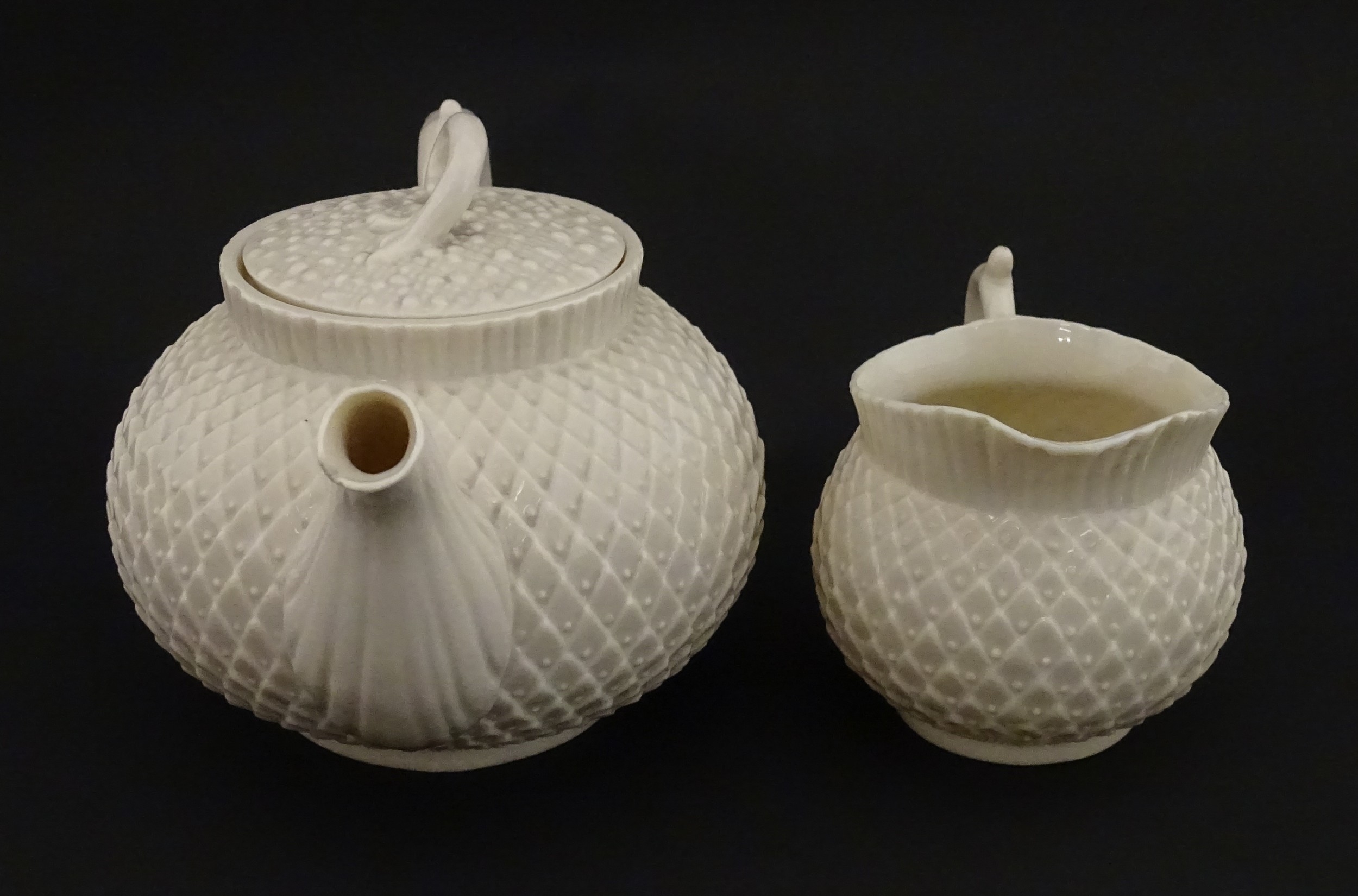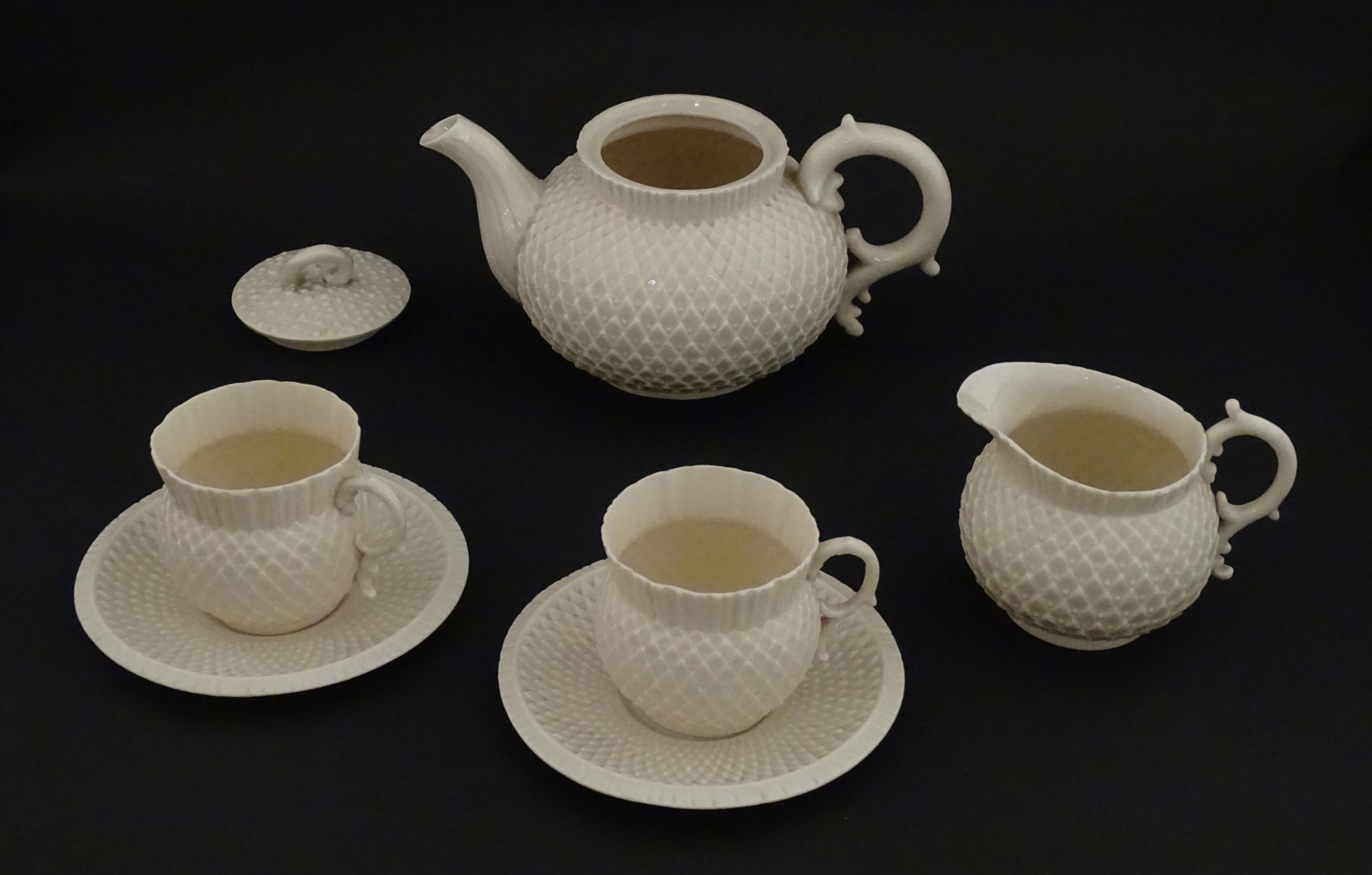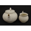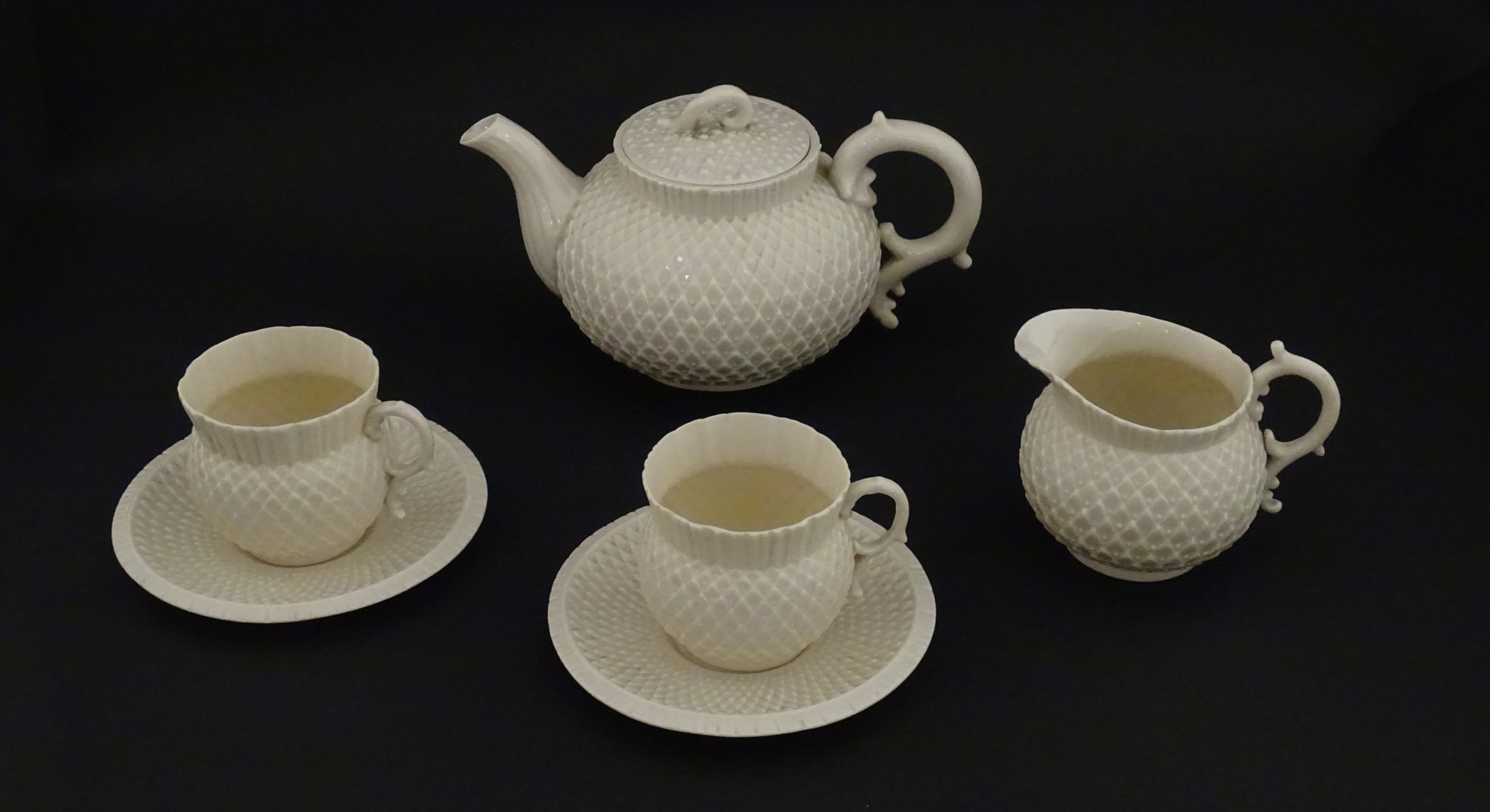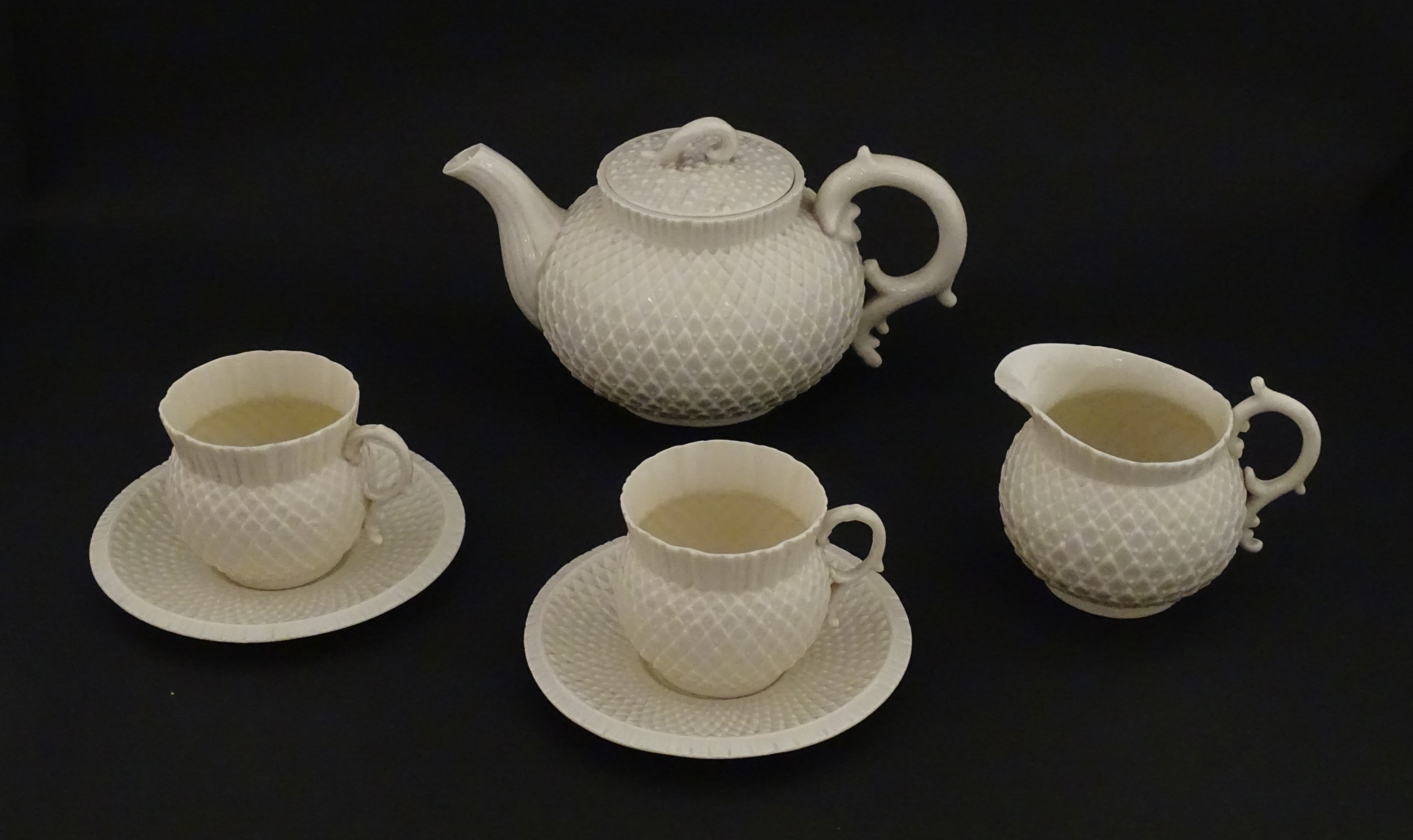 Belleek tea wares in the Thistle pattern comprising teapot, milk jug and two cups and saucers. Marked with First Period mark under. Teapot approx. 4 1/2" high (6)