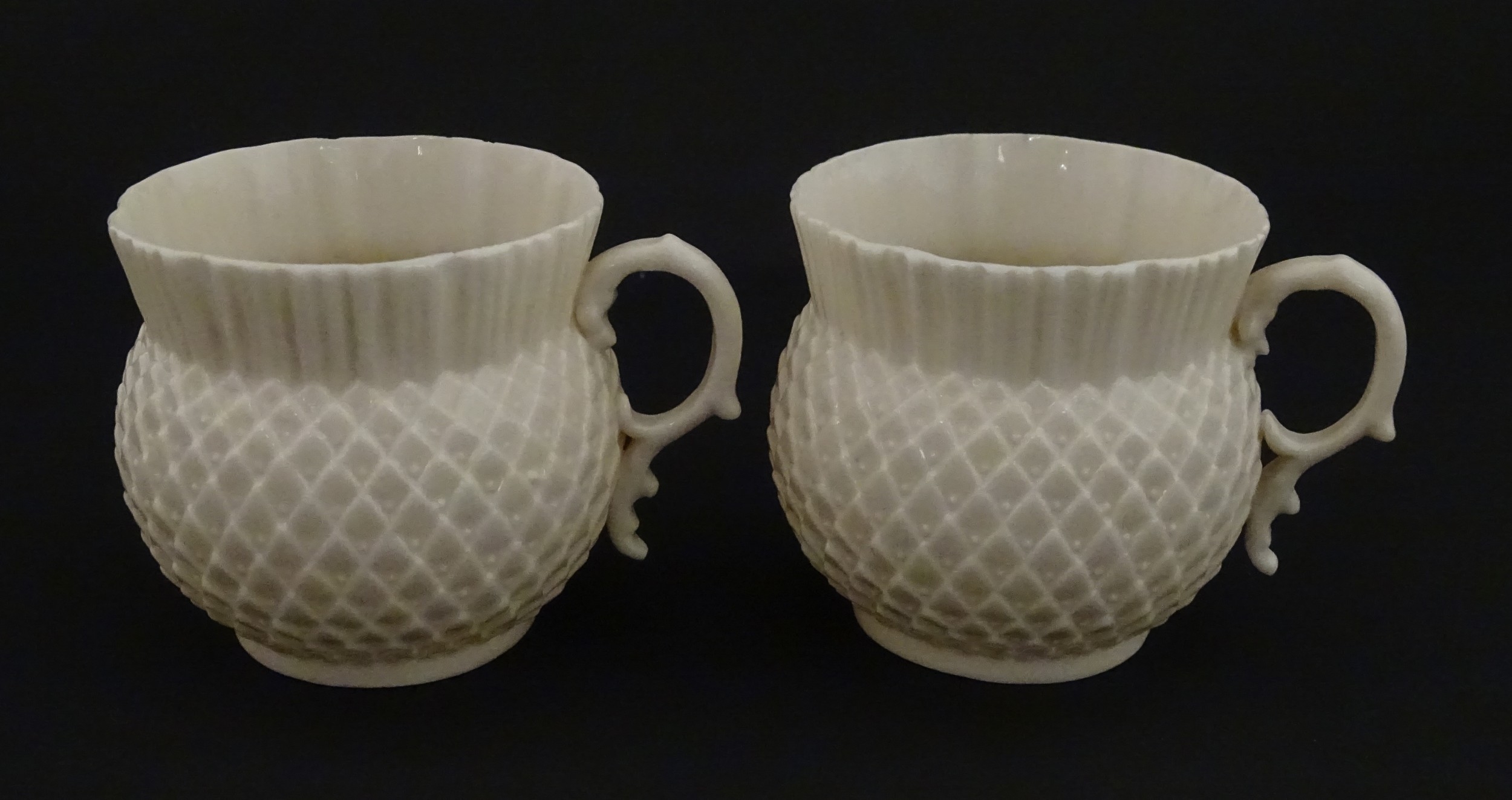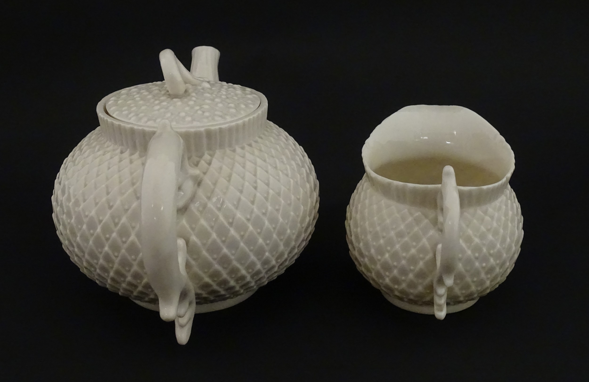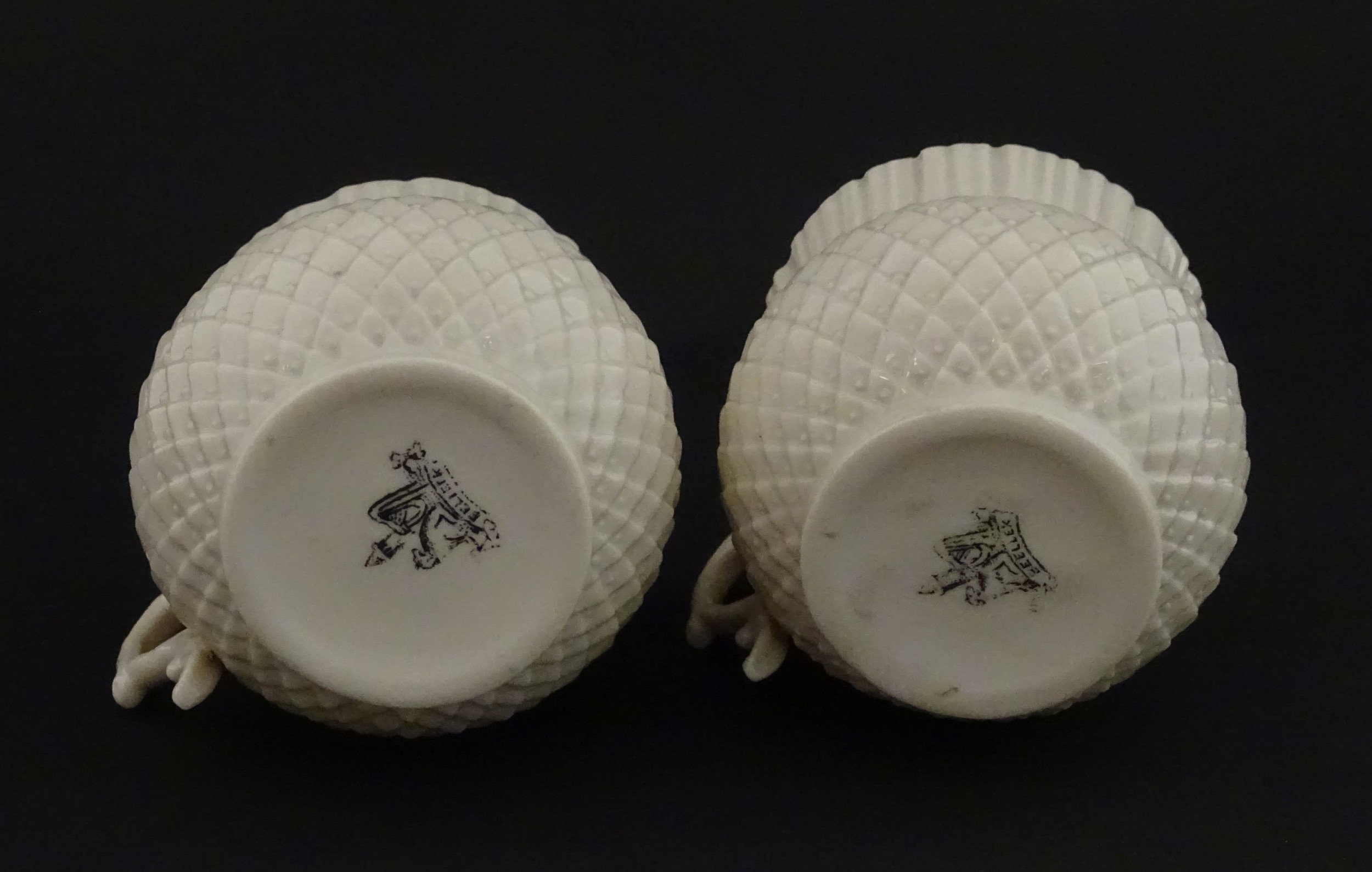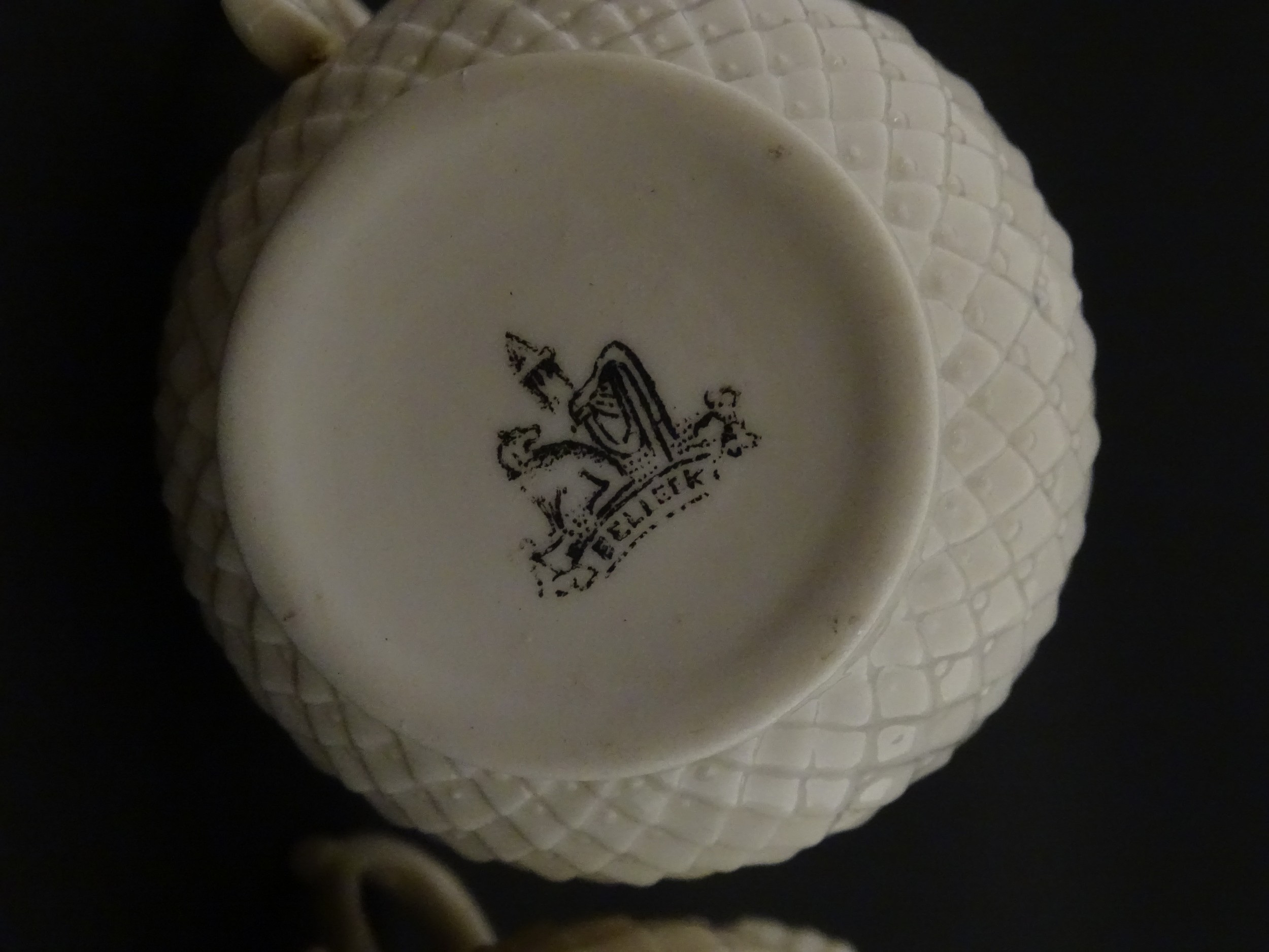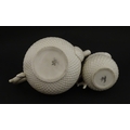 Belleek tea wares in the Thistle pattern comprising teapot, milk jug and two cups and saucers. Marked with First Period mark under. Teapot approx. 4 1/2" high (6)