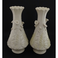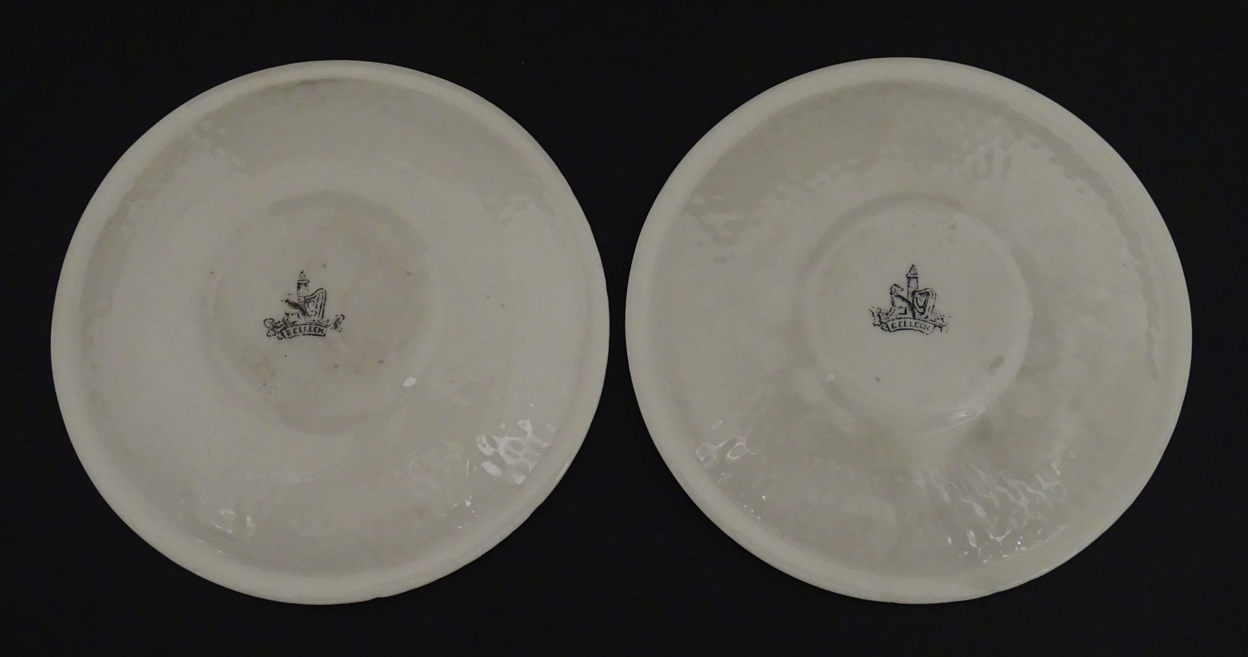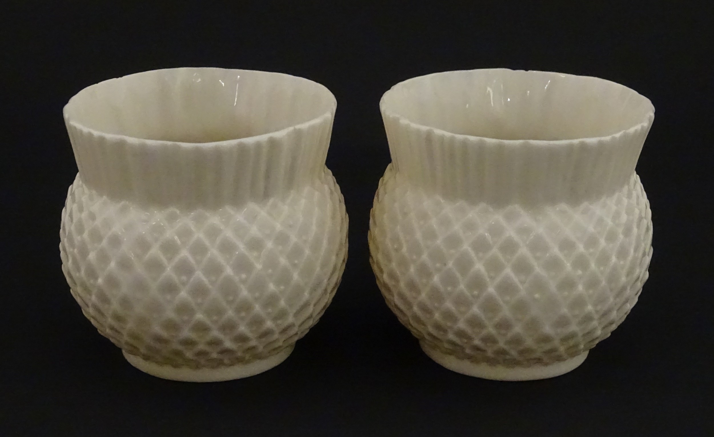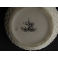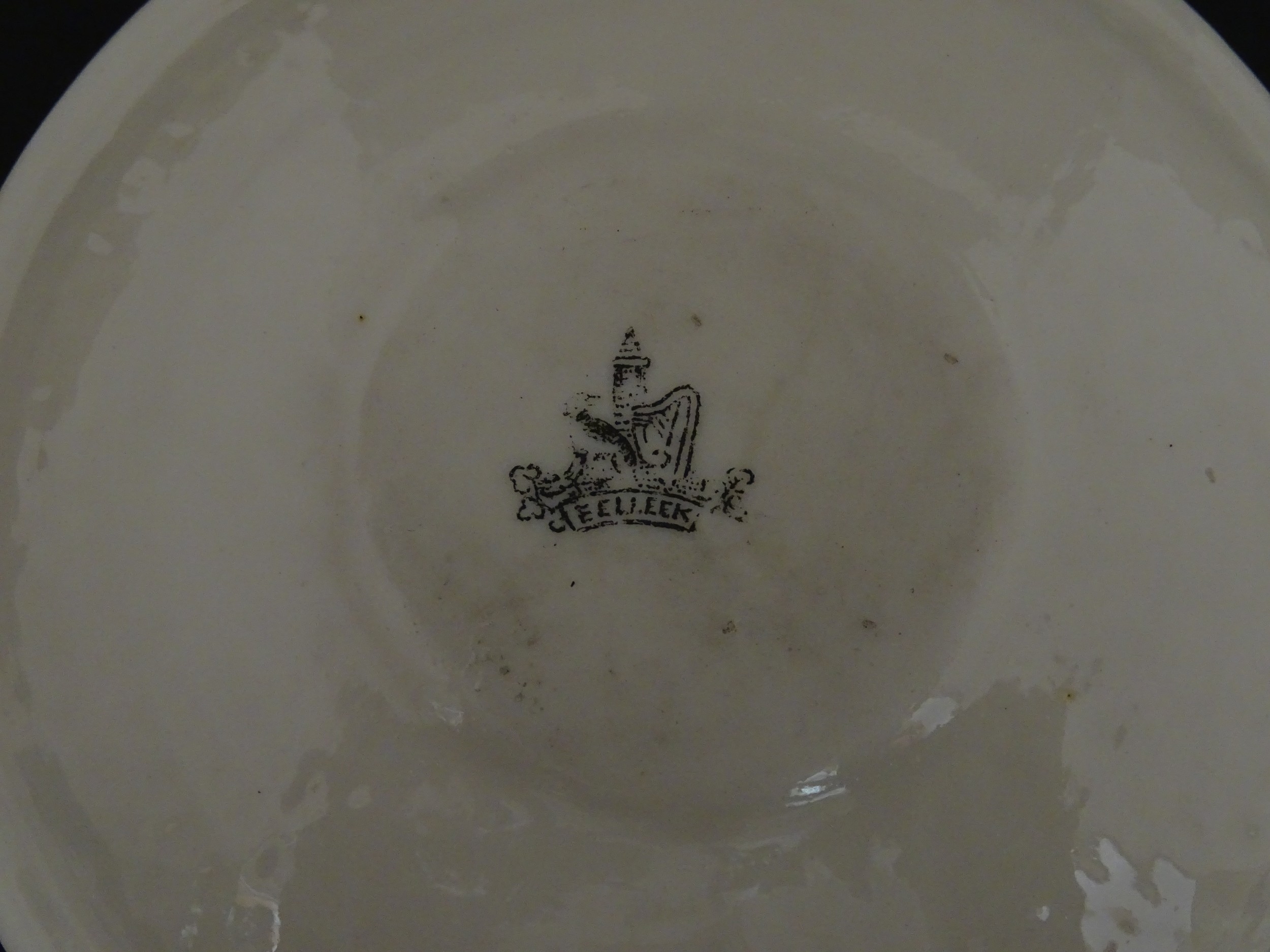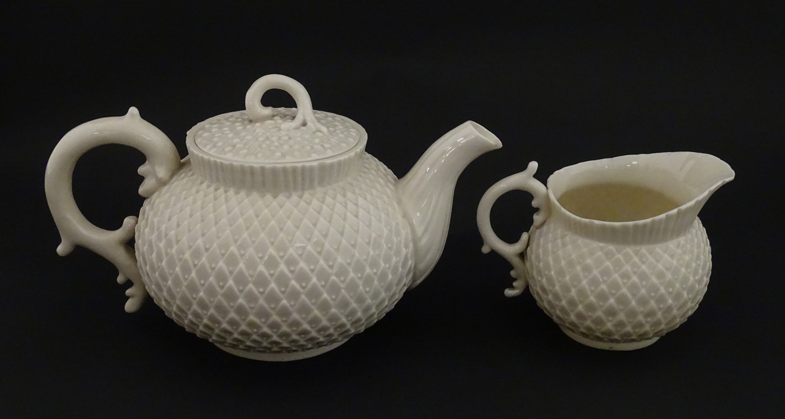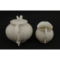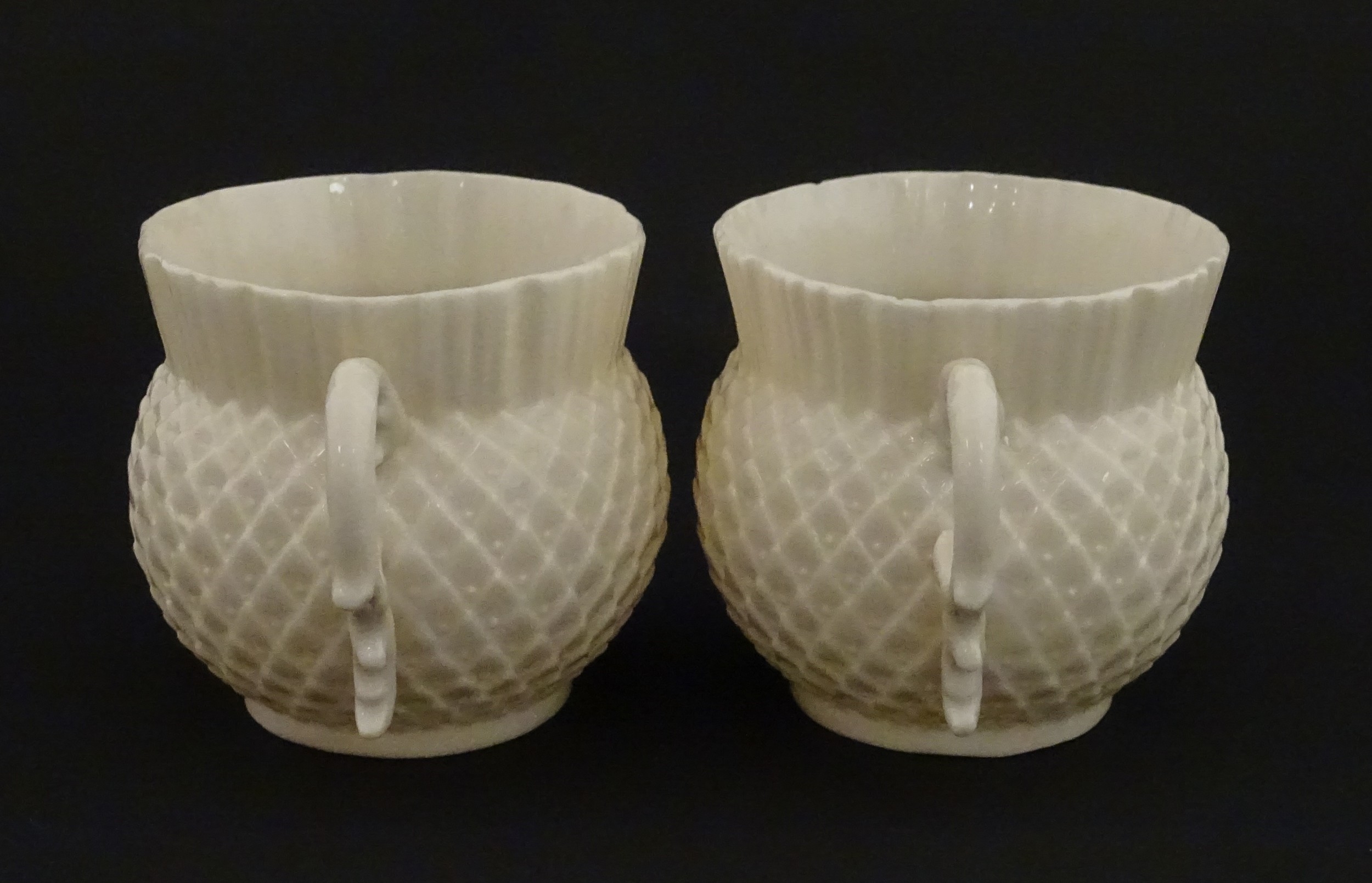 Belleek tea wares in the Thistle pattern comprising teapot, milk jug and two cups and saucers. Marked with First Period mark under. Teapot approx. 4 1/2" high (6)