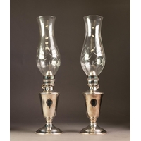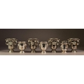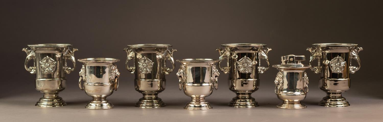 PAIR OF VINERS ELECTROPLATED TWO HANDLED URN SHAPED MATCH RECEIVERS, together with a SIMILAR SET OF FOUR SPILL HOLDERS, and a SIMILAR TABLE CIGARETTE LIGHTER, 3 ¾” (9.5cm) high and smaller, (7)