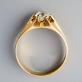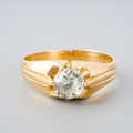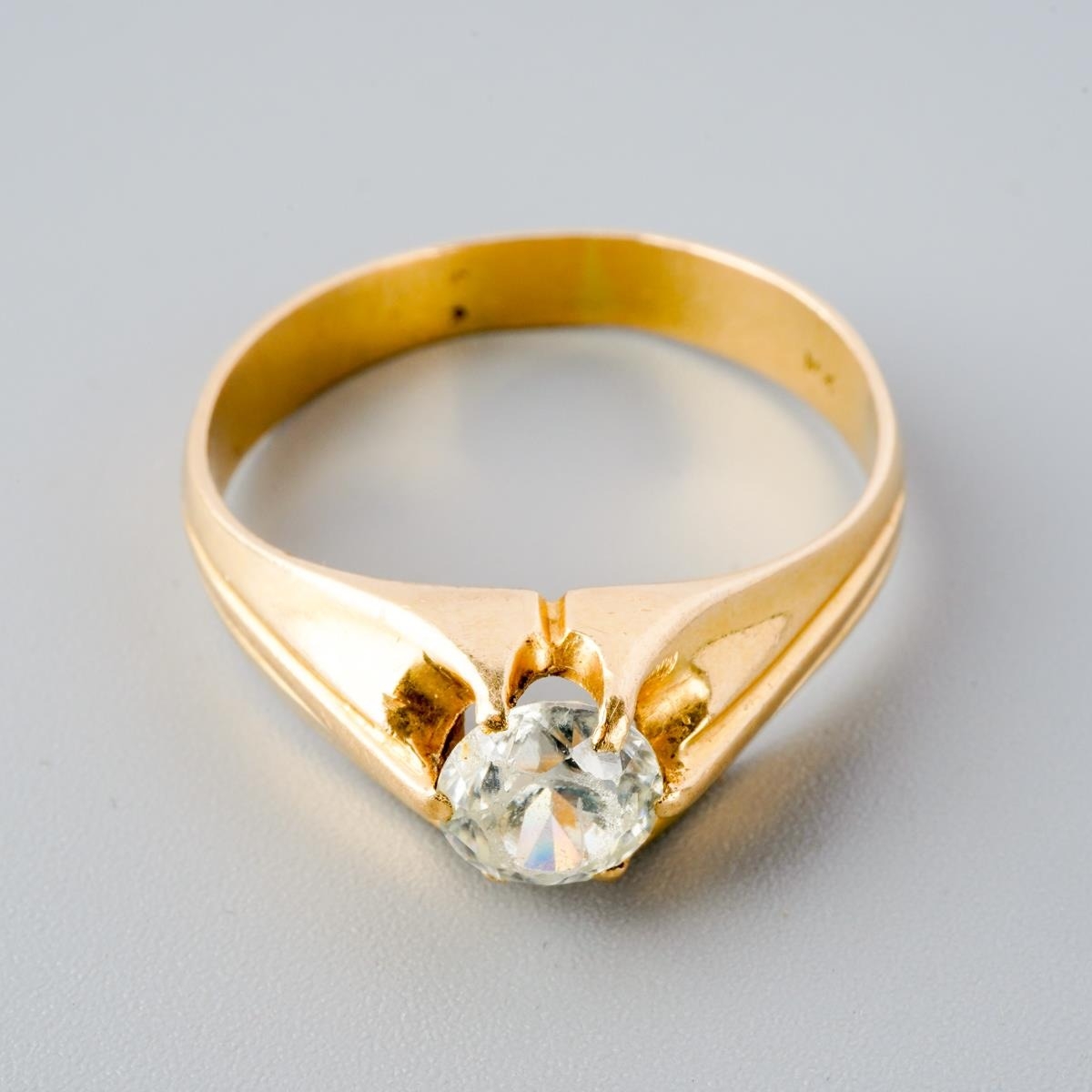 A synthetic moissanite single stone ring. The synthetic moissanite, within an extended claw setting, to the plain band, ring unmarked, assessed as 9ct gold, ring approx ring size Z, approx gross weight 6.95 grams.