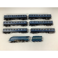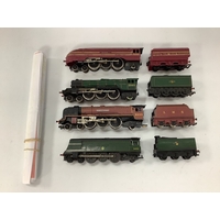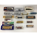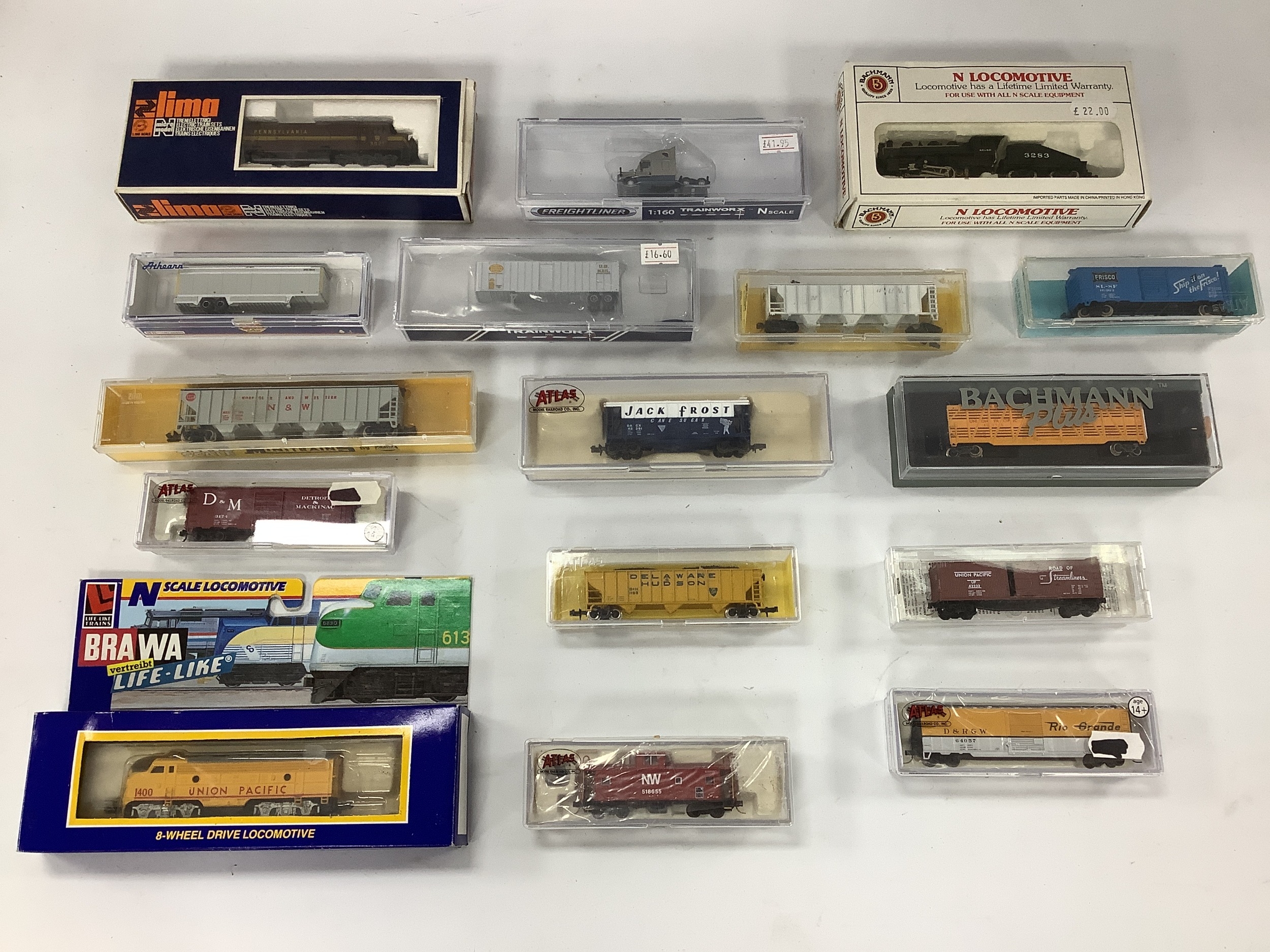A collection of boxed American N gauge, comprising: a Bachmann Santa Fe 0-6-0 switcher; a Life-Like (Brawa) Union Pacific F7A; a Lima Pennsylvania RR FP-45; with ten boxed wagons by Atlas and others, and a Trainwork lorry tractor unit with two trailers.