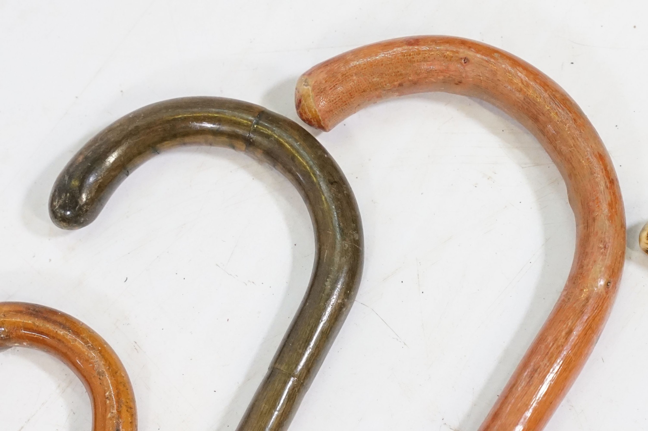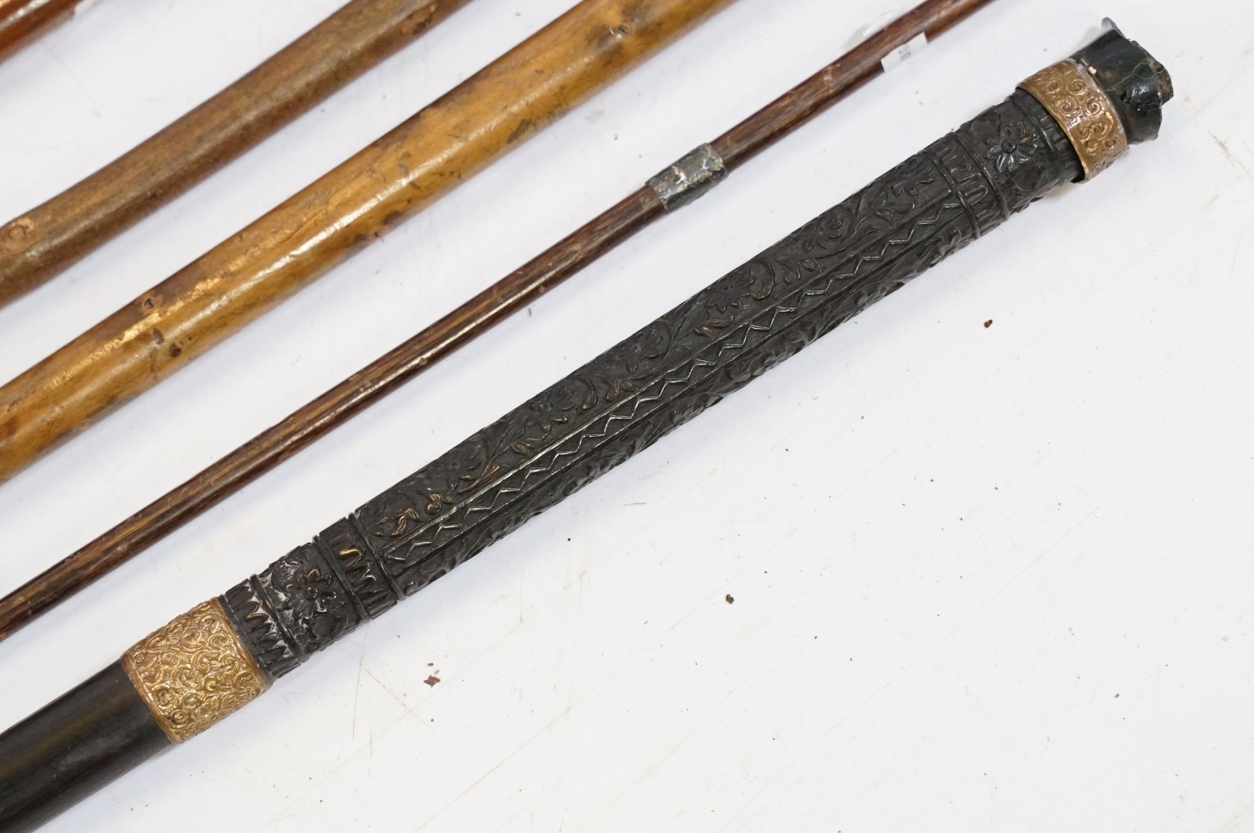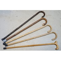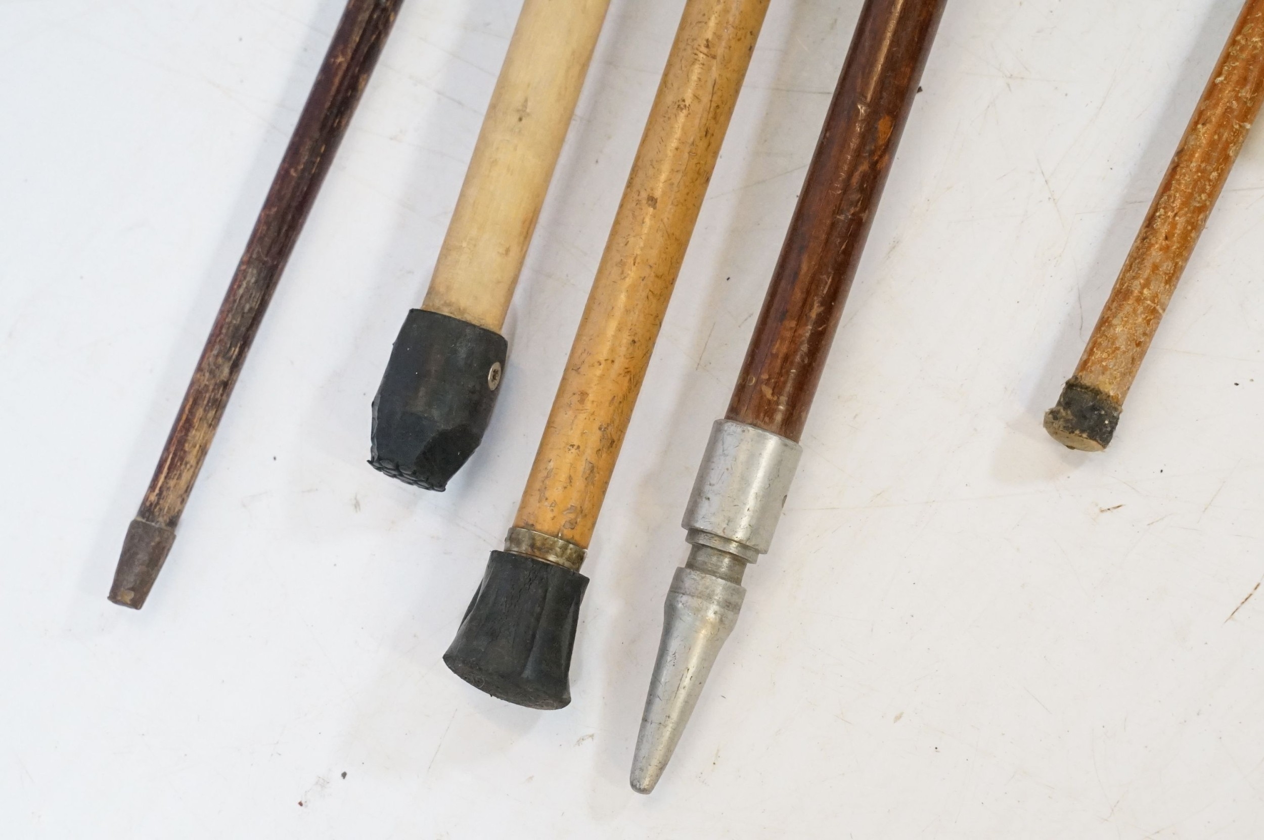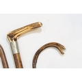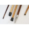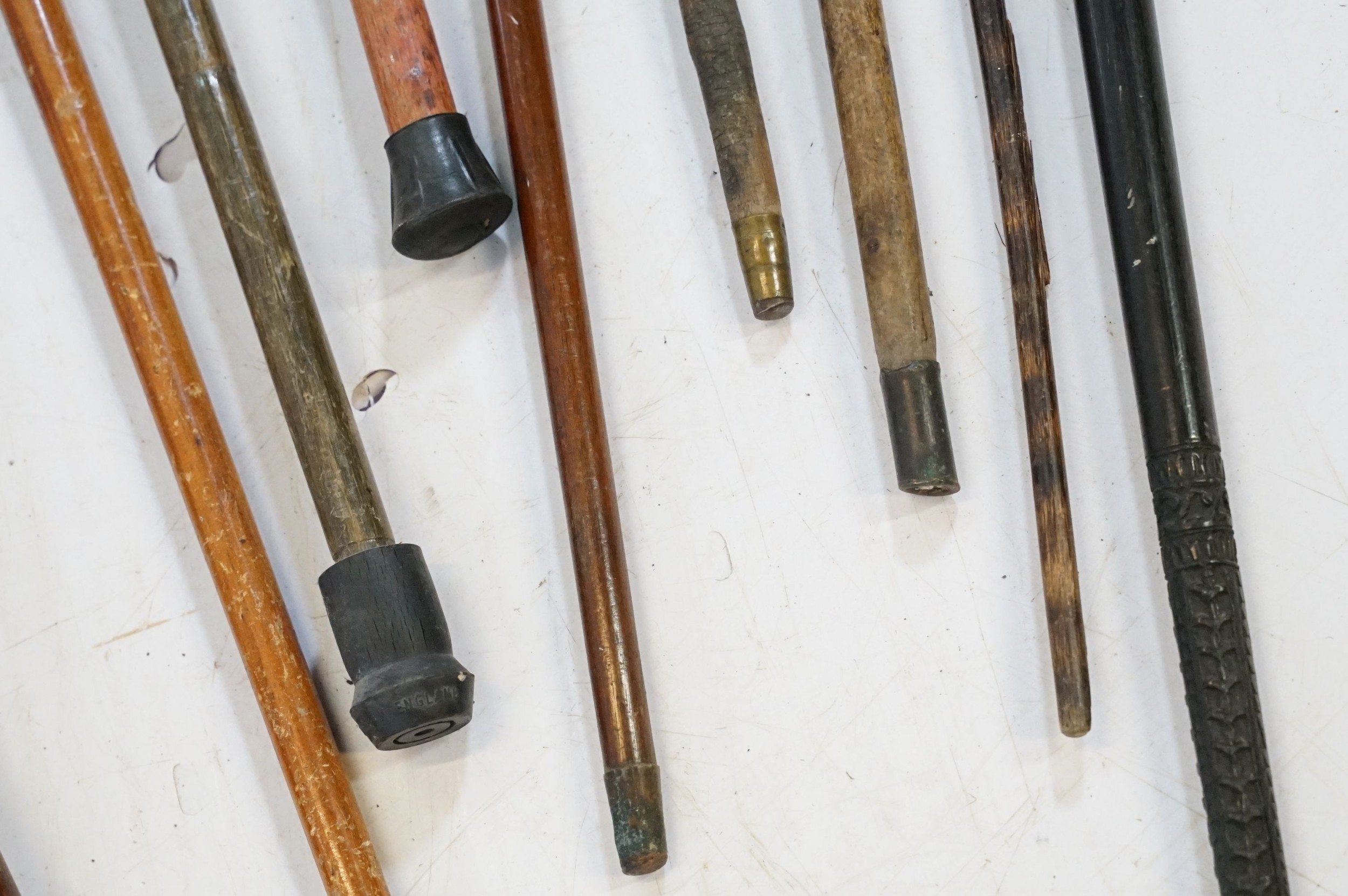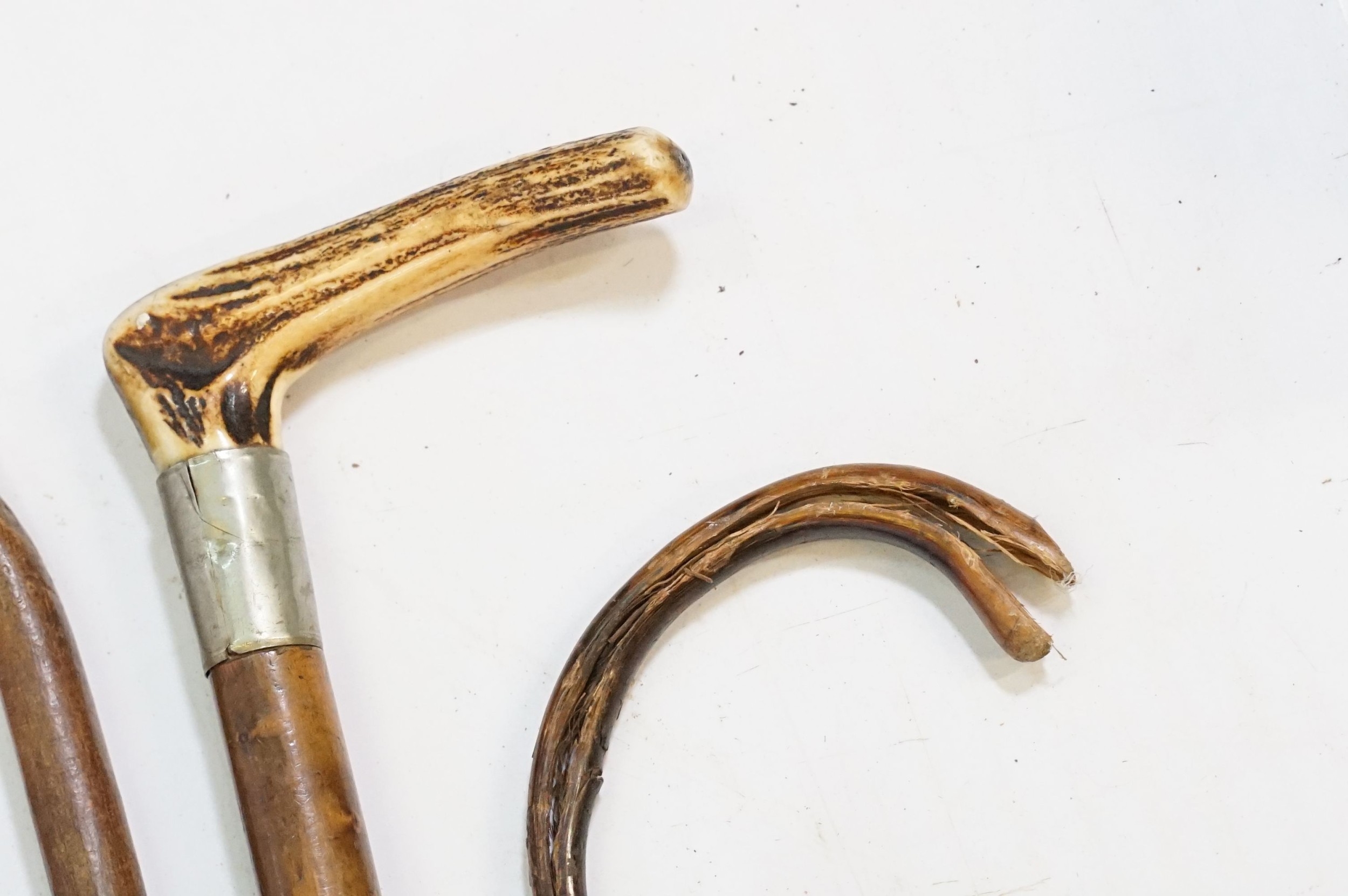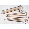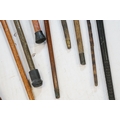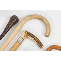 Collection of antique and later walking sticks, comprising two with silver collar and antler handle, two cane examples, a shooting stick, etc. (12)