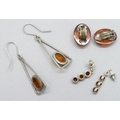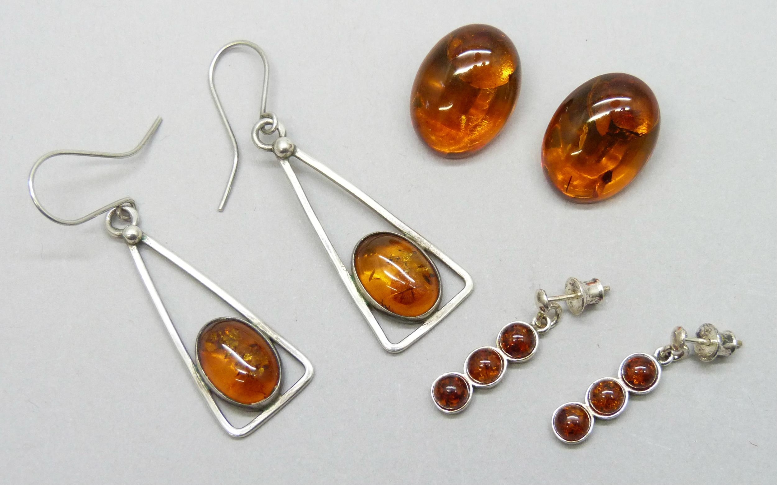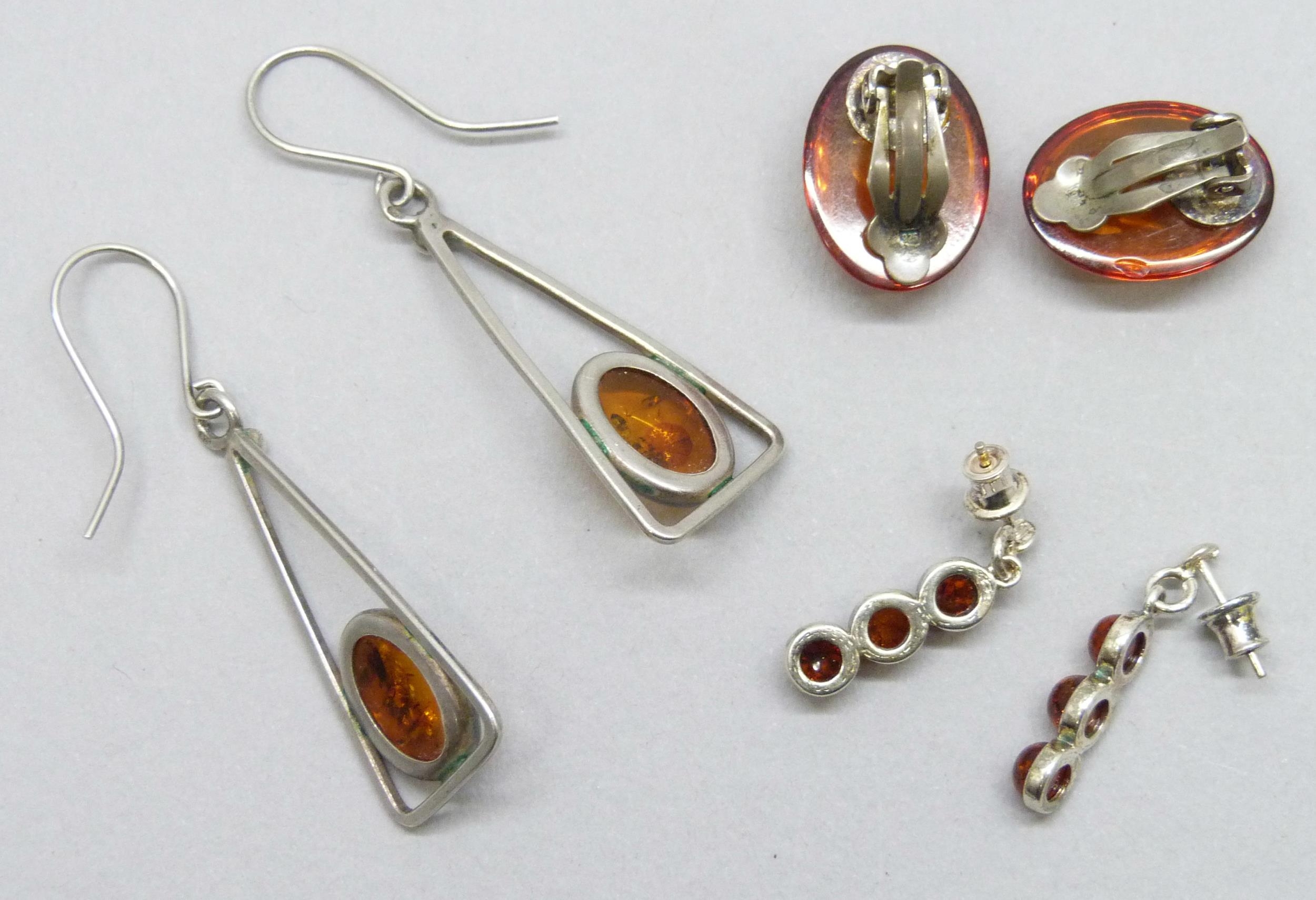 Three pairs of silver and Baltic amber earrings including drop earrings, largest 5cm including hooks