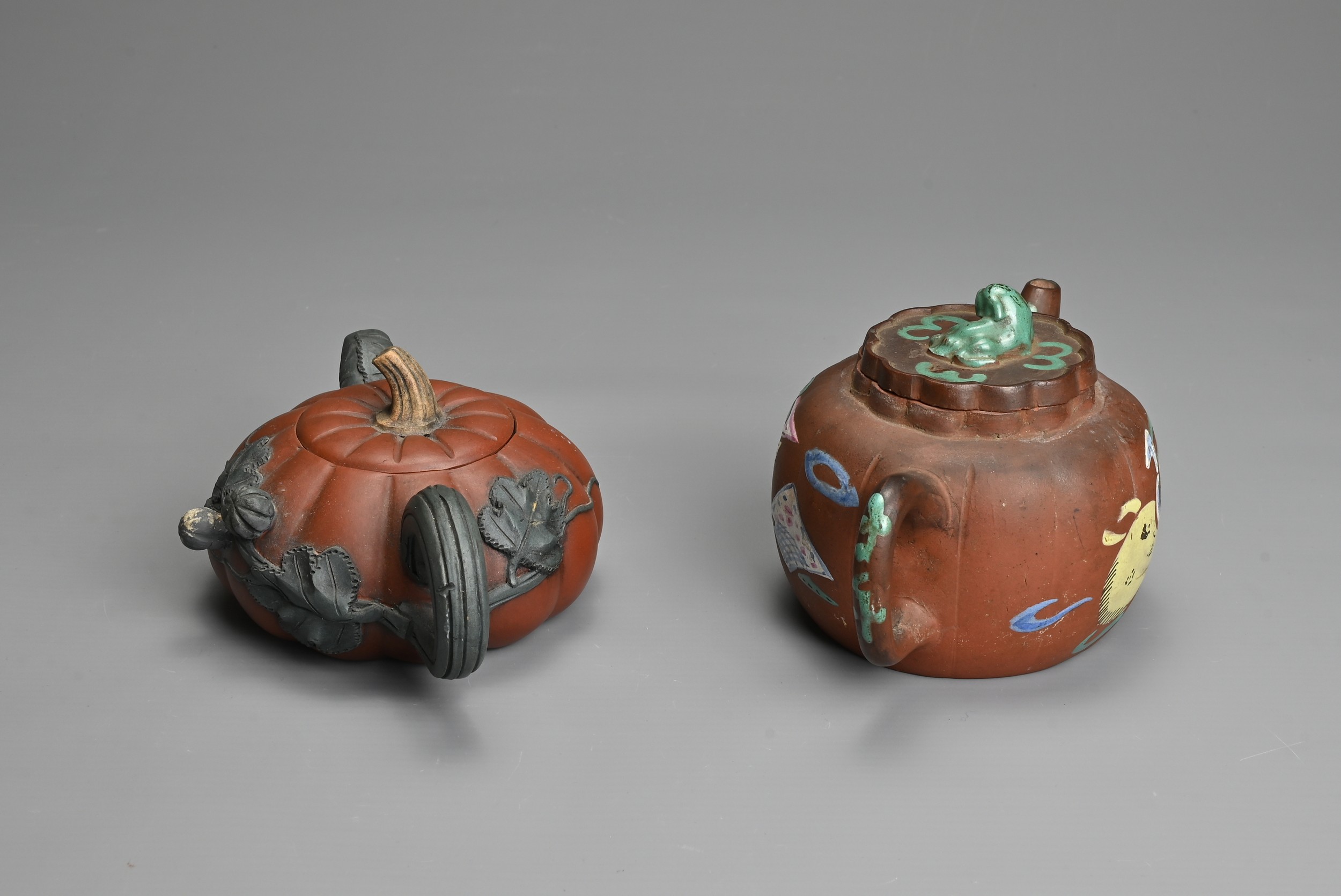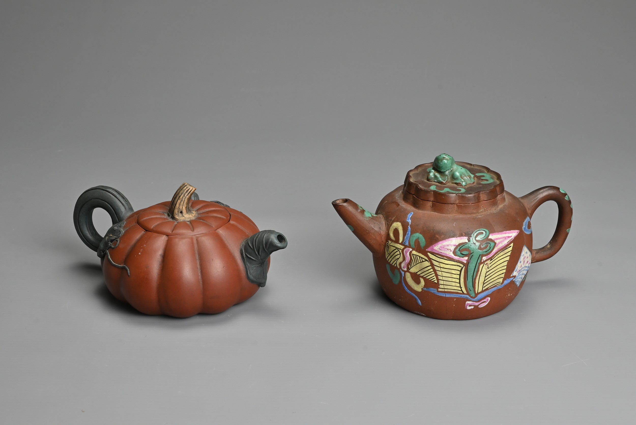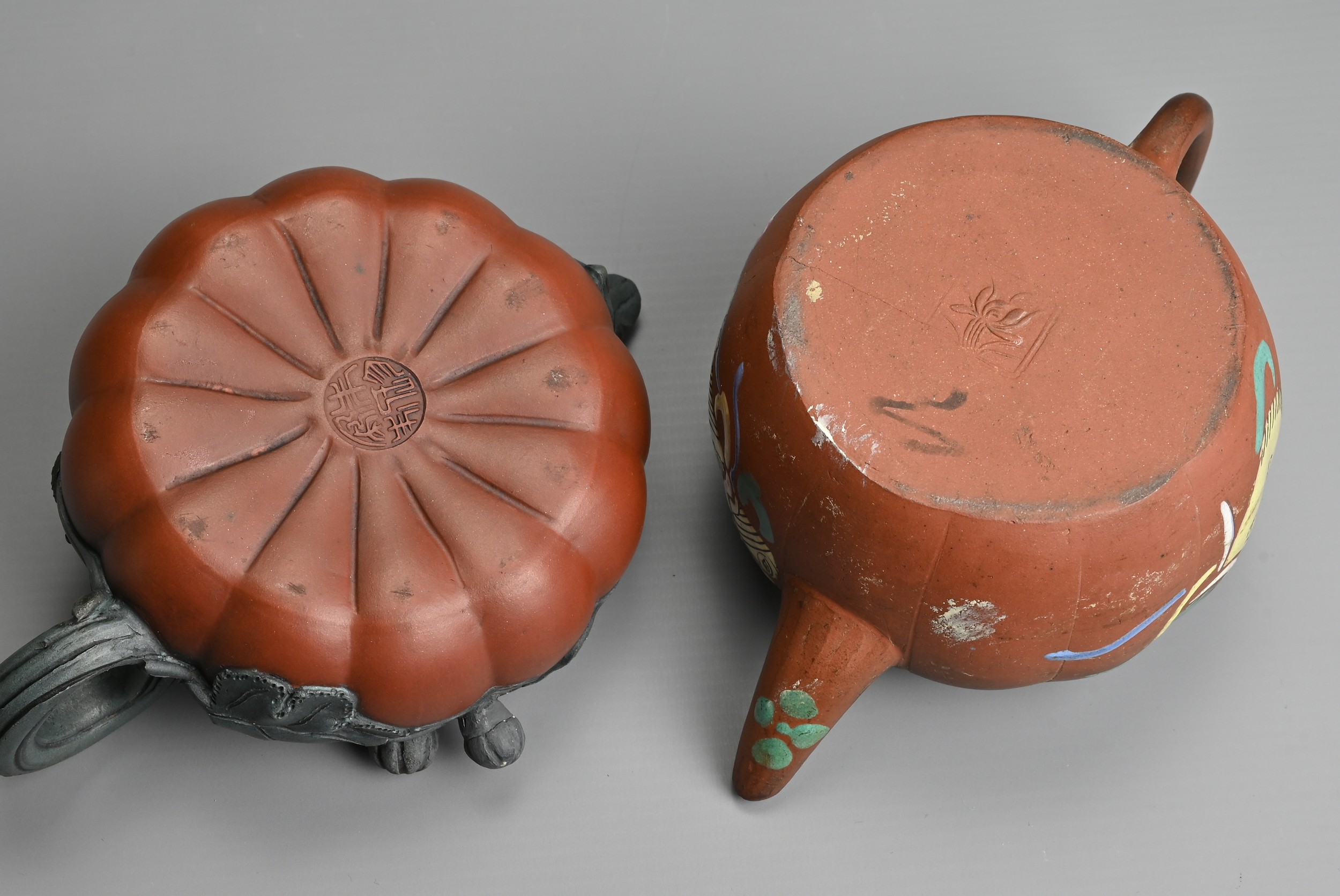 TWO CHINESE YIXING POTTERY TEA POTS, EARLY 20TH CENTURY. A rounded tea pot decorated with green, yellow and blue enamels surmounted by a lion dog; Together with a melon shaped teapot. Both with makers marks to base. Approx. 17cm length. (2)
