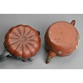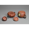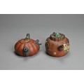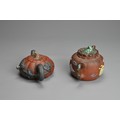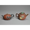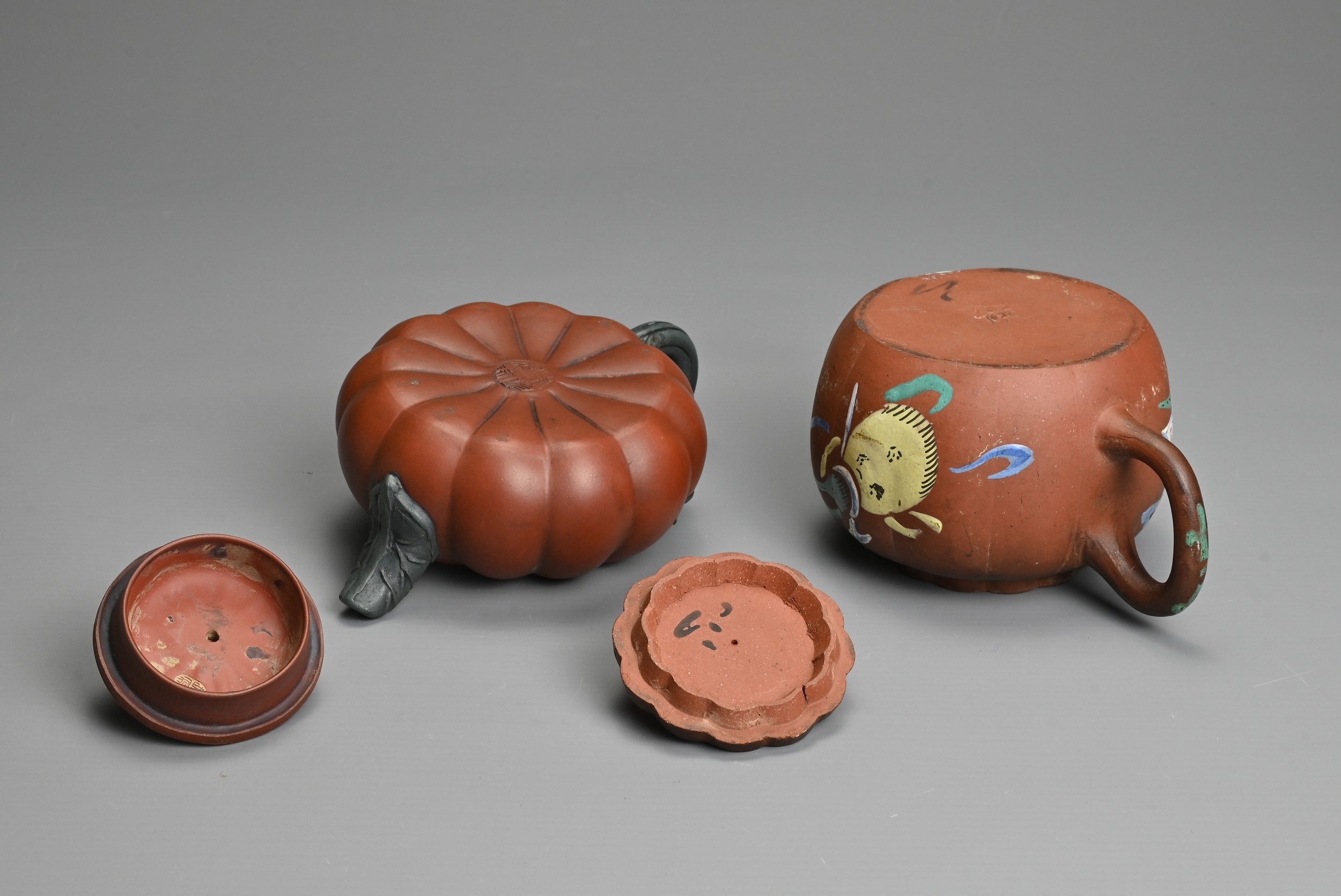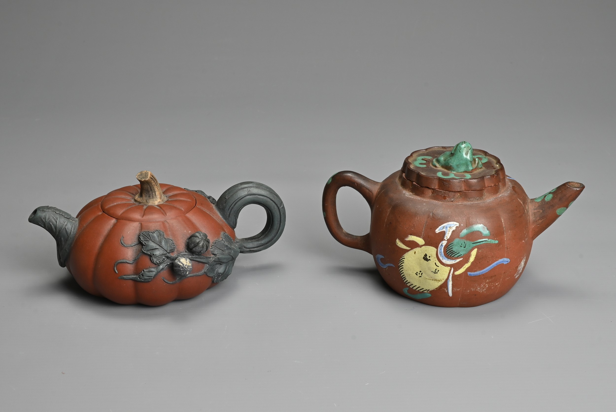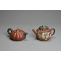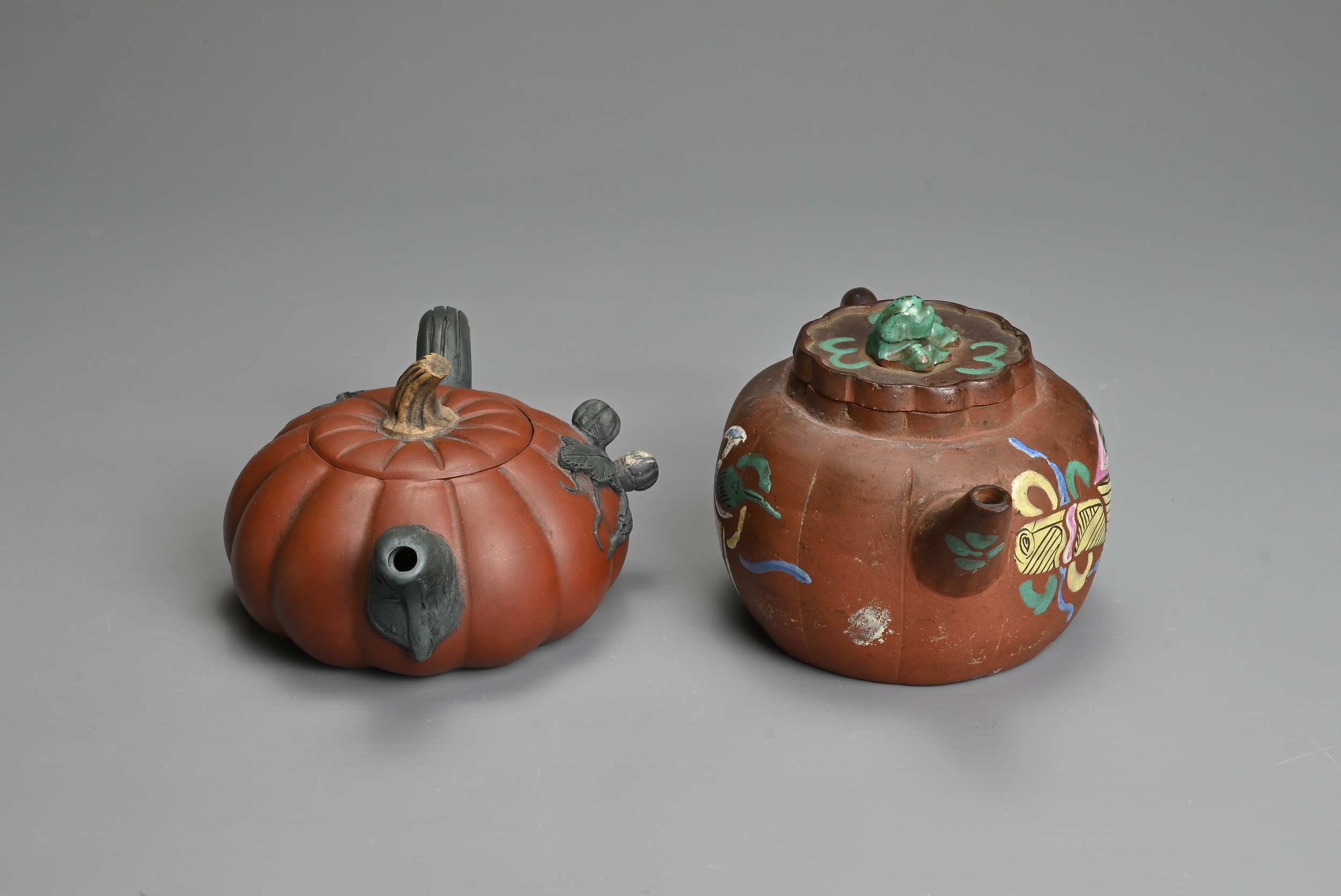 TWO CHINESE YIXING POTTERY TEA POTS, EARLY 20TH CENTURY. A rounded tea pot decorated with green, yellow and blue enamels surmounted by a lion dog; Together with a melon shaped teapot. Both with makers marks to base. Approx. 17cm length. (2)