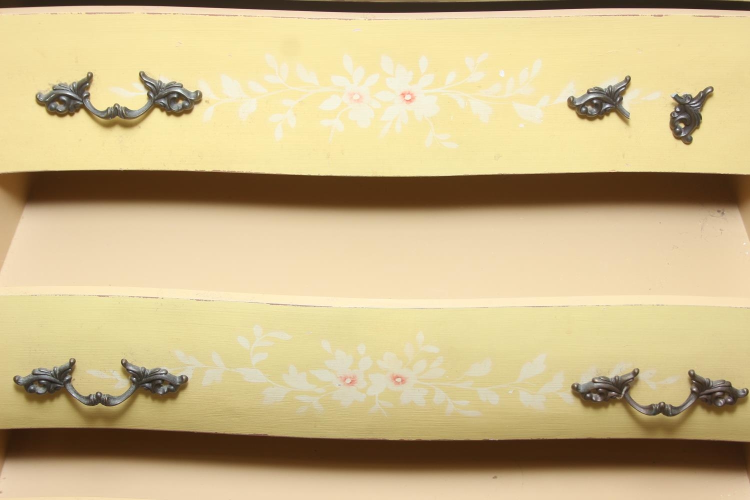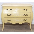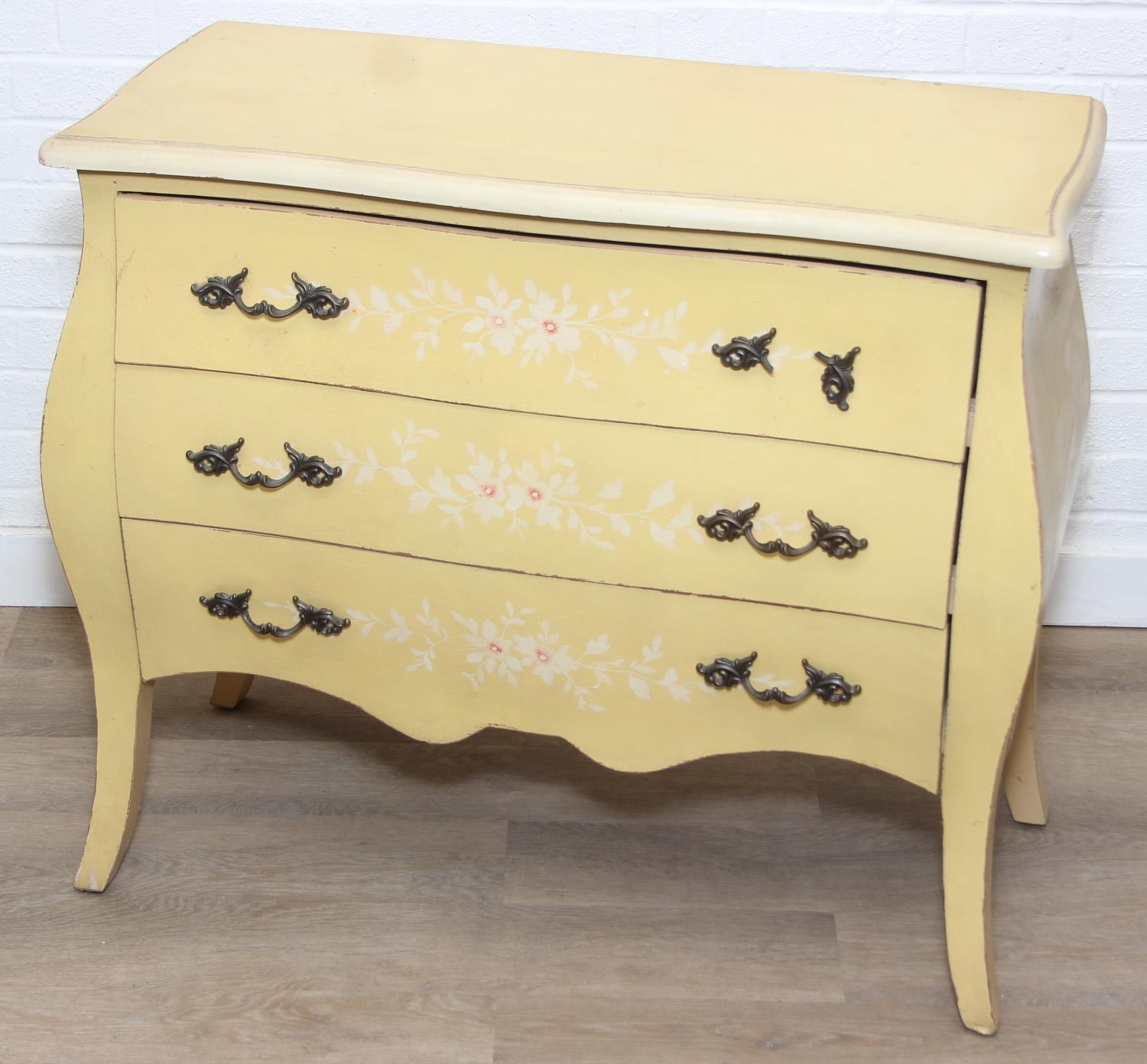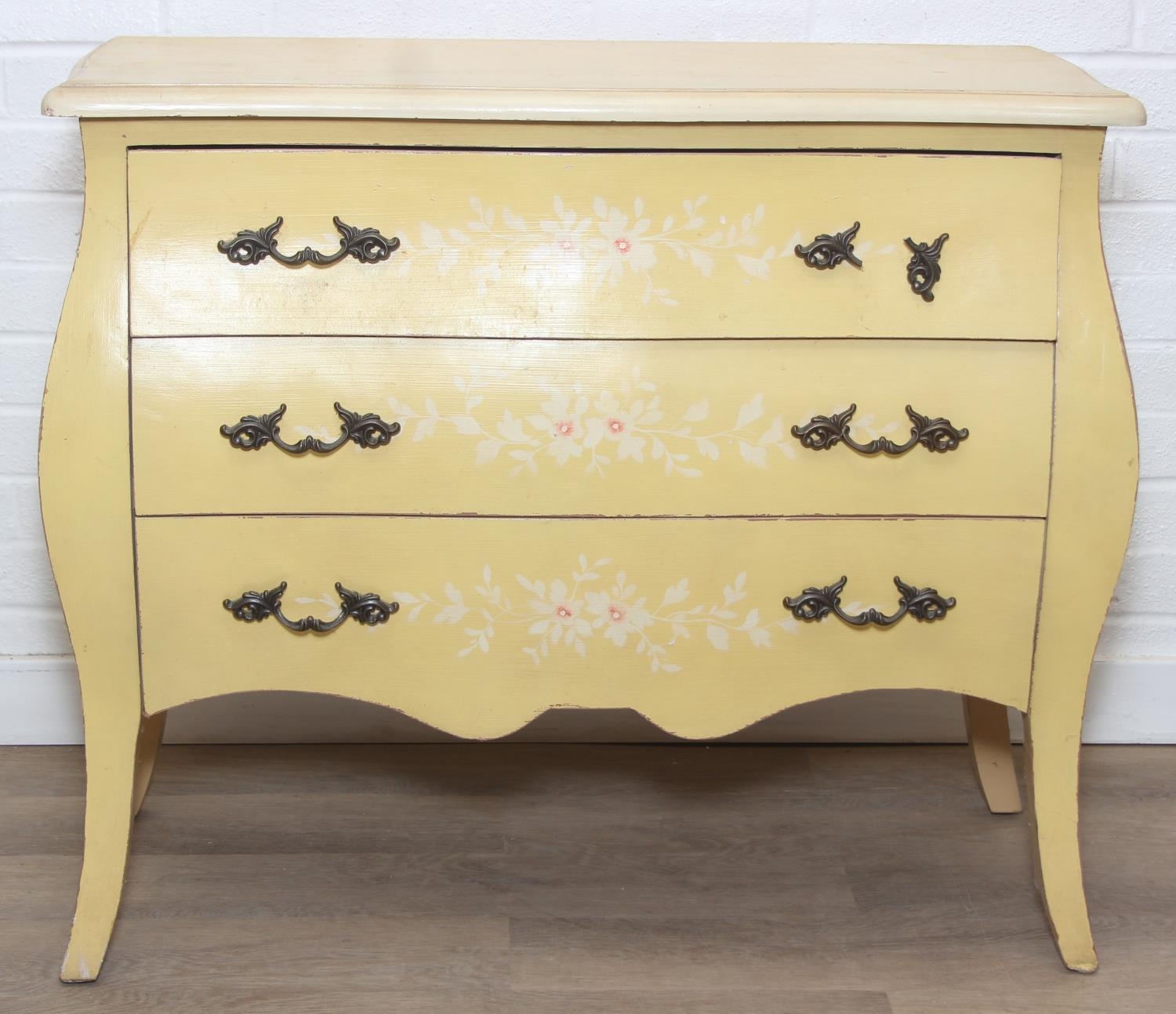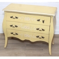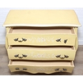 A vintage French style yellow painted three drawer chest of drawers with white painted flowers, 90cm x 41cm x 78cm