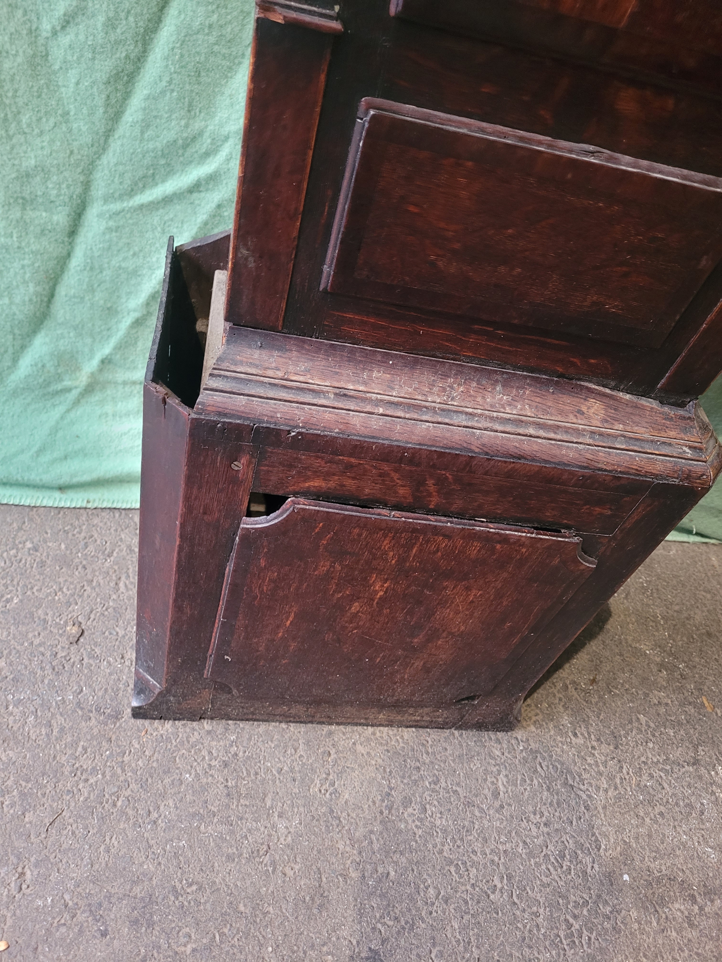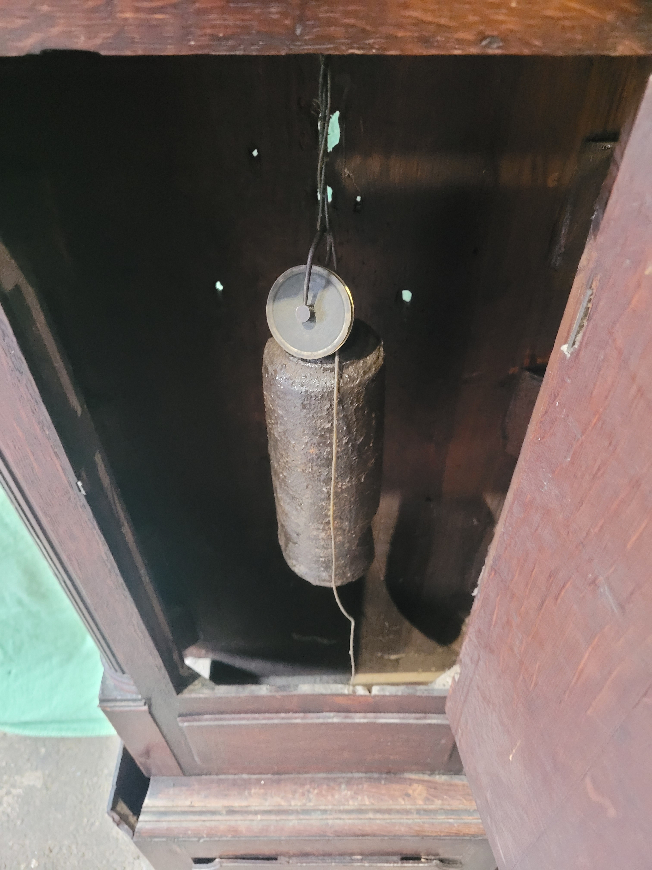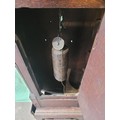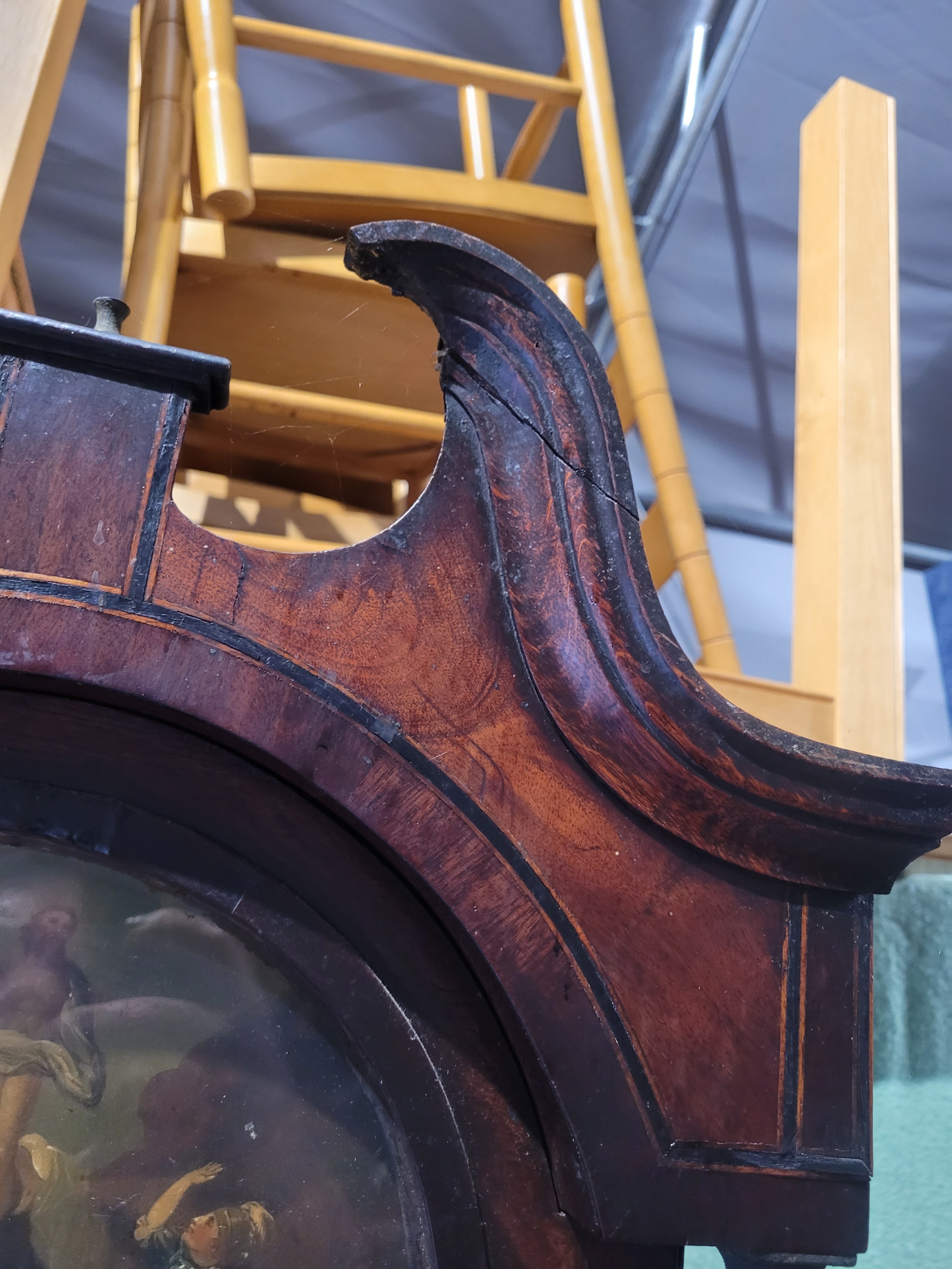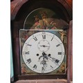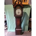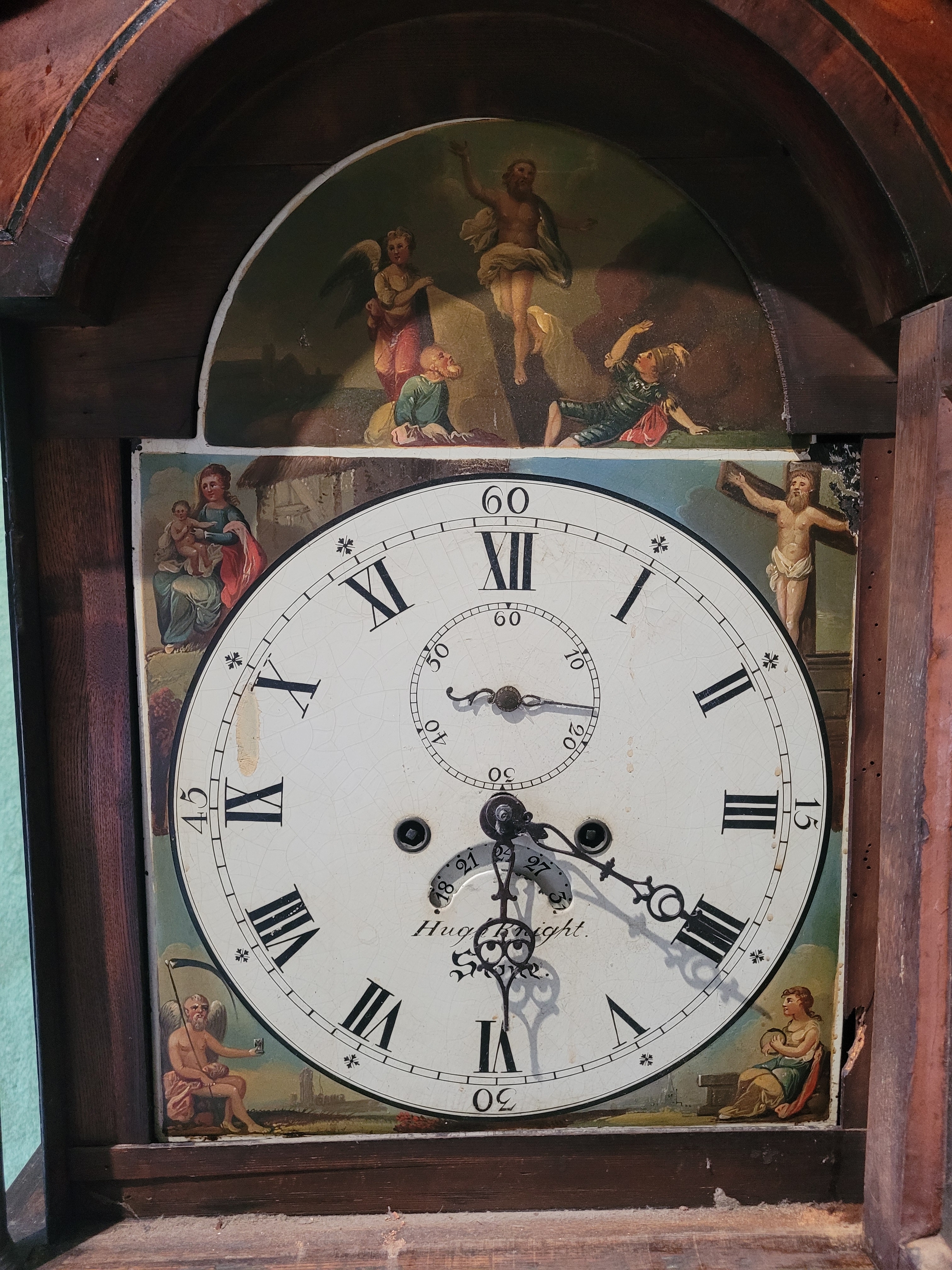 Antique Hugh Knight Longcase clock with white enamel face roman numerals and hand painted religious scenes