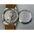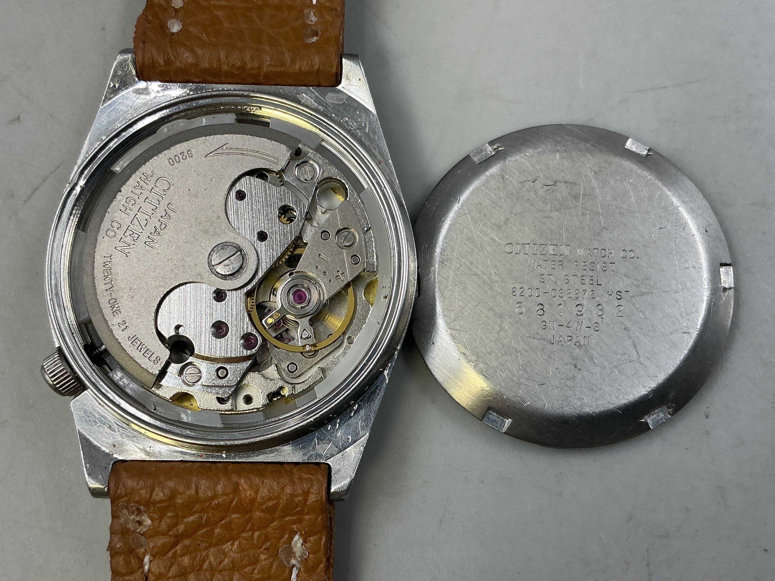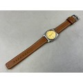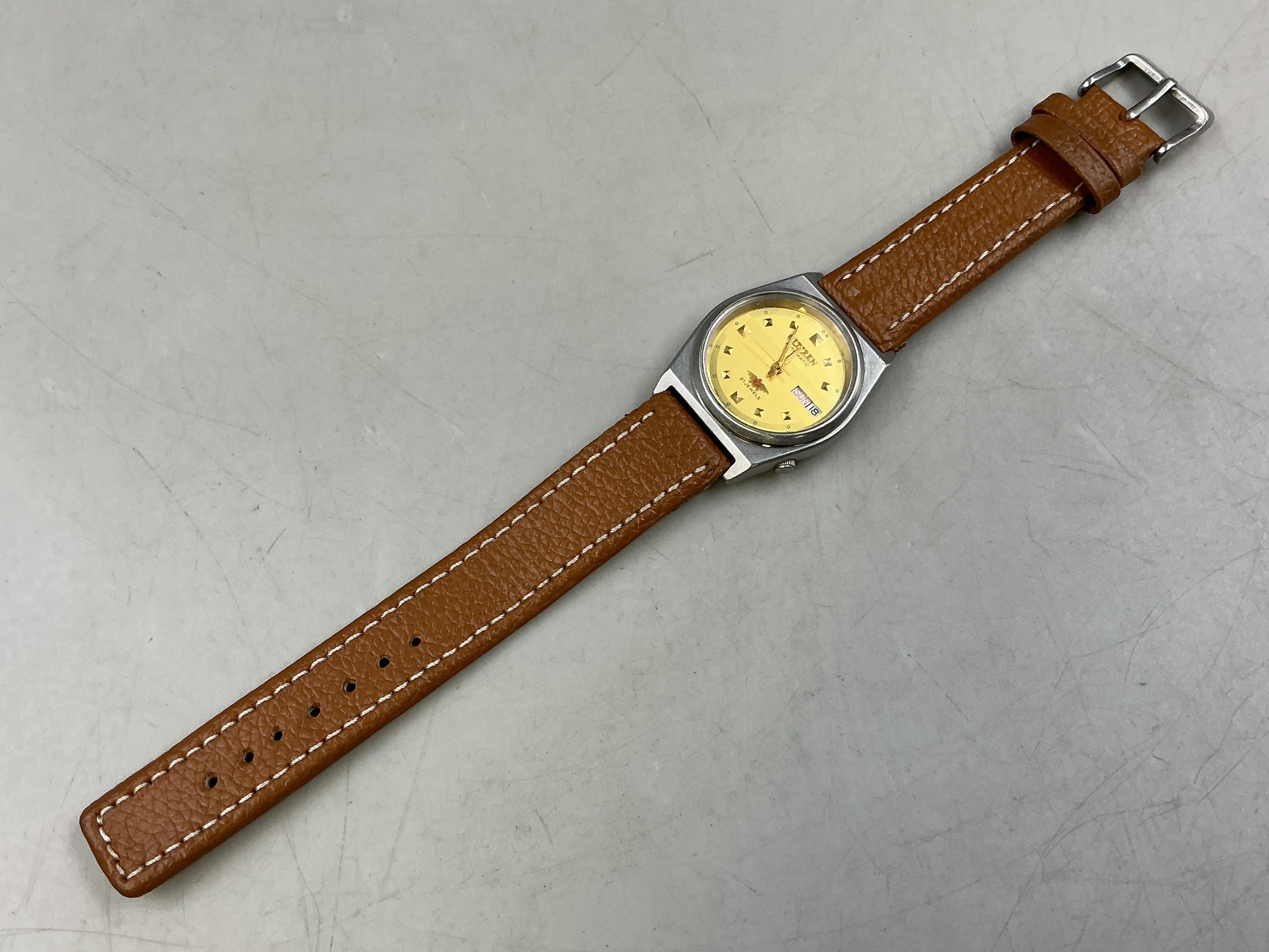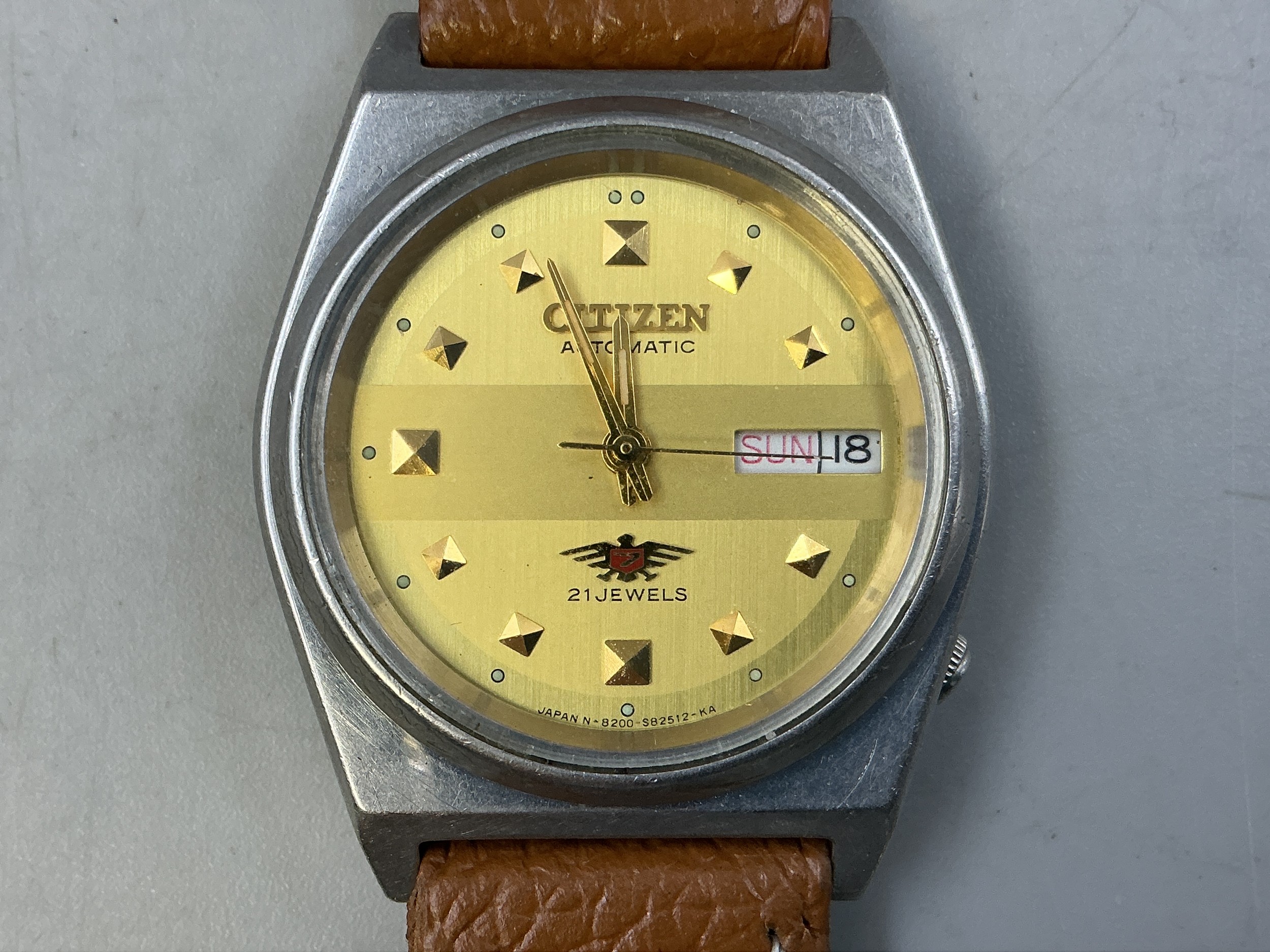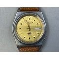 A Vintage Gents Citizen Automatic 21 Jewels Day/Date Watch - Two Tone Gold Dial, Stainless Steel Case, And Brown Leather Strap. Working