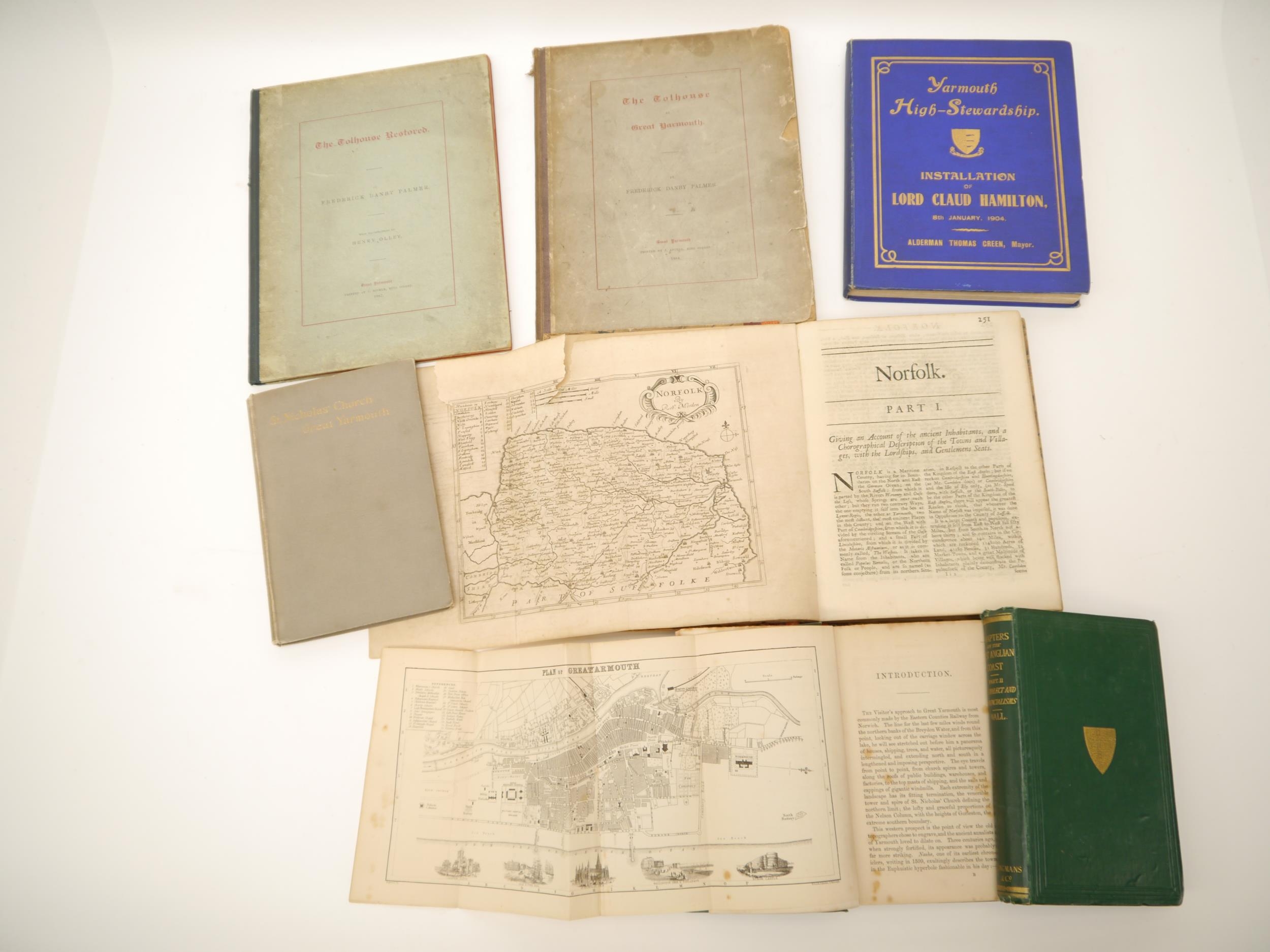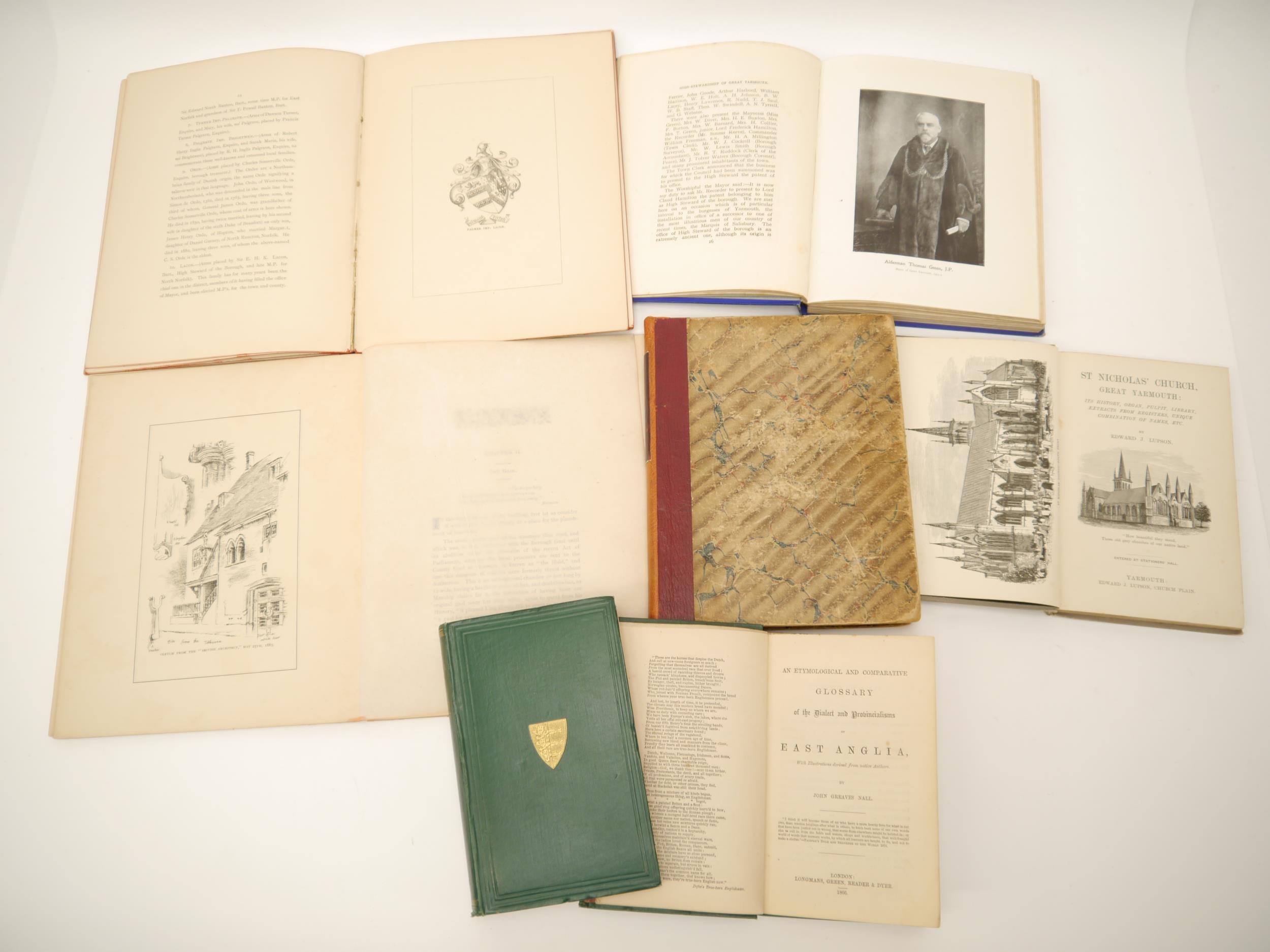 Frederick Danby Palmer, 2 titles: 'The Tolhouse at Great Yarmouth', Great Yarmouth, J. Buckle, 1884, 51pp + index & list of subscribers, 6 plates as called for, 'The Tolhouse Restored', Great Yarmouth, J. Buckle, 1887, 57pp + index & list of subscribers, 8 plates as called for, each 4to, each orig. cloth backed paper covered boards; 'The High-Stewardship of Gt. Yarmouth - Report of the Proceedings at the Installation of Lord Claud Hamilton 8th January, 1904 During the Mayoralty of Ald. Thomas Green, with Portraits of High Stewards', Great Yarmouth Corporation, 1904, signed & inscribed to half title "Only 120 Copies Printed. Charles A. Campling Mayor. 1908.9", portrait frontis + 26 plates as called for, original decorative cloth gilt, scarce; John Greaves Nall: 'Chapters on the East Anglian Coast - Great Yarmouth & Lowestoft; An Etymological and Comparative Glossary of the Dialect and Provincialisms of East Anglia', L, Longman, 1866, 2 volumes, engraved folding plans/maps & ills., uniform original cloth gilt; Edward J. Lupson: 'St Nicholas' Church, Great Yarmouth', Gt. Yarmouth, the author, c.1897, engraved b/w ills. throughout, orig. cloth gilt; plus 1 other similar (7)