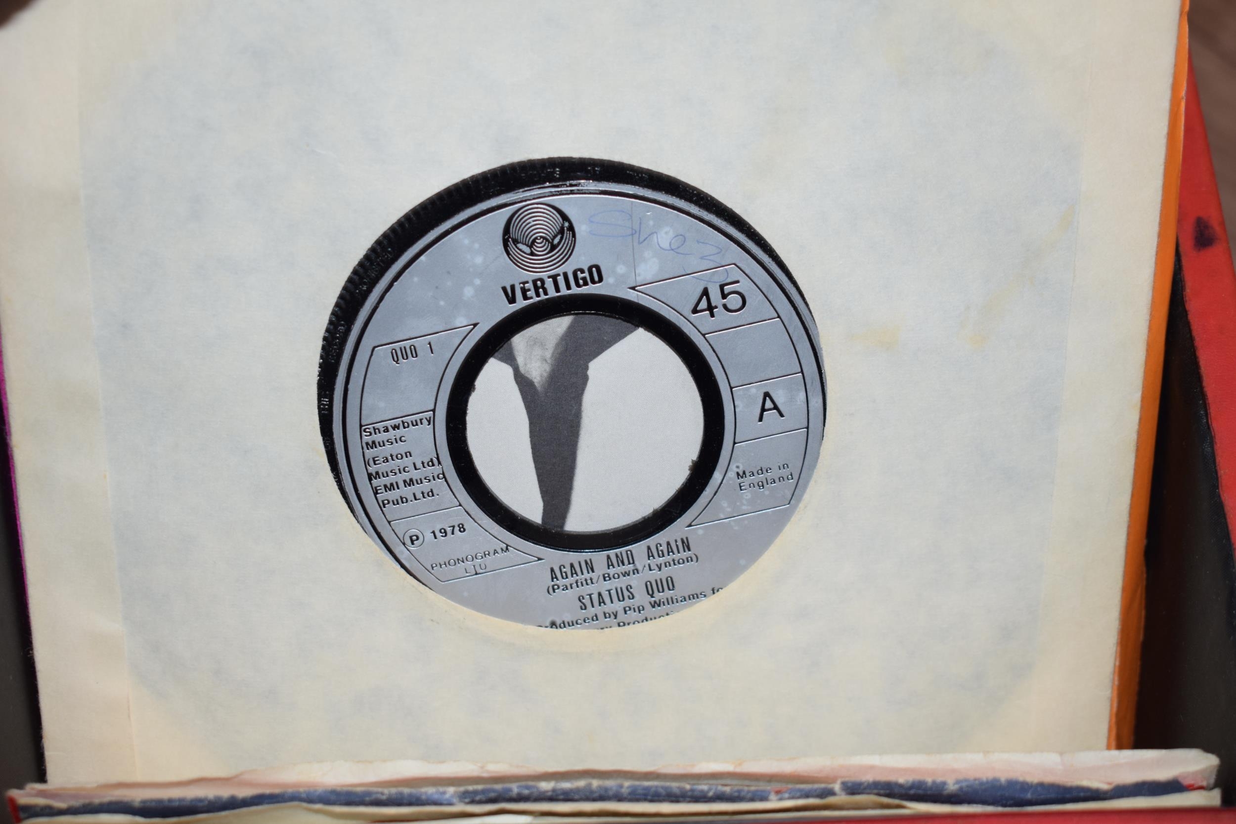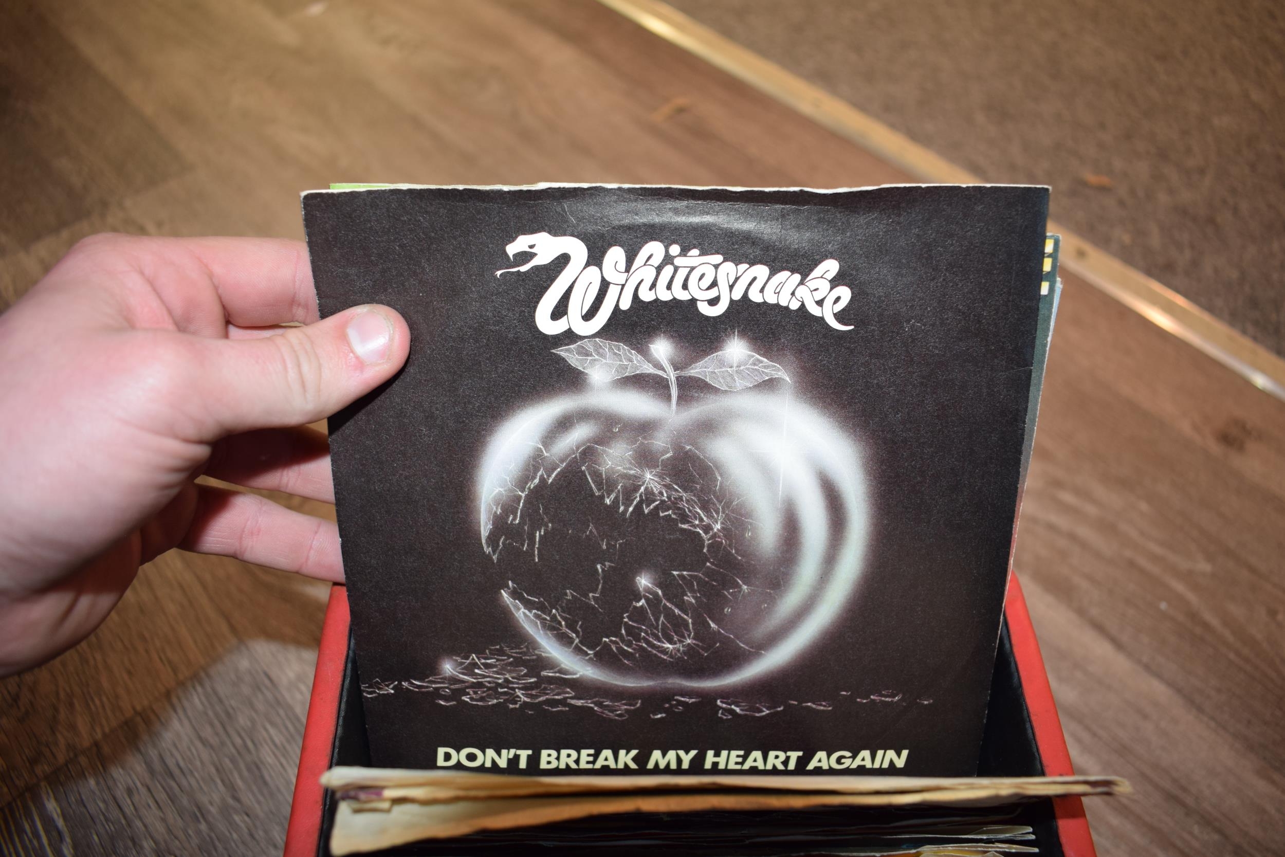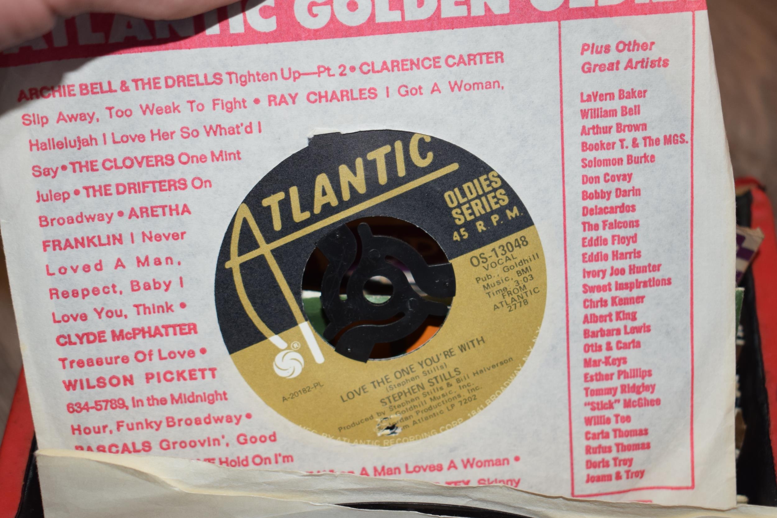 A collection of 45 single vinyl records to include examples by artists, Atomic Rooster, The Mama's and The Papa's, Bruce Springsteen, Bad Company Whitesnake and other similar artists in period carry case. (Qty)