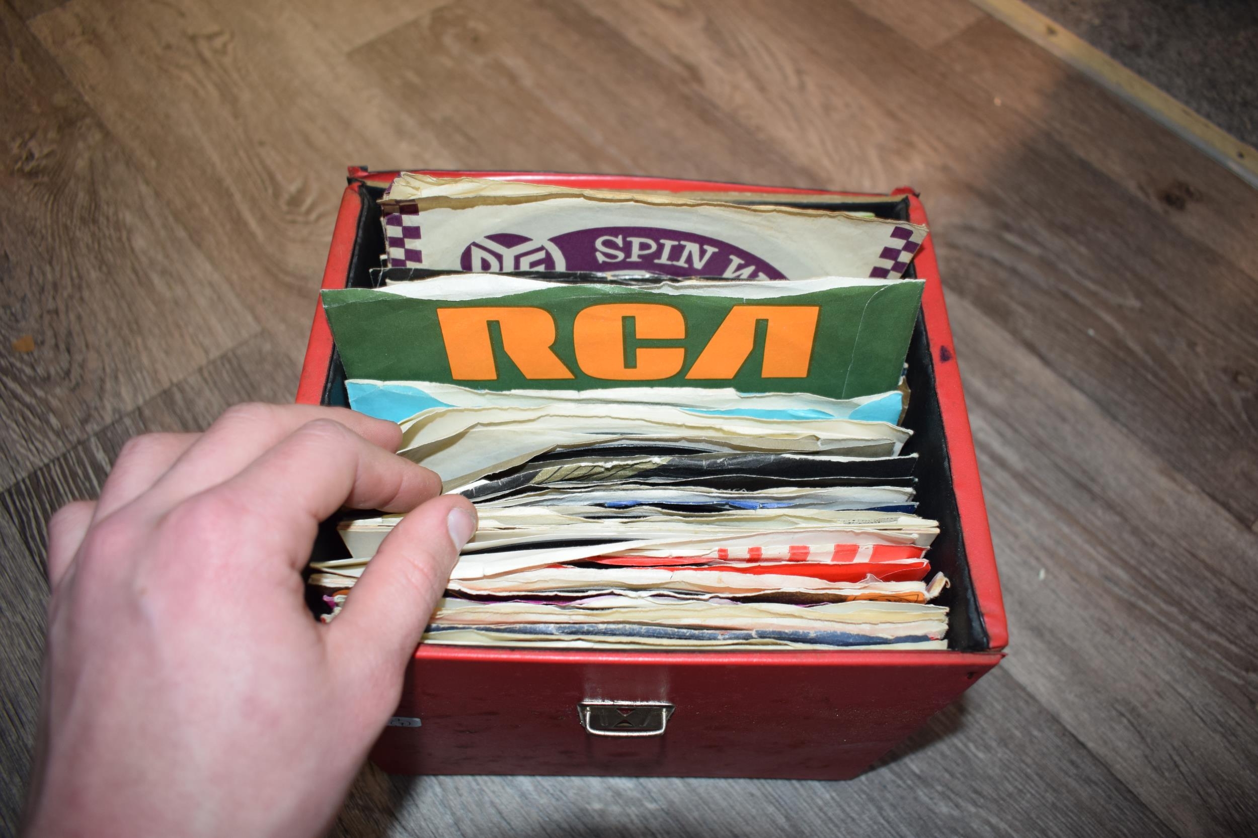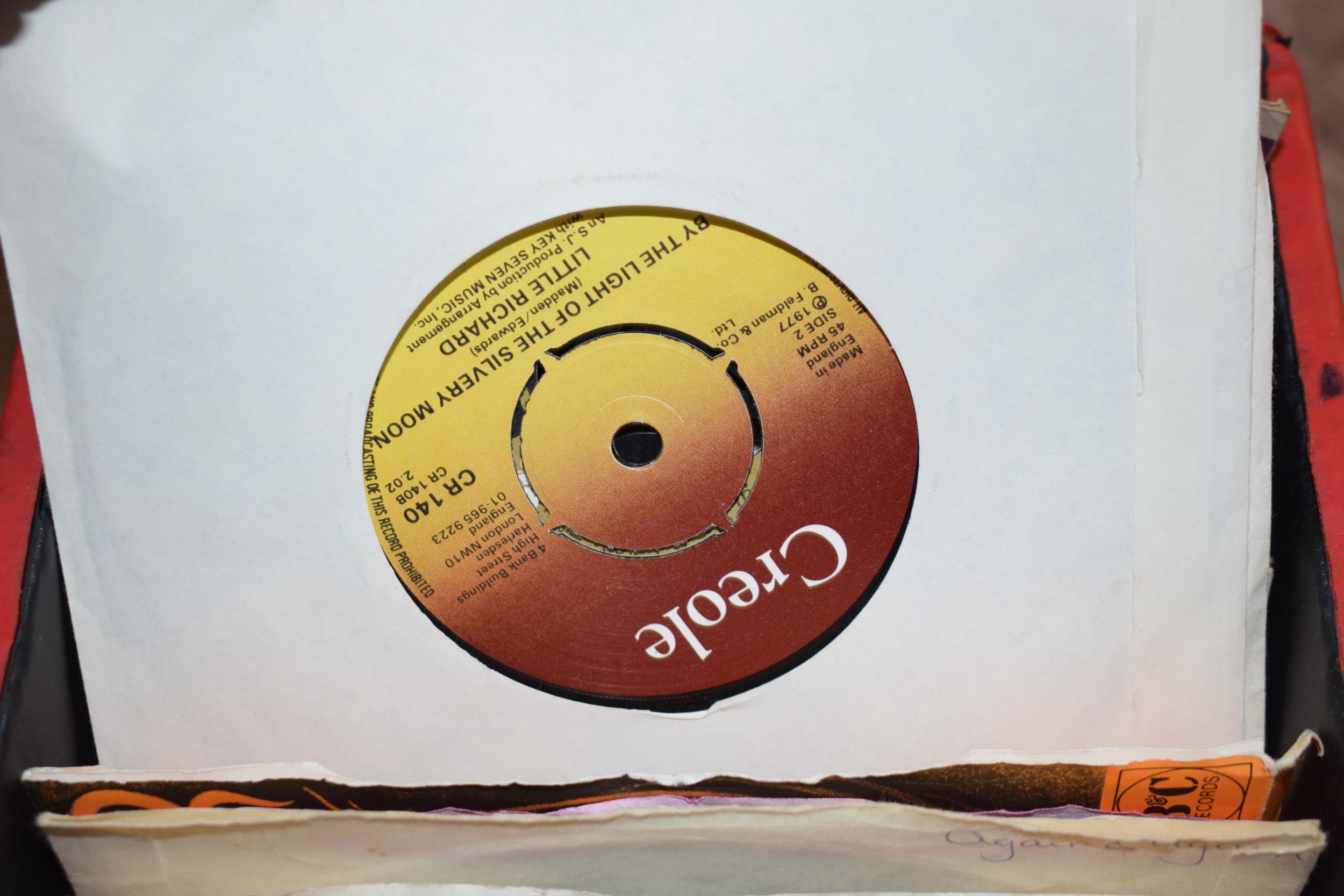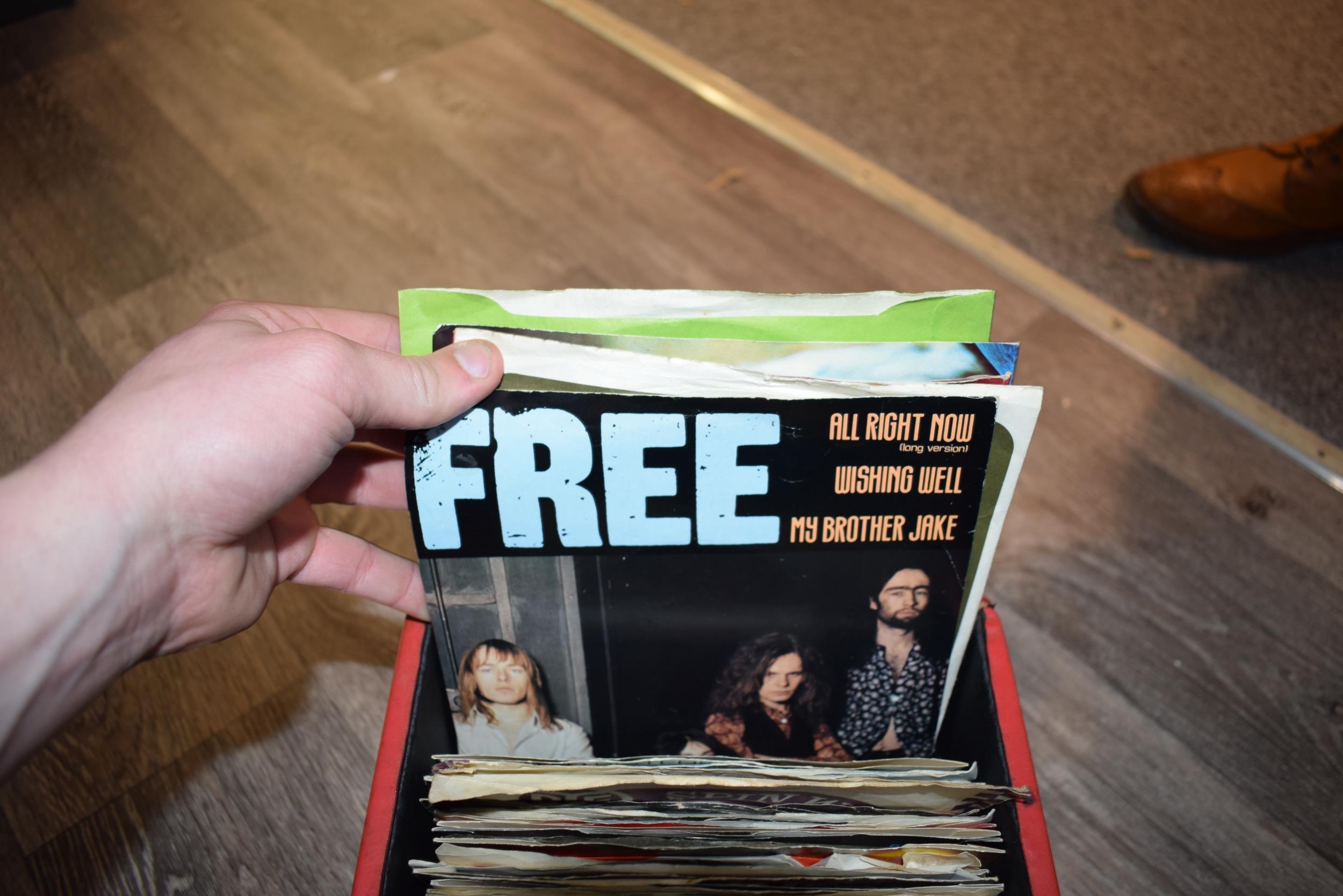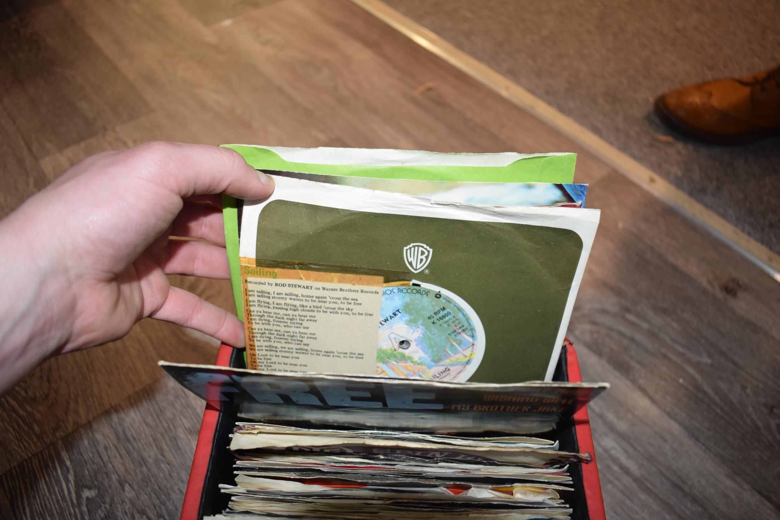 A collection of 45 single vinyl records to include examples by artists, Atomic Rooster, The Mama's and The Papa's, Bruce Springsteen, Bad Company Whitesnake and other similar artists in period carry case. (Qty)