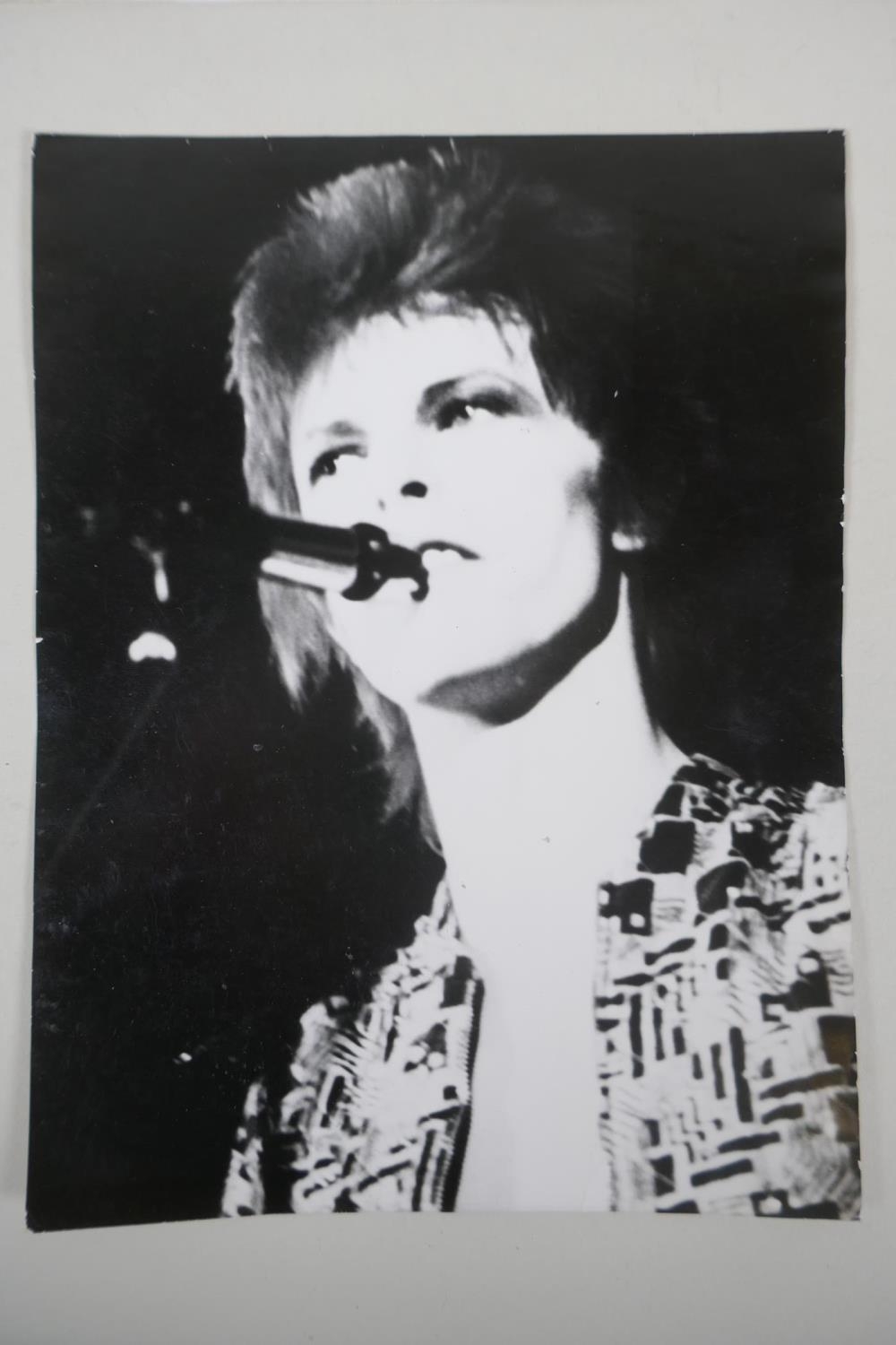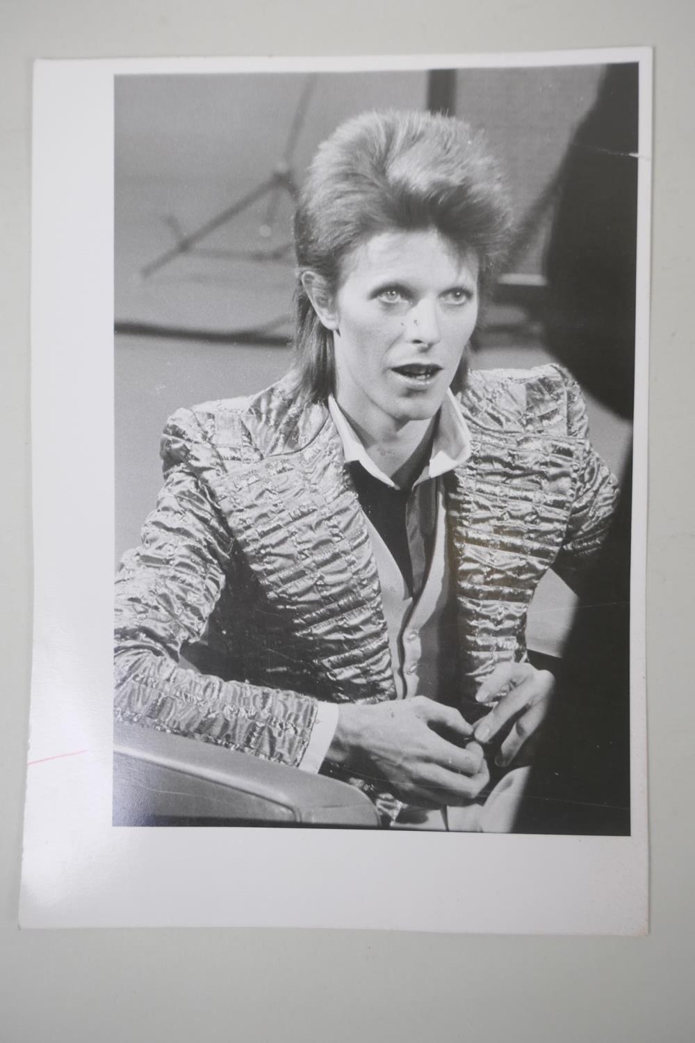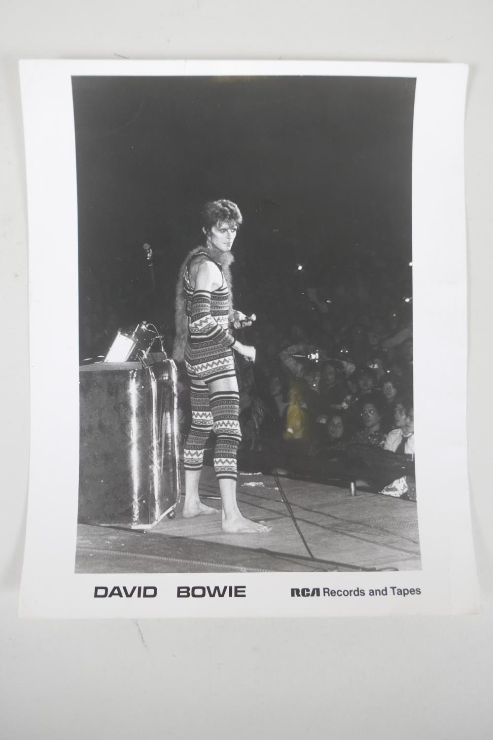 Three 1970s black and white press photographs of David Bowie, with photographer's stamps verso for Joseph Coomber and Joseph Stevens, and a David Bowie RCA Records publicity photo, largest 24 x 19cm