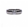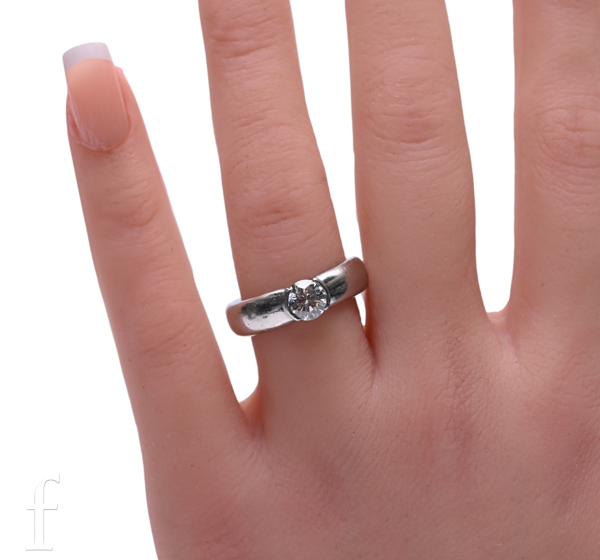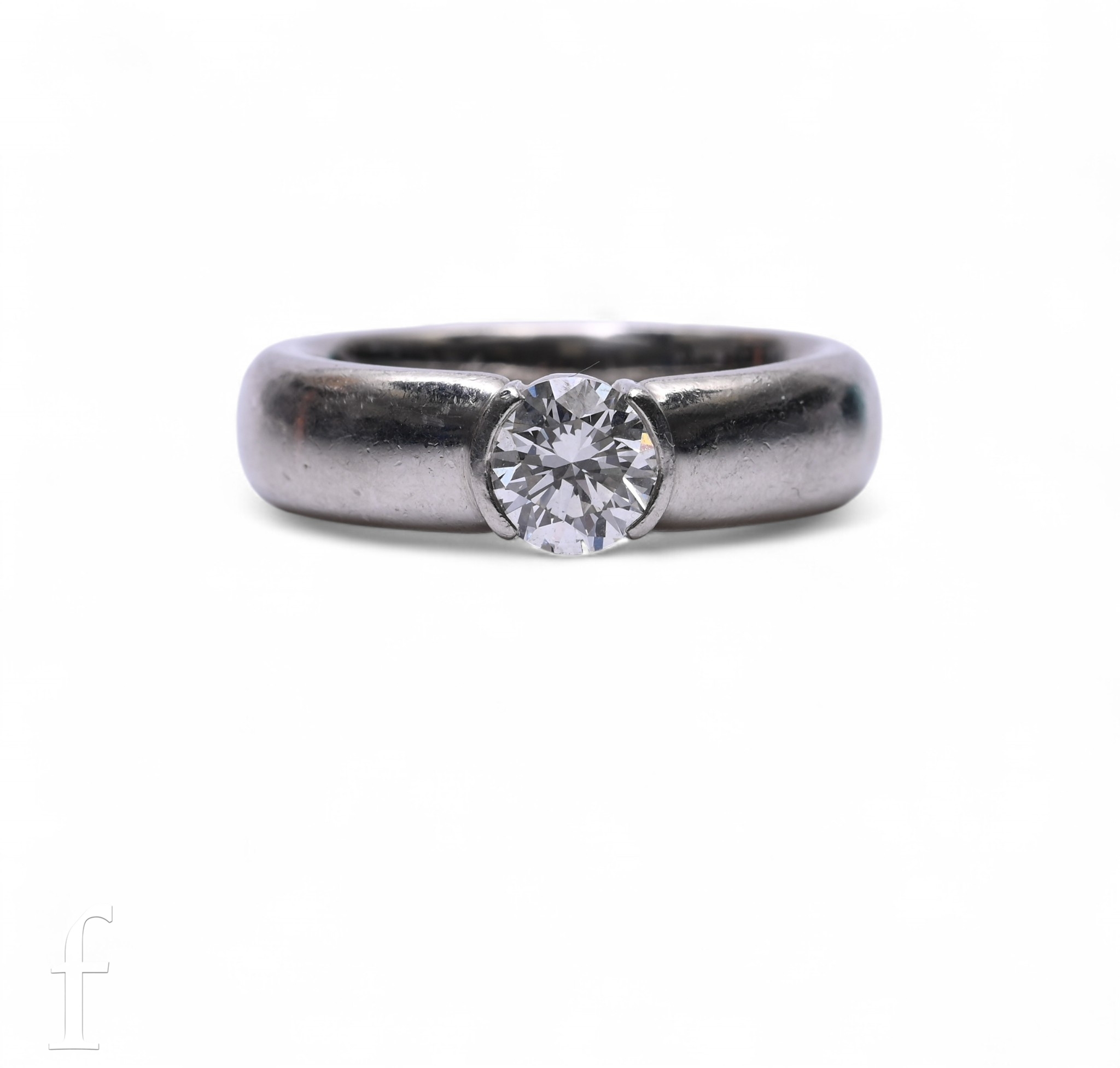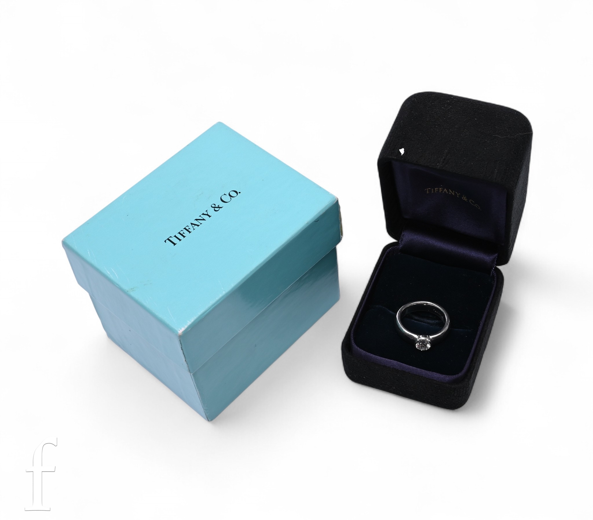 Tiffany & Co; A single stone diamond ring, the brilliant-cut diamond collet set on a broad platinum band, marked Tiffany & Co, 950, 'PT950', total weight 14.3g, ring size M, with ring box and outer box.