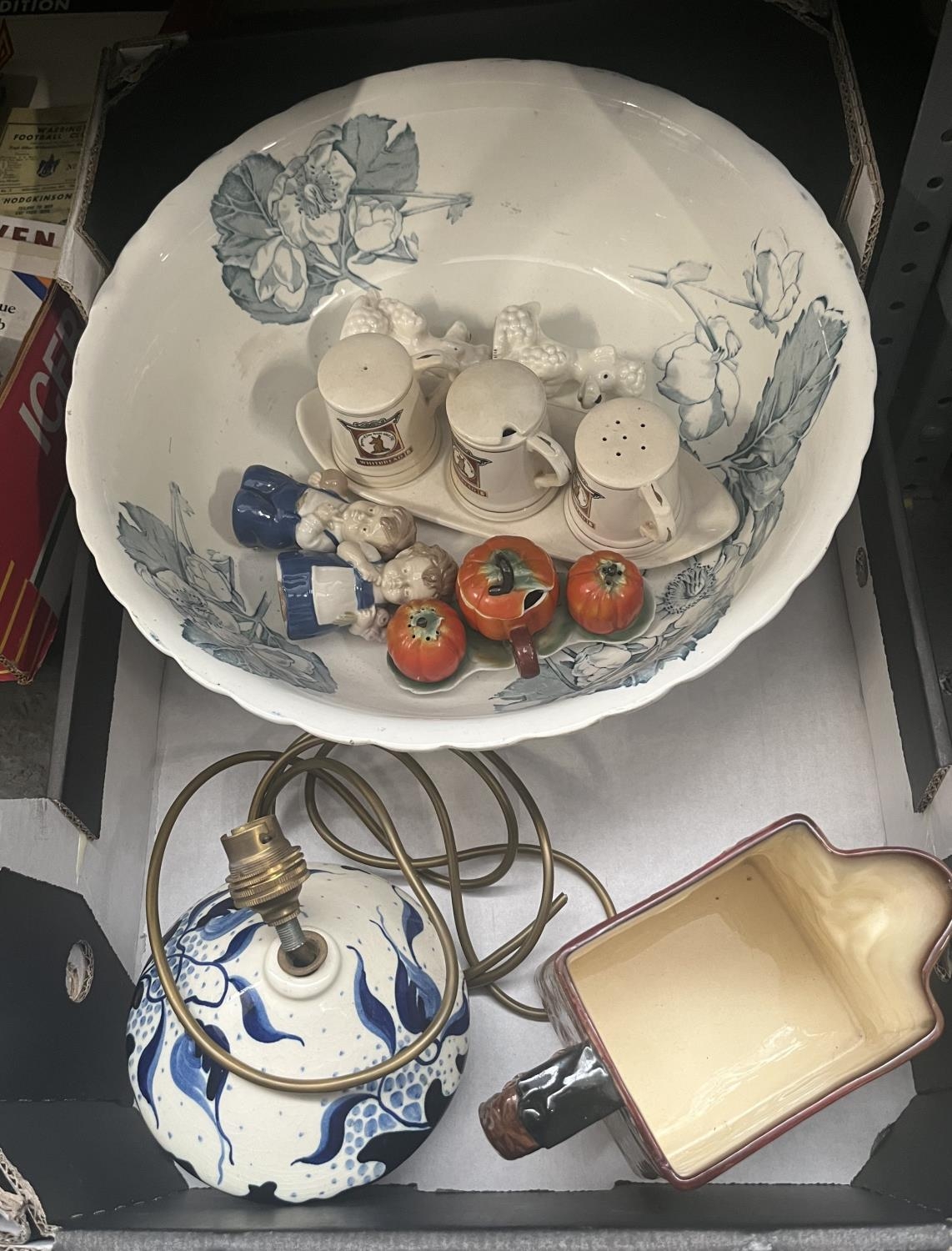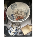 Box containing a Royal Doulton The Pickwick Papers jug featuring The White Hart Inn and a large ceramic bowl etc