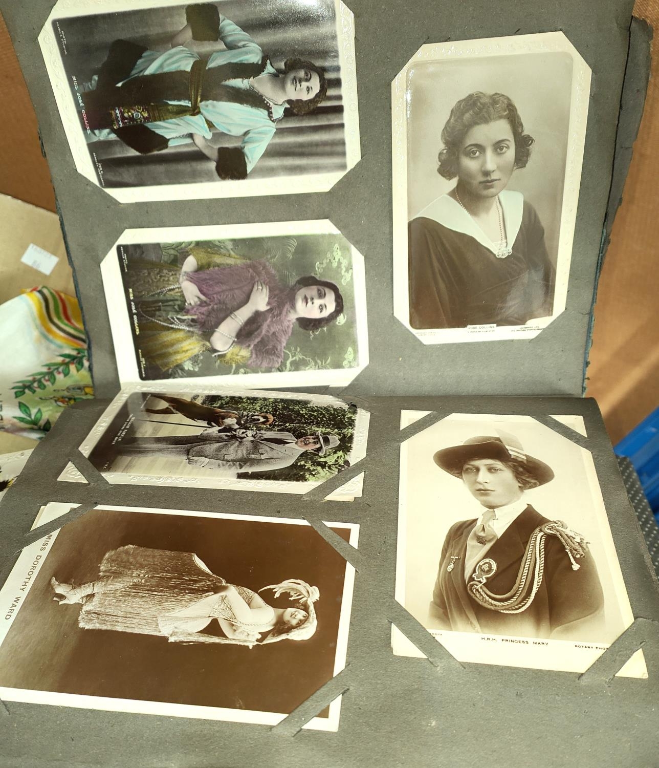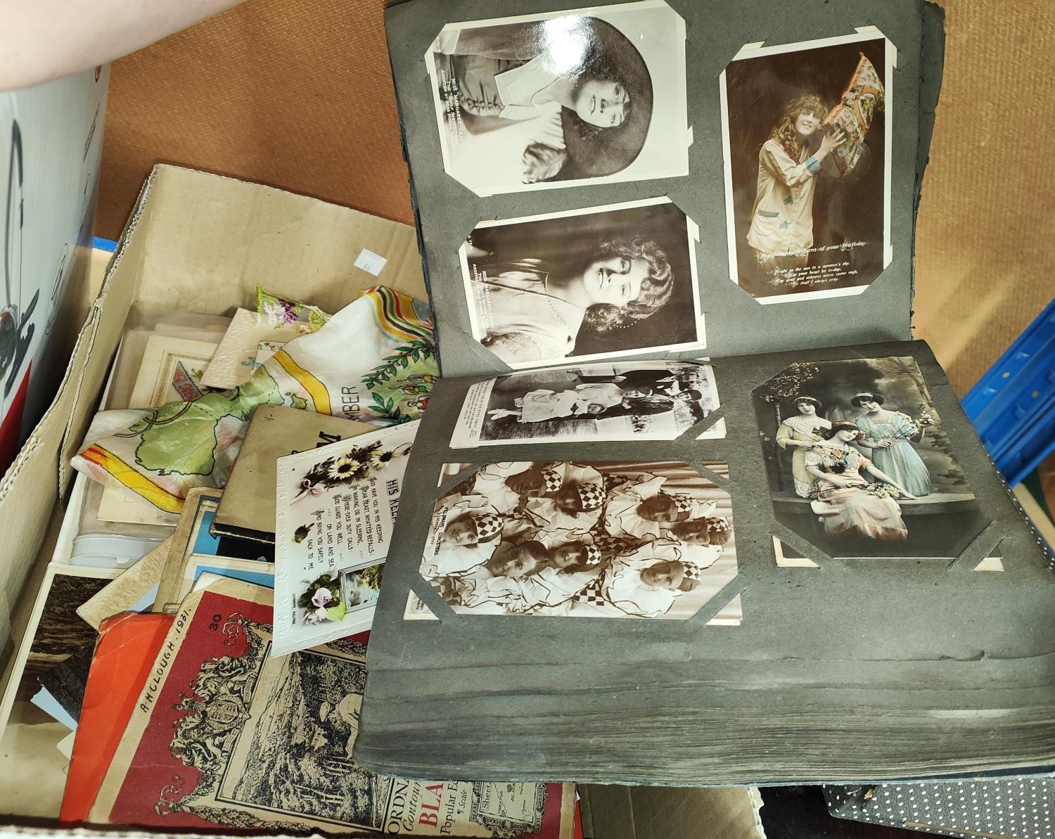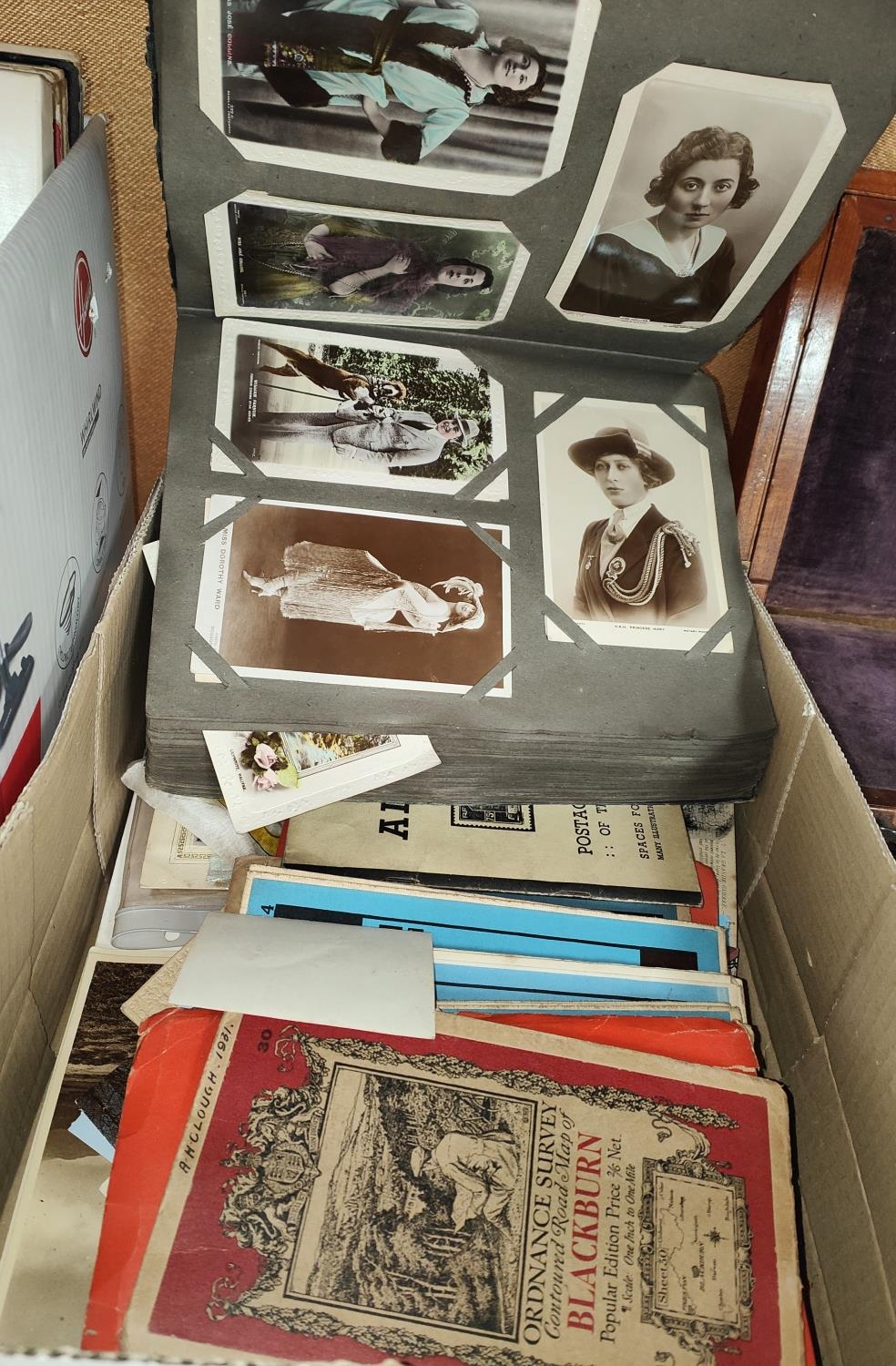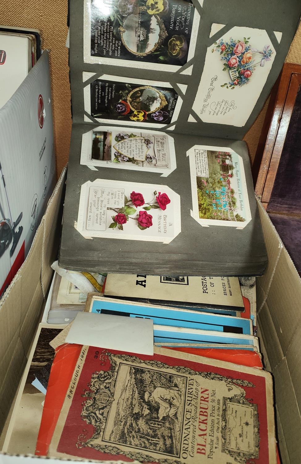 A collection of vintage postcards in album; 2 WWI silk postcards; various maps; etc.