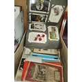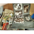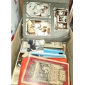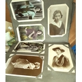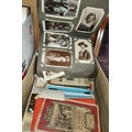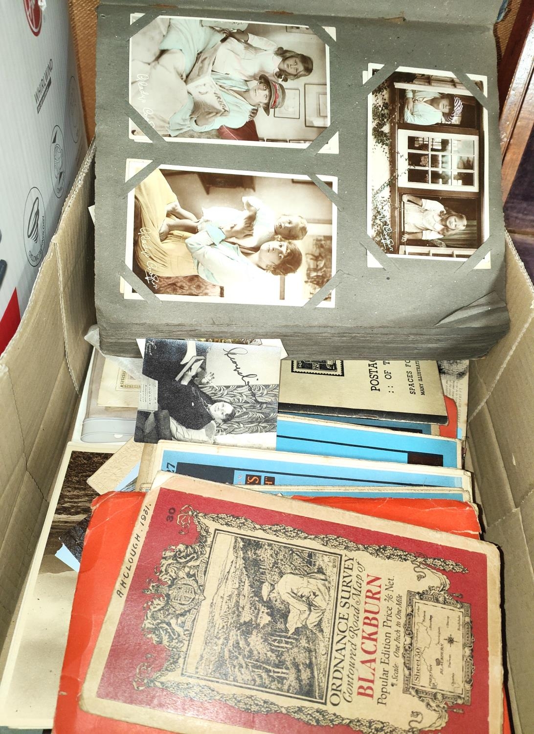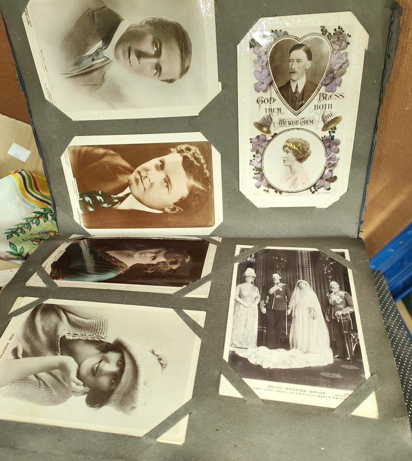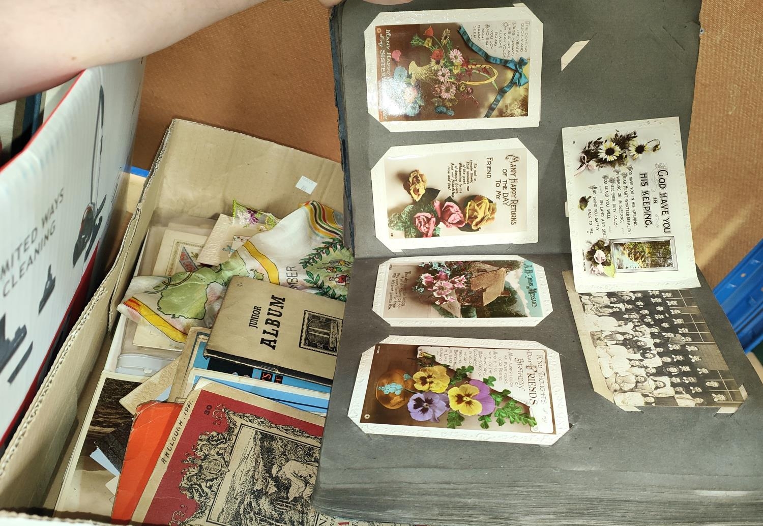 A collection of vintage postcards in album; 2 WWI silk postcards; various maps; etc.