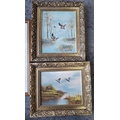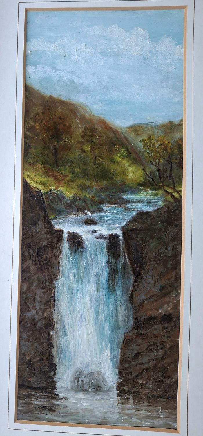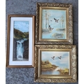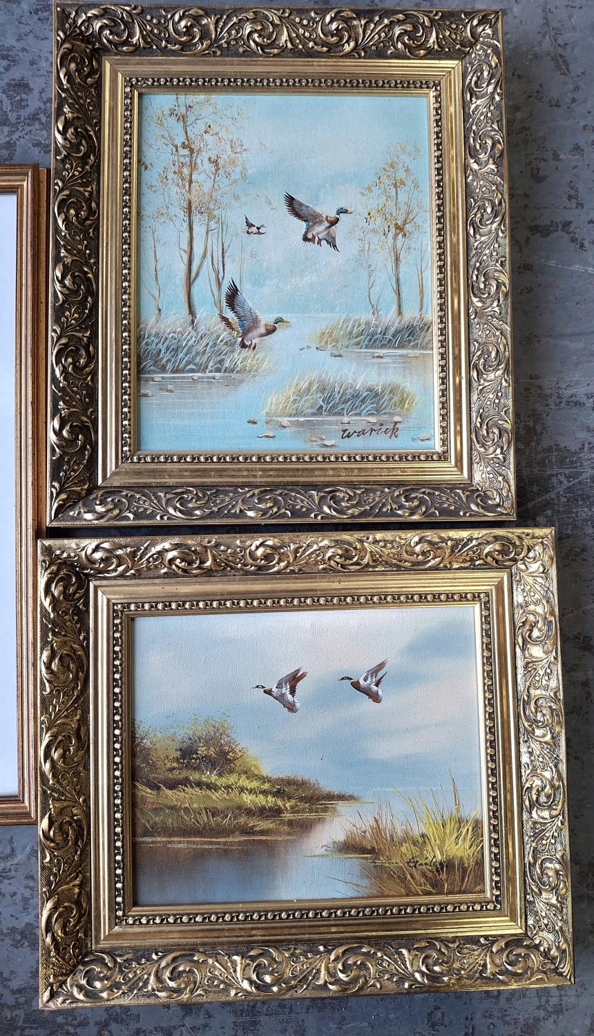 Pair of small oil paintings depicting Mallards in flight, both signed WARWICK and both in matching gilt frame together with a small, unframed antique oil painting depicting a waterfall (3)