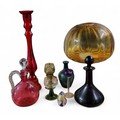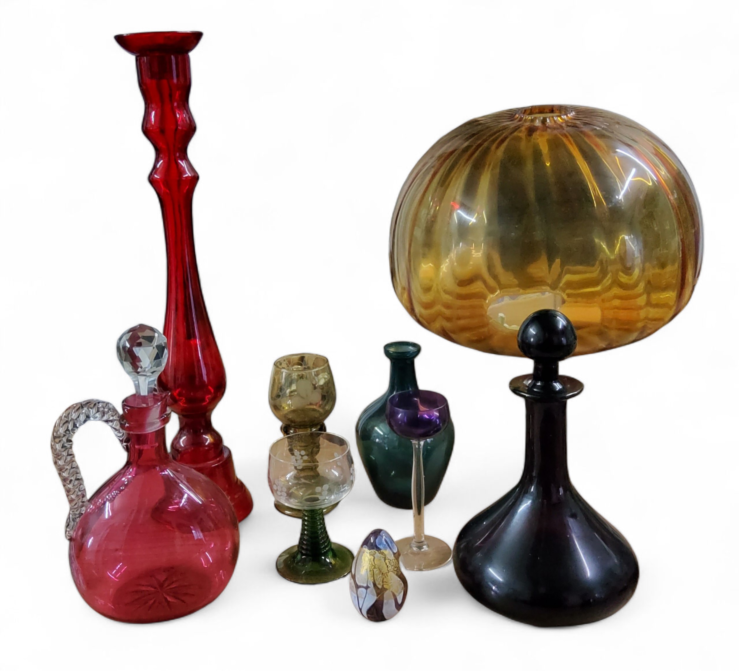 A Victorian amethyst ship's decanter, globular stopper, 23.5cm high, c.1880; a cranberry claret jug; other coloured glassware
