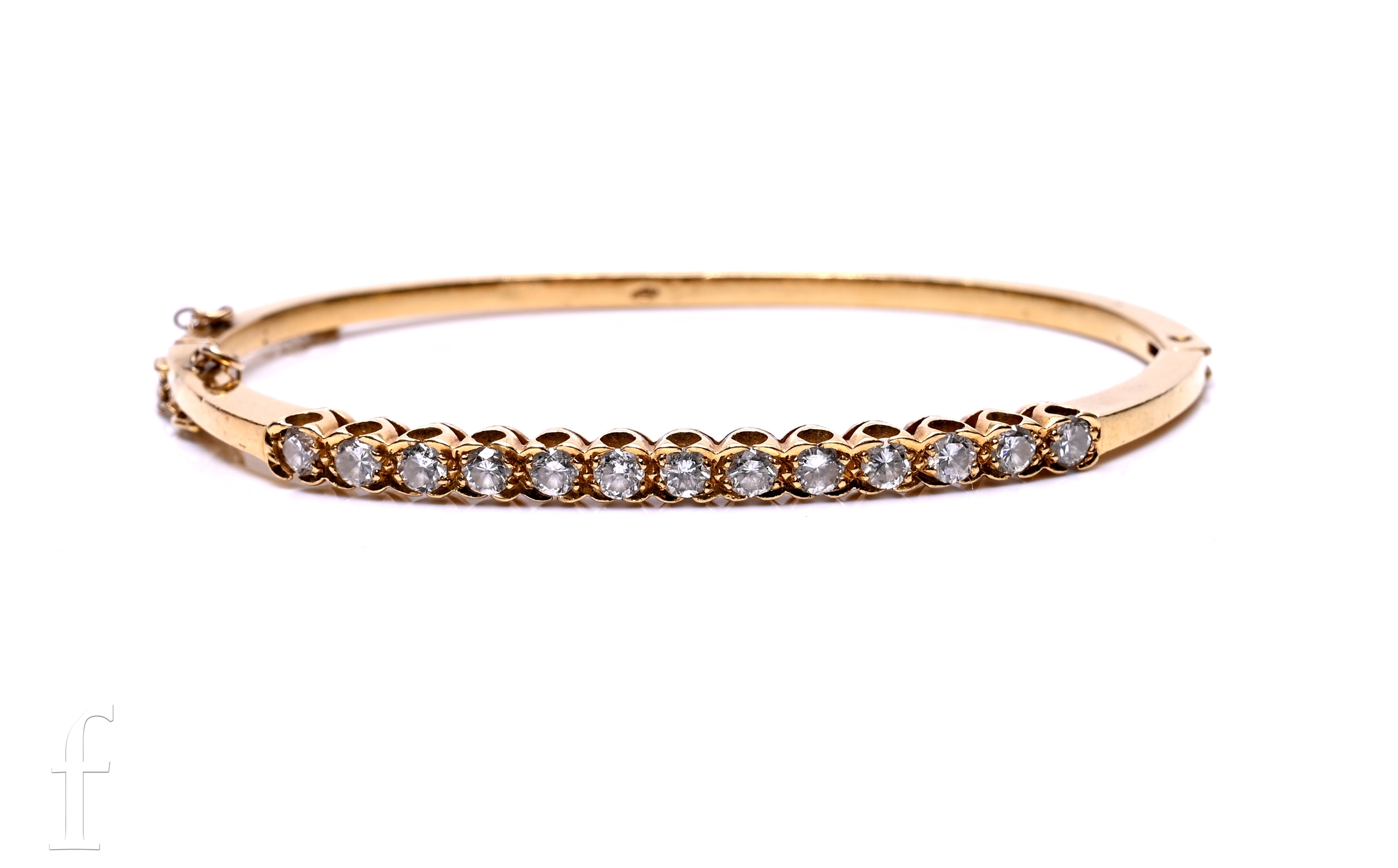 A diamond bangle, the thirteen brilliant-cut diamonds claw set within an undulating border, to a solid hinged bracelet with integral clasp, marked '750', total weight 20g, internal diameter 6cm.
