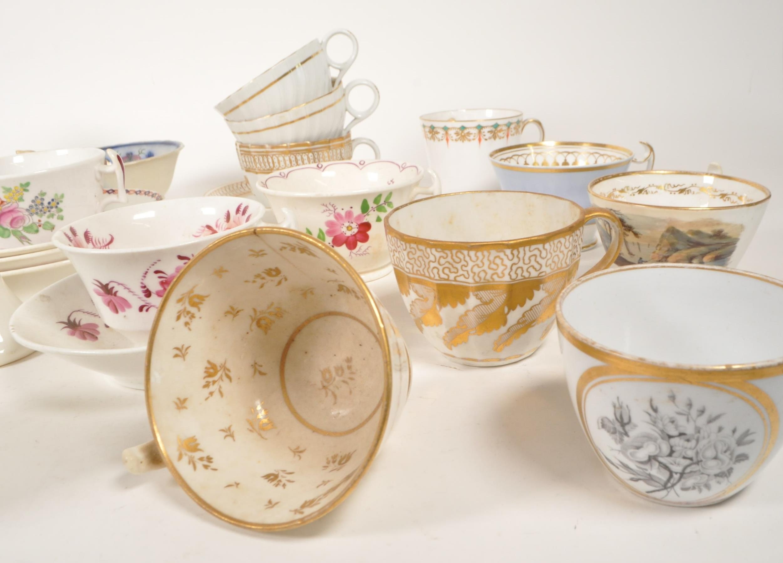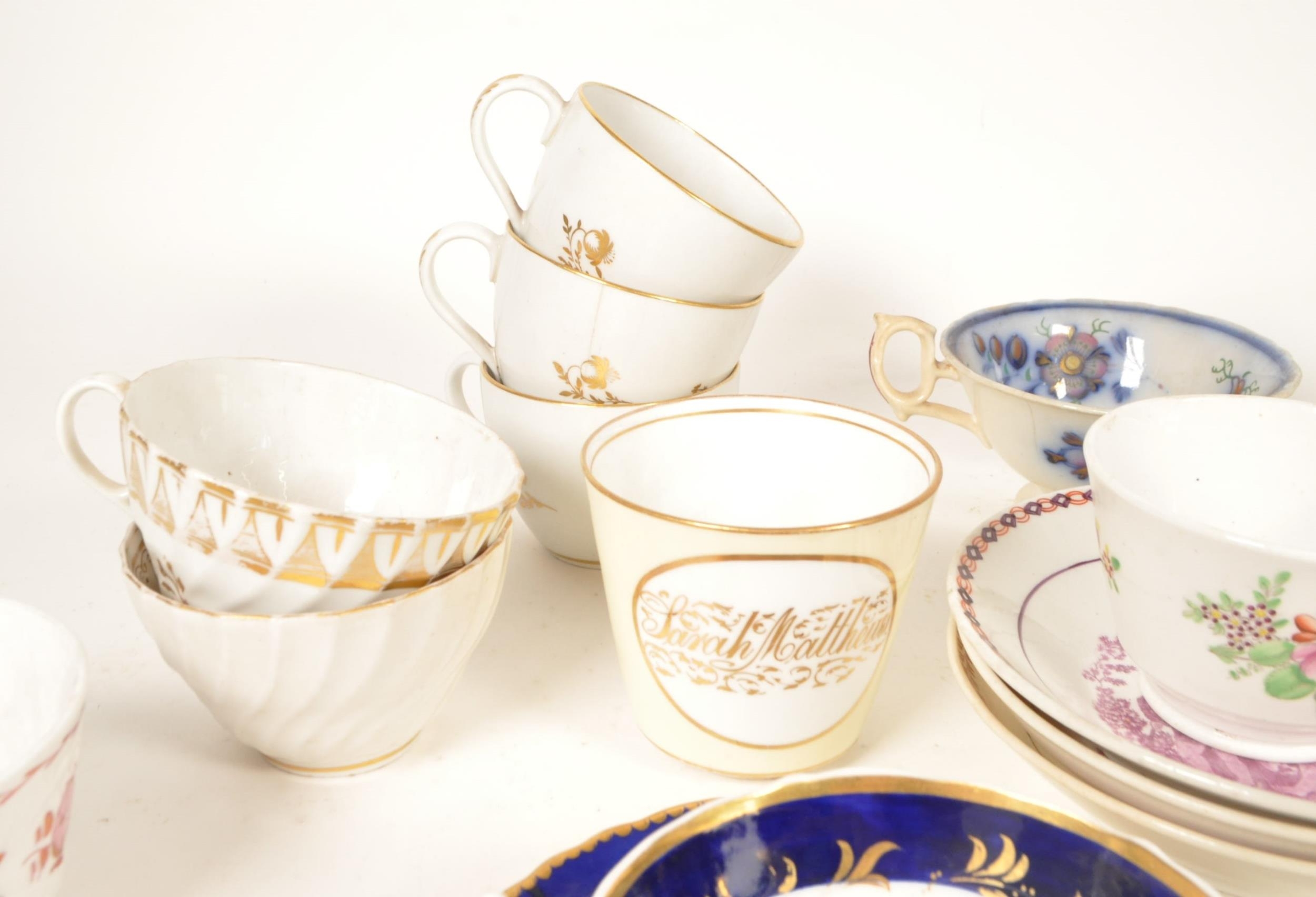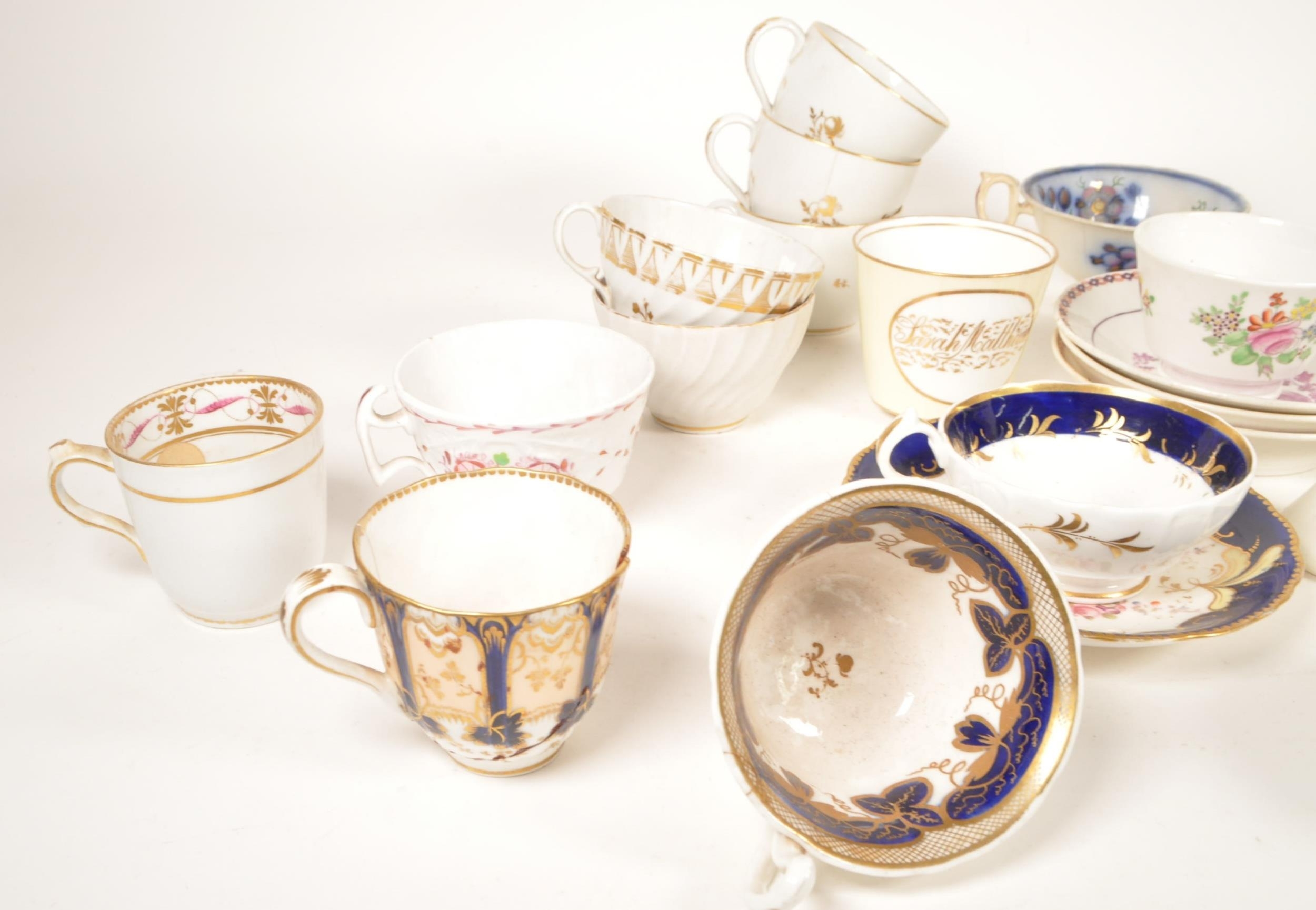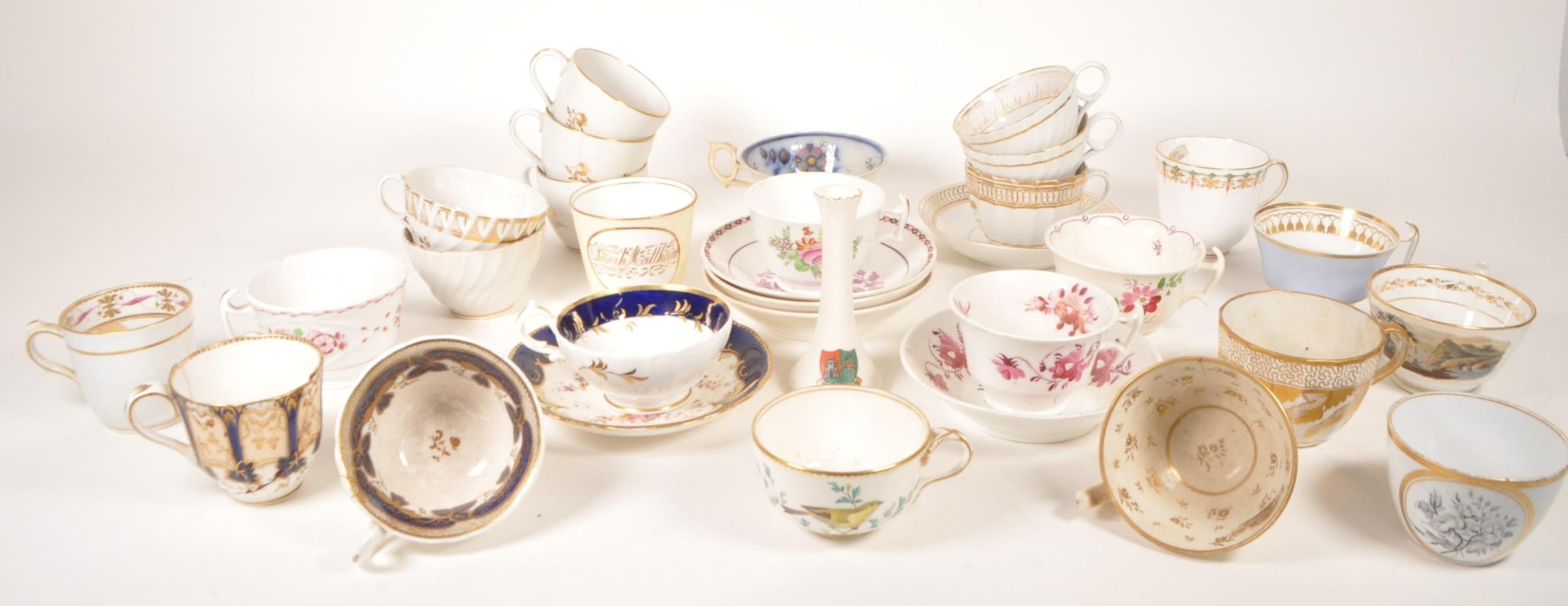 Large collection of 19th / 20th century porcelain china tea cups. Examples including a Davenport Longport coffee cup, Spode 2197 tea cup, John Rose Coalport gilded tea cup, a Sarah Matthews tea cups, and more.