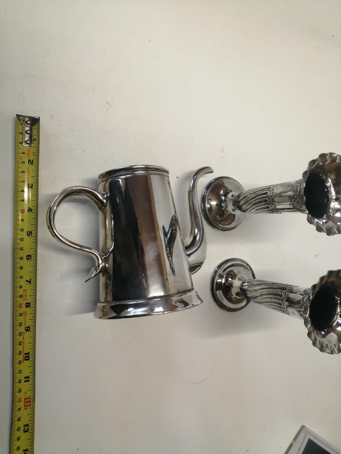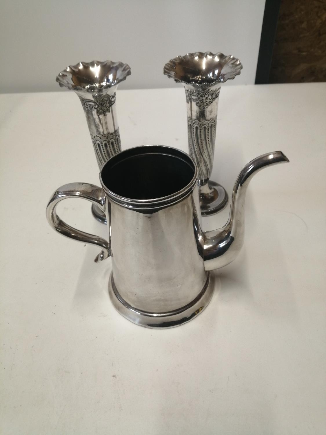 Pair of early 20th century silver plated trumpet vases and early 19th century Sheffield plate chocolate pot missing lid