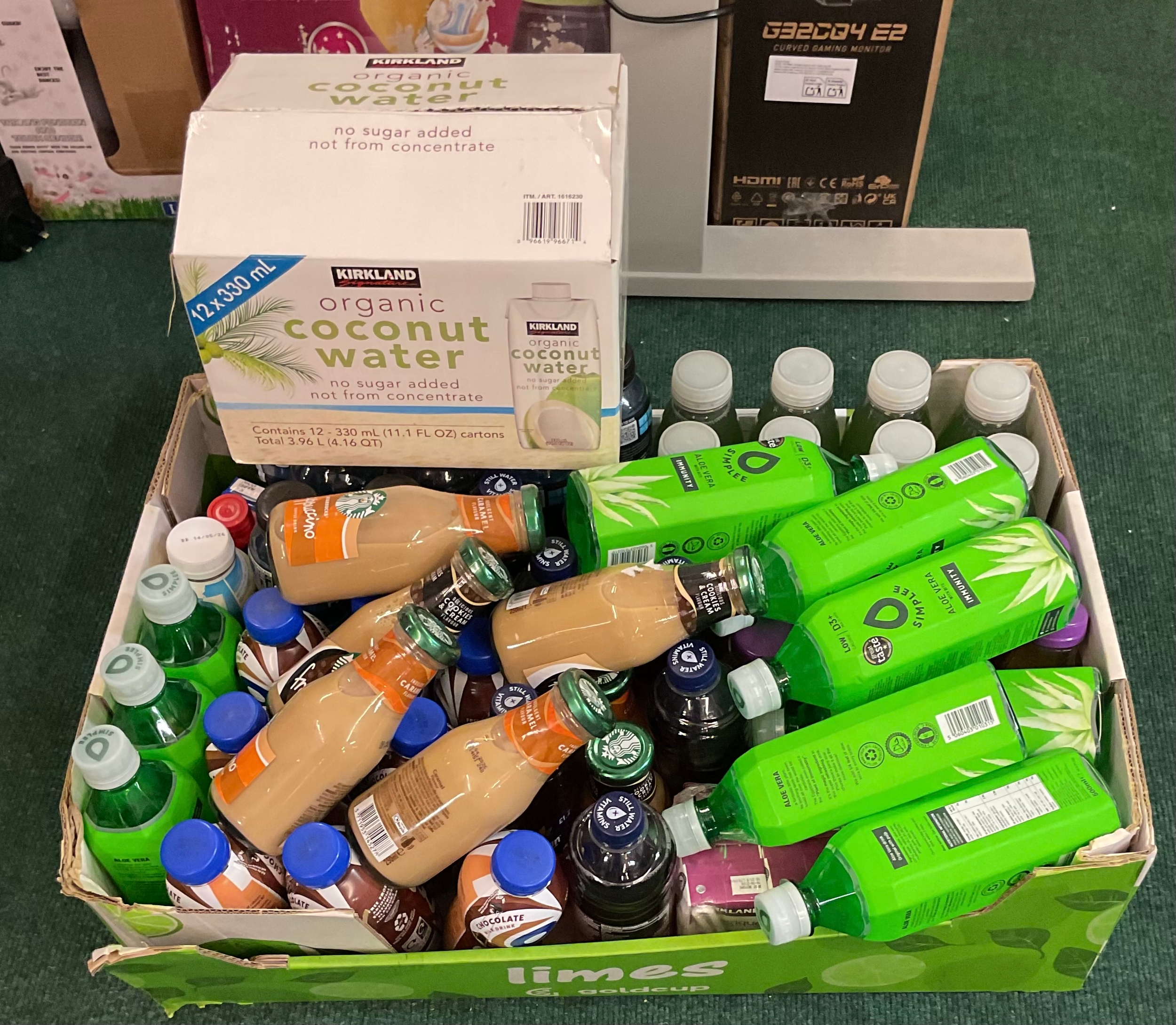 BOX OF MIXED DRINKS INCLUDING COCONUT WATER, POWERAID, STARBUCKS, MILKSHAKE ETC