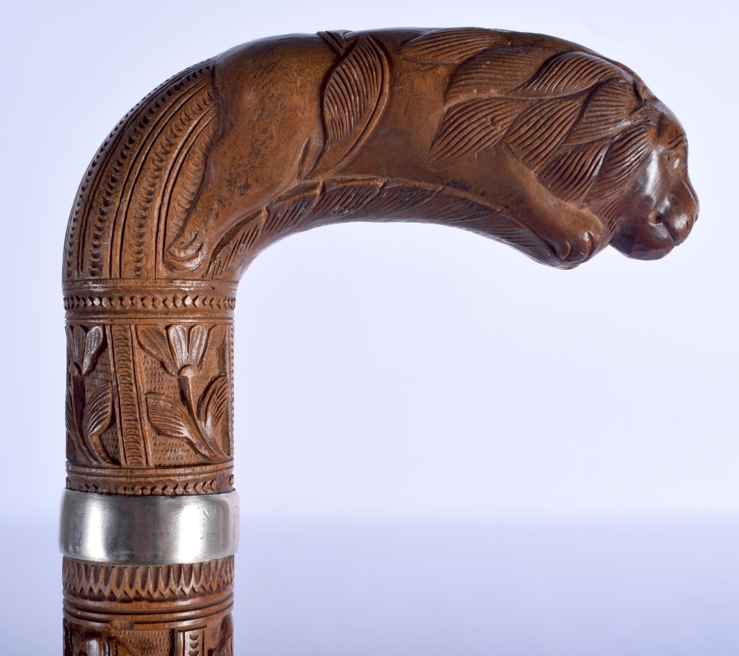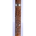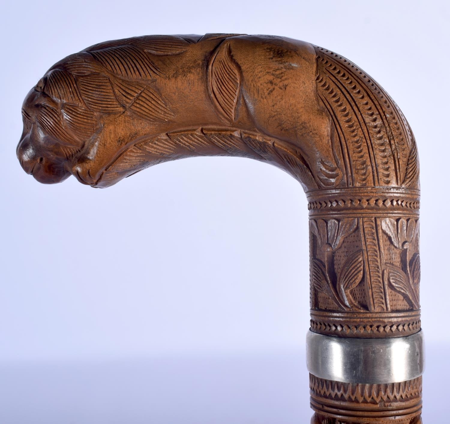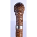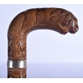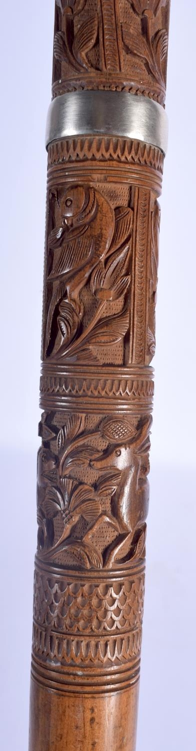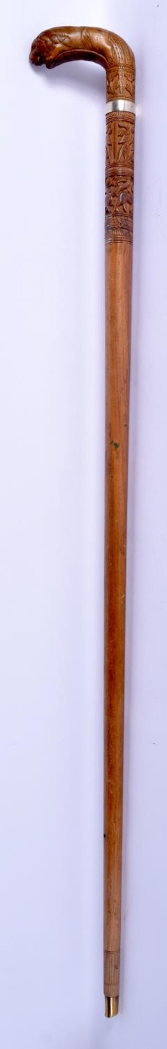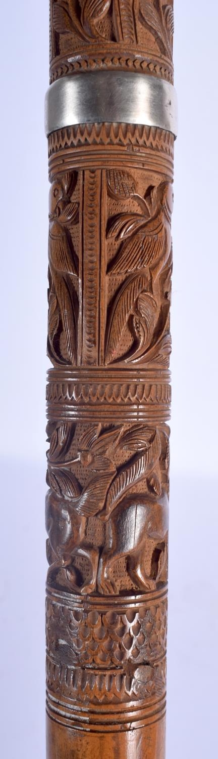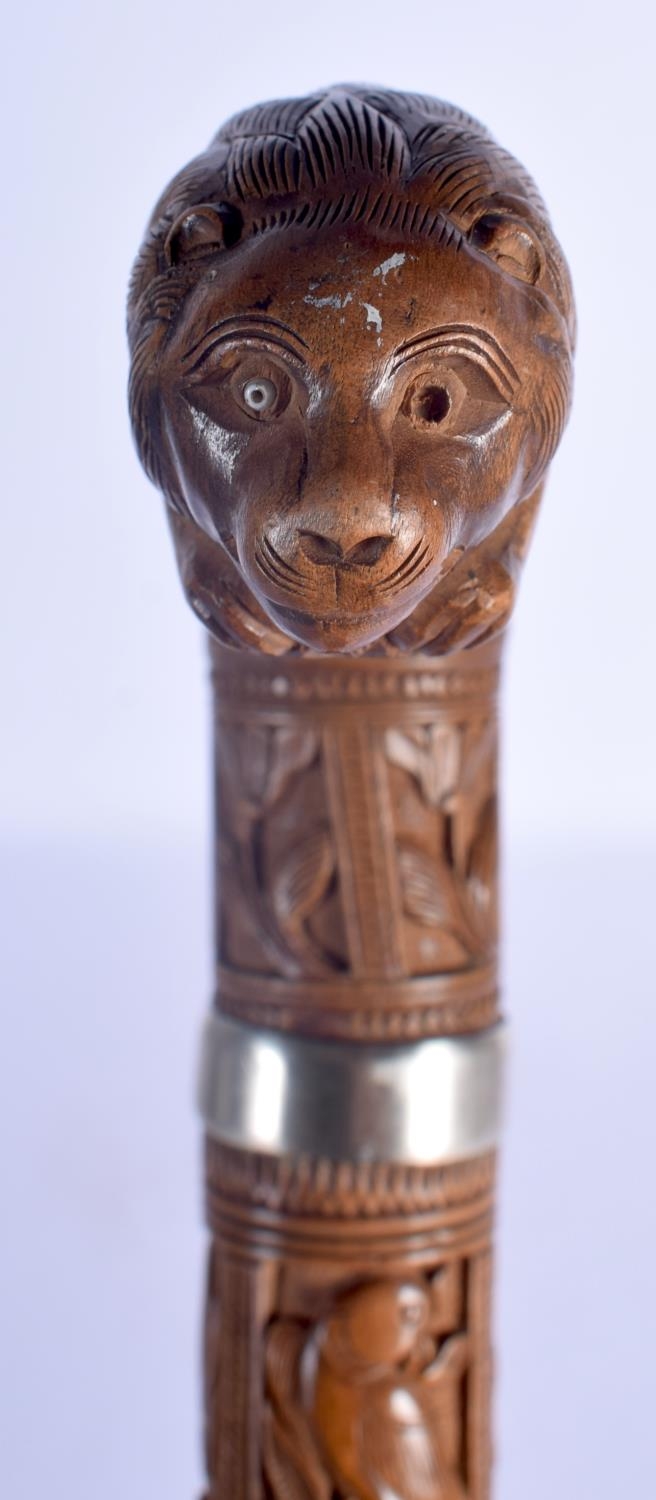 A 19TH CENTURY ANGLO INDIAN CARVED WOOD WALKING CANE with lion head handle, decorated with foliage and birds. 92 cm long.