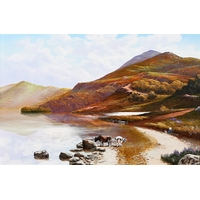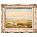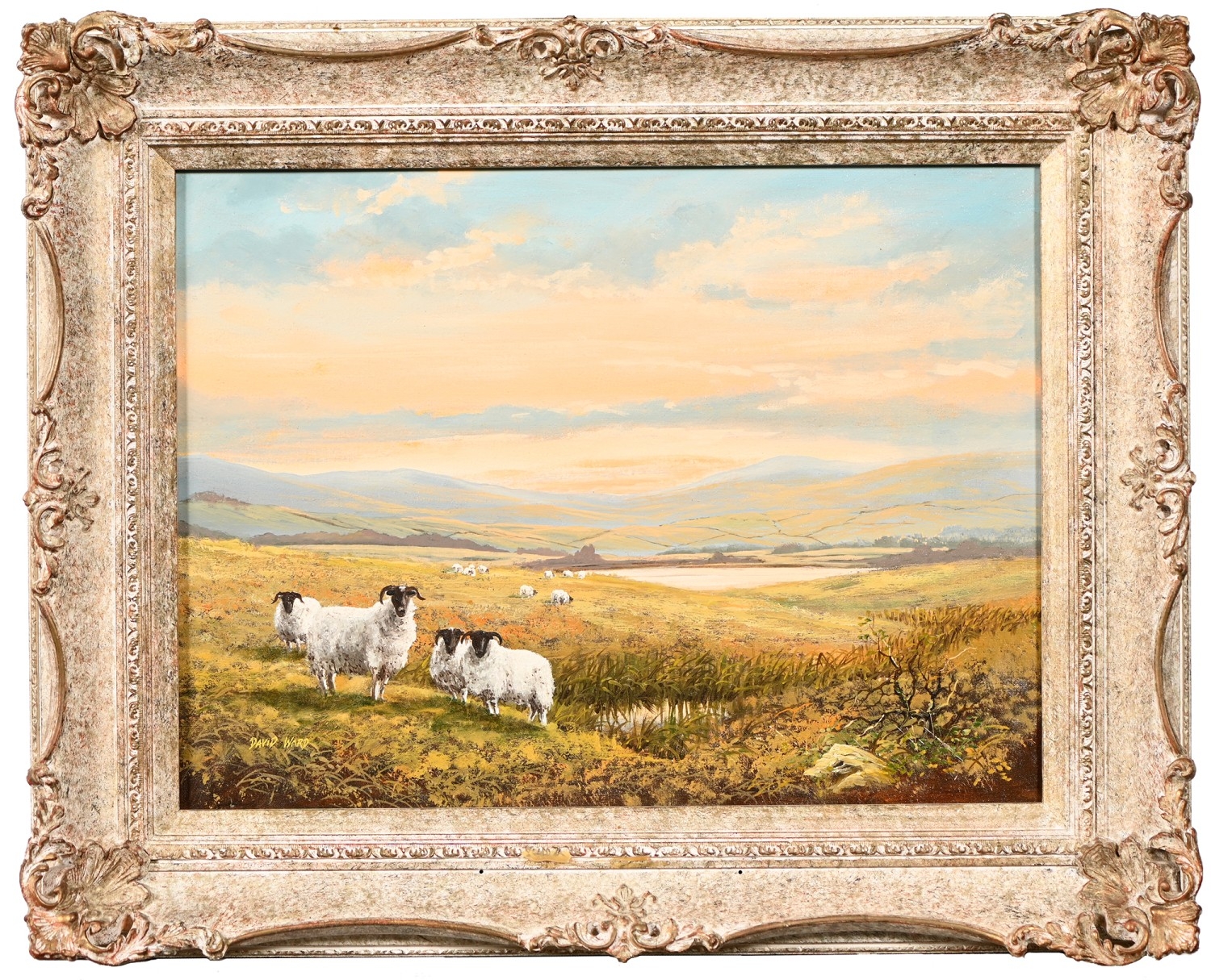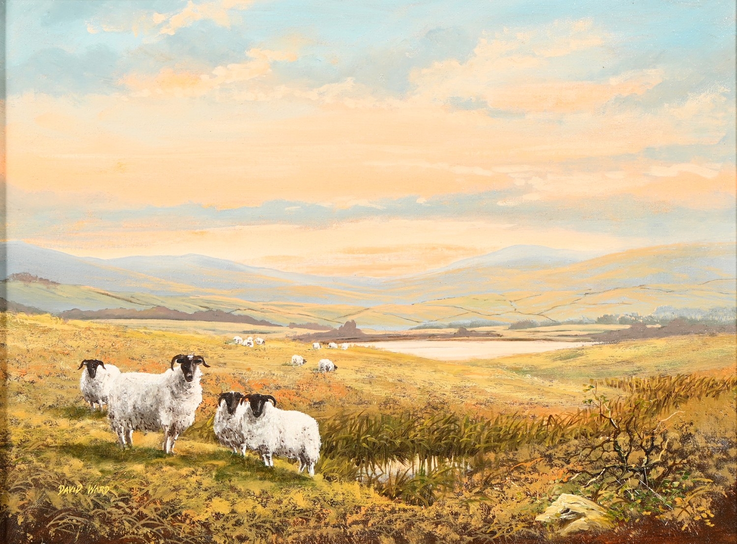 David Ward, 20th century - Sunset Over the Moor, sheep in the foreground, signed, oil on canvas, 29 x 39.5cm