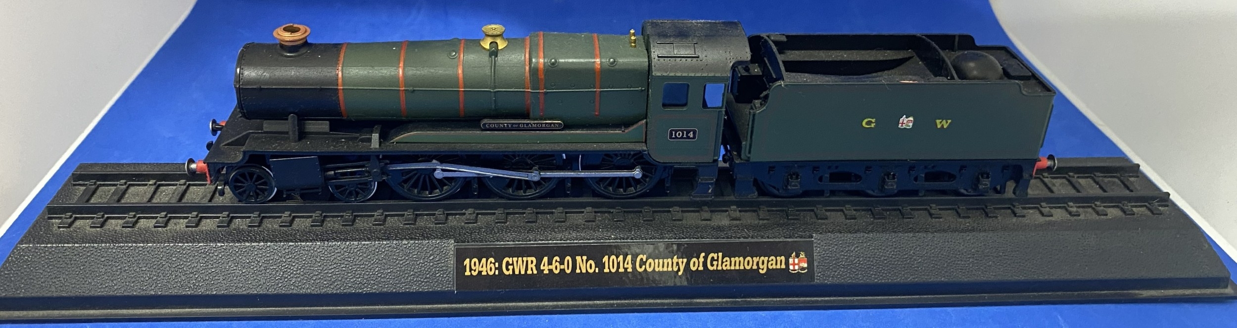 1946: GWR 4-6-0 No.1014 County of Glamorgan, train model on rail base.