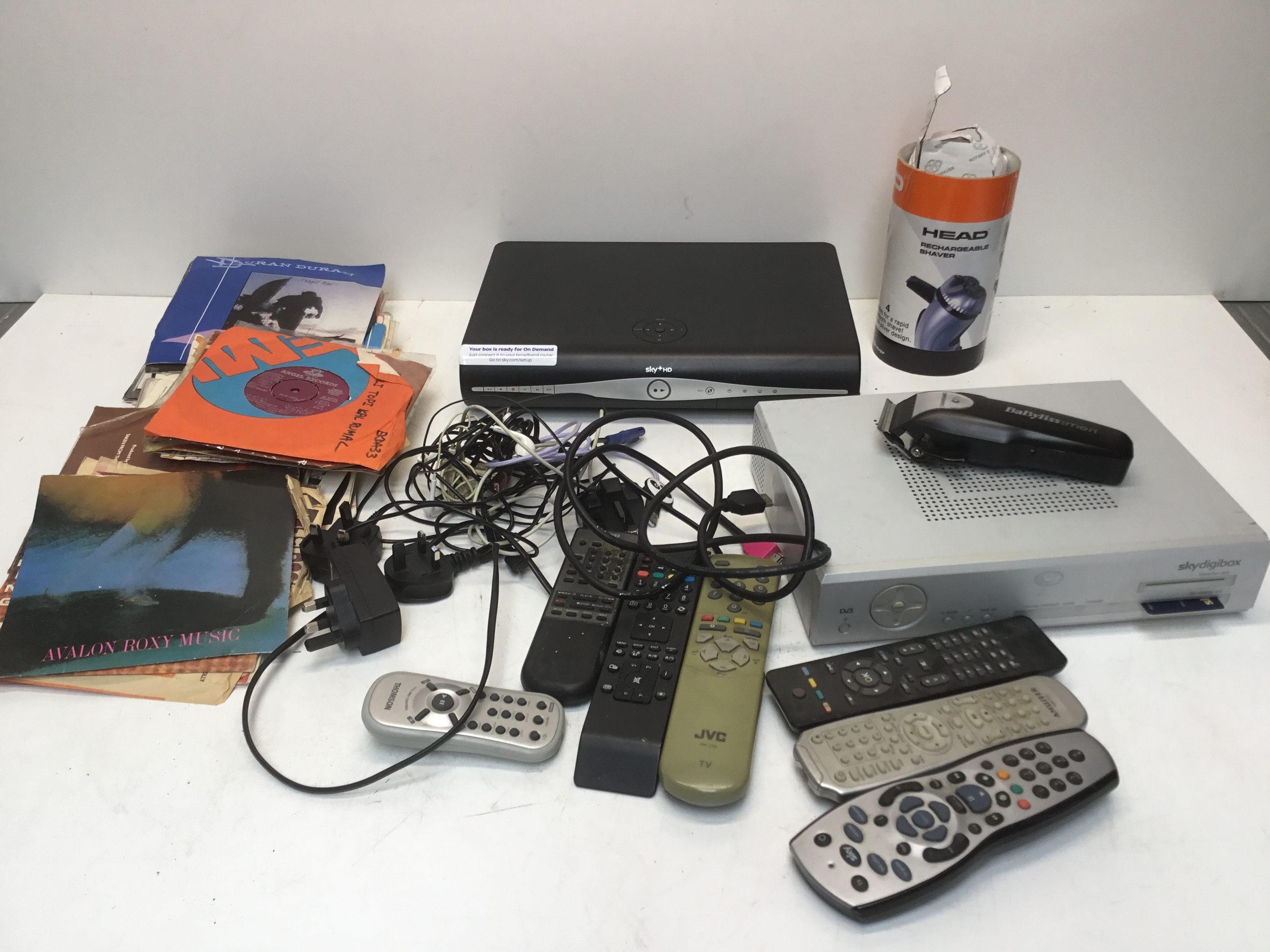 Two Sky boxes, remotes and a selection of 45 vinyl records