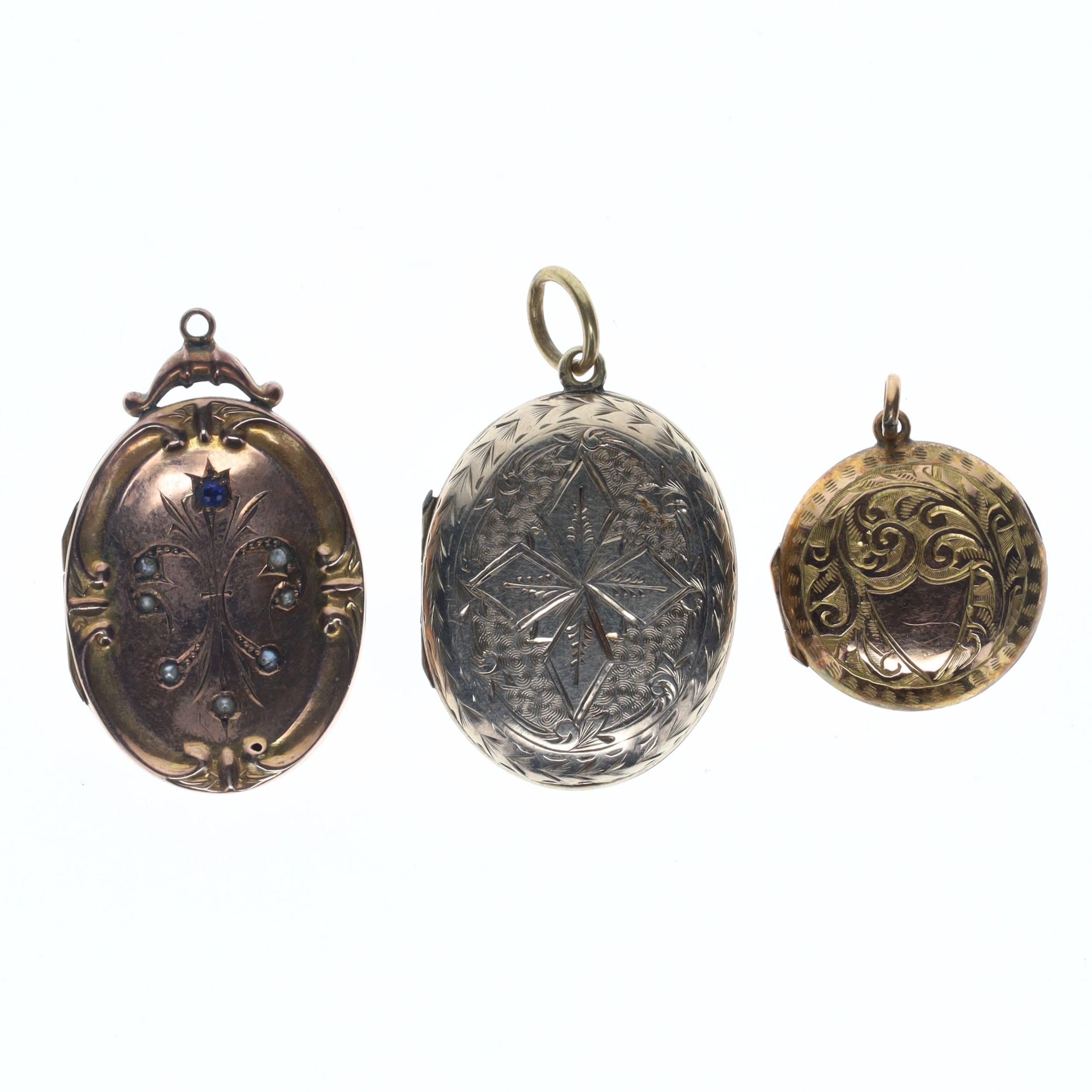 9ct Gold Back And Front Lockets Collection Pendants inc. Sapphire, Split Pearl, Etched