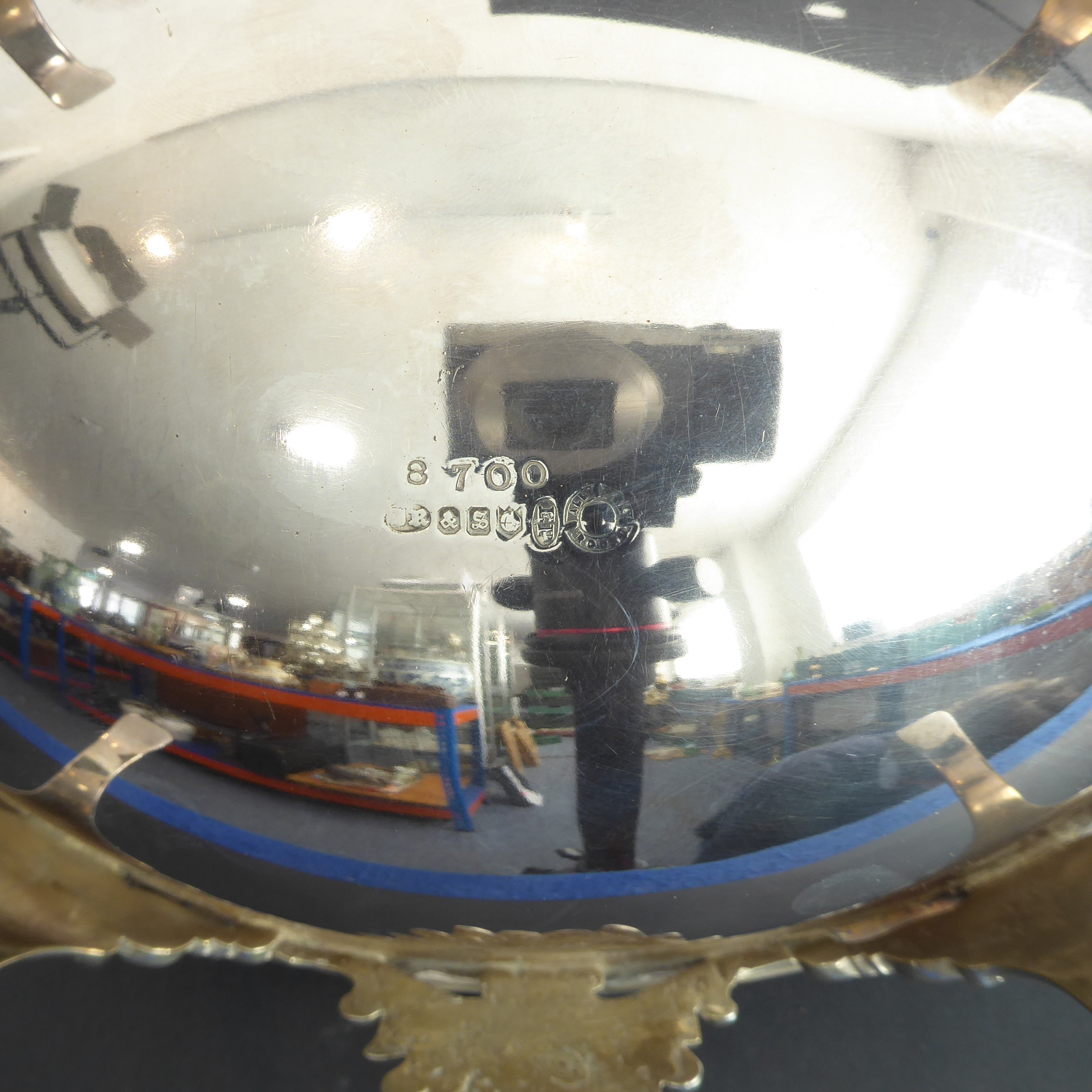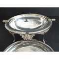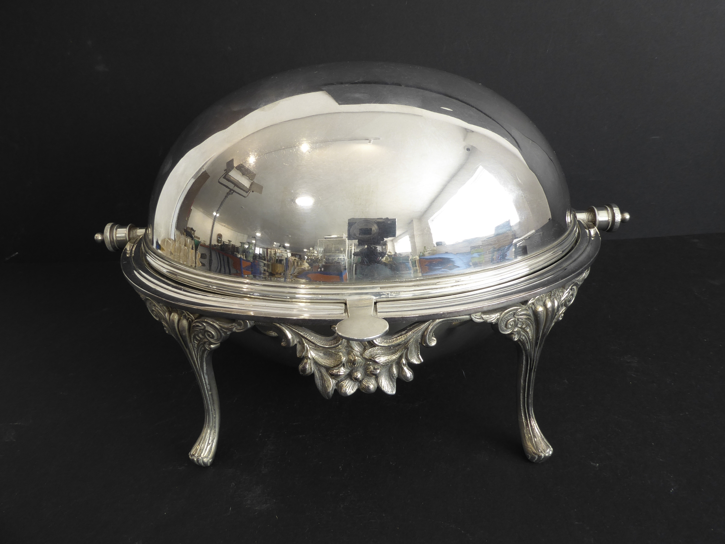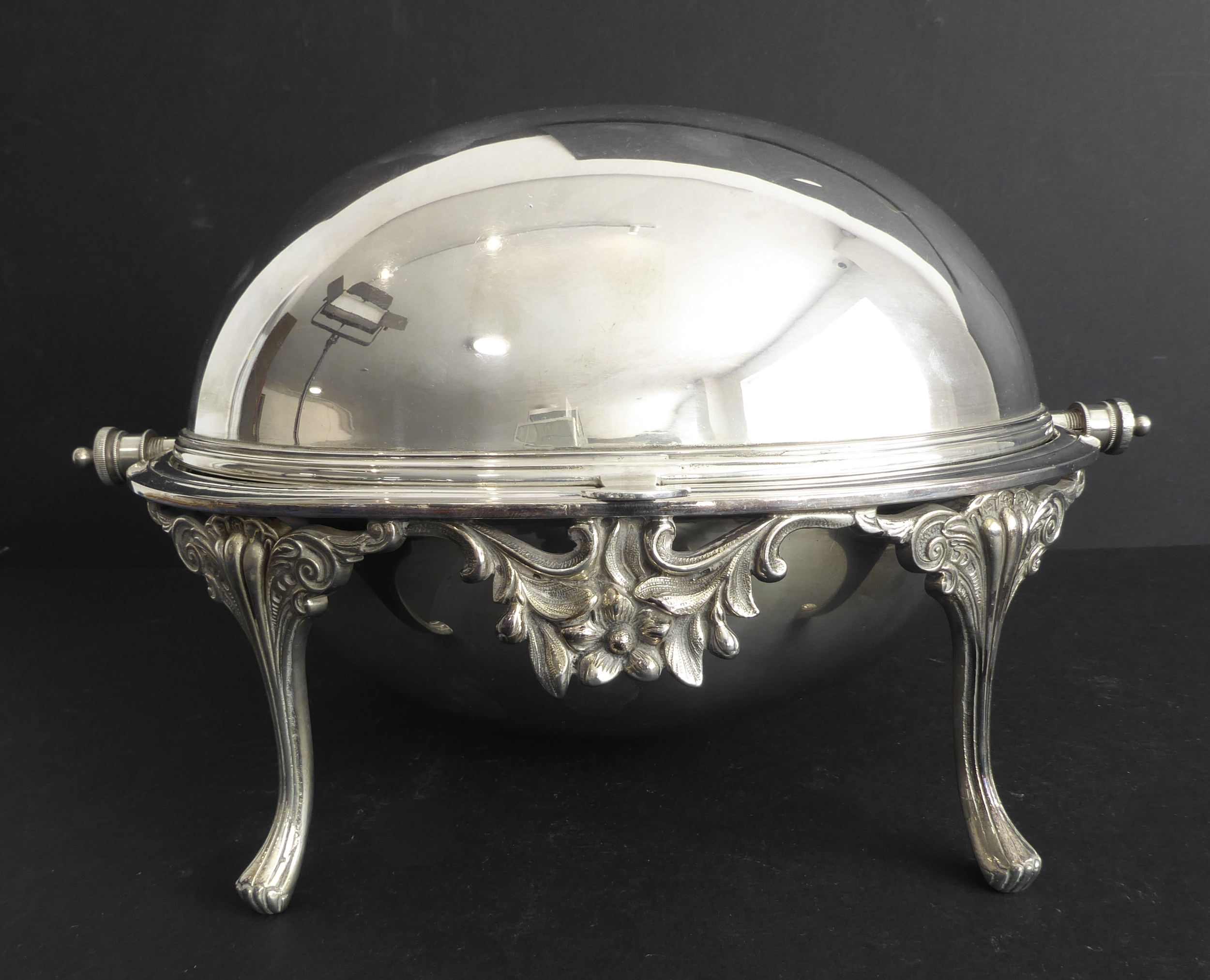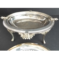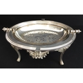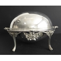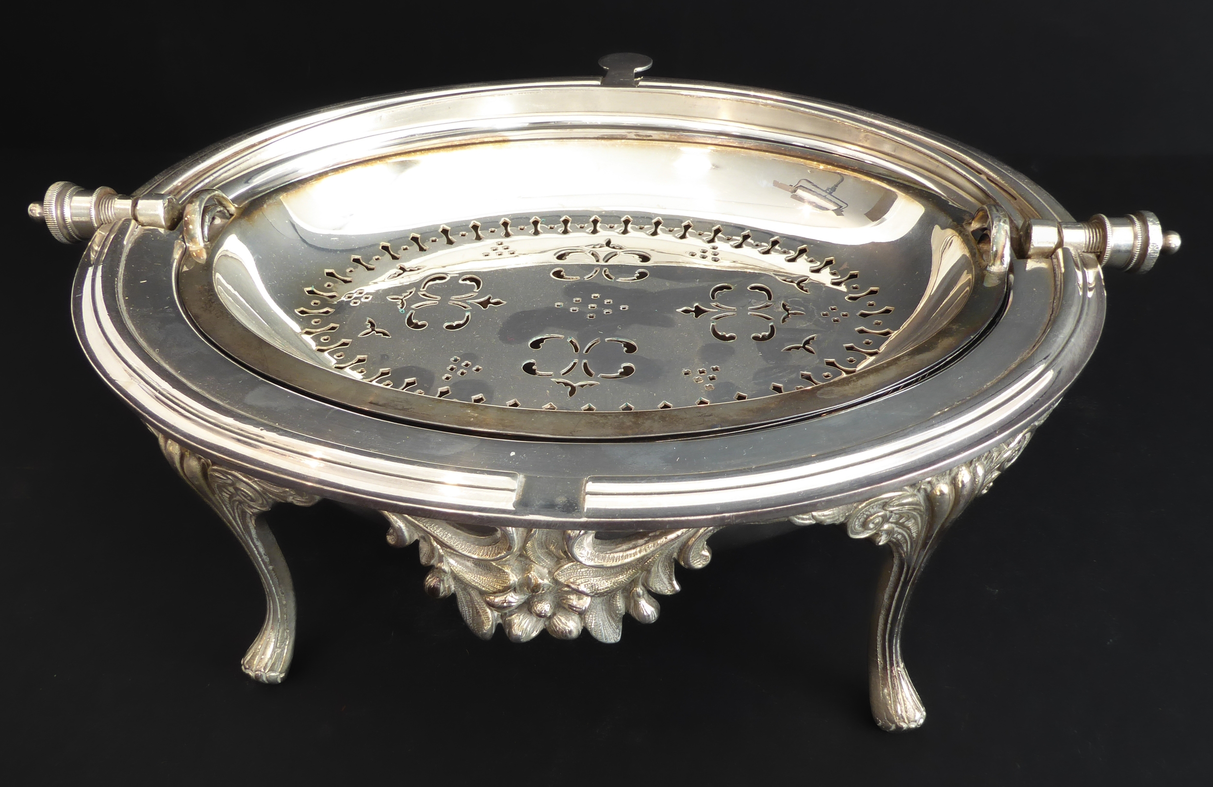 A late 19th century silver-plated, dome-topped, revolving bacon tureen with original pierced grill and central cast flowerhead and leaves, raised on four cast and fluted legs (31cm widest x 18.5cm high)