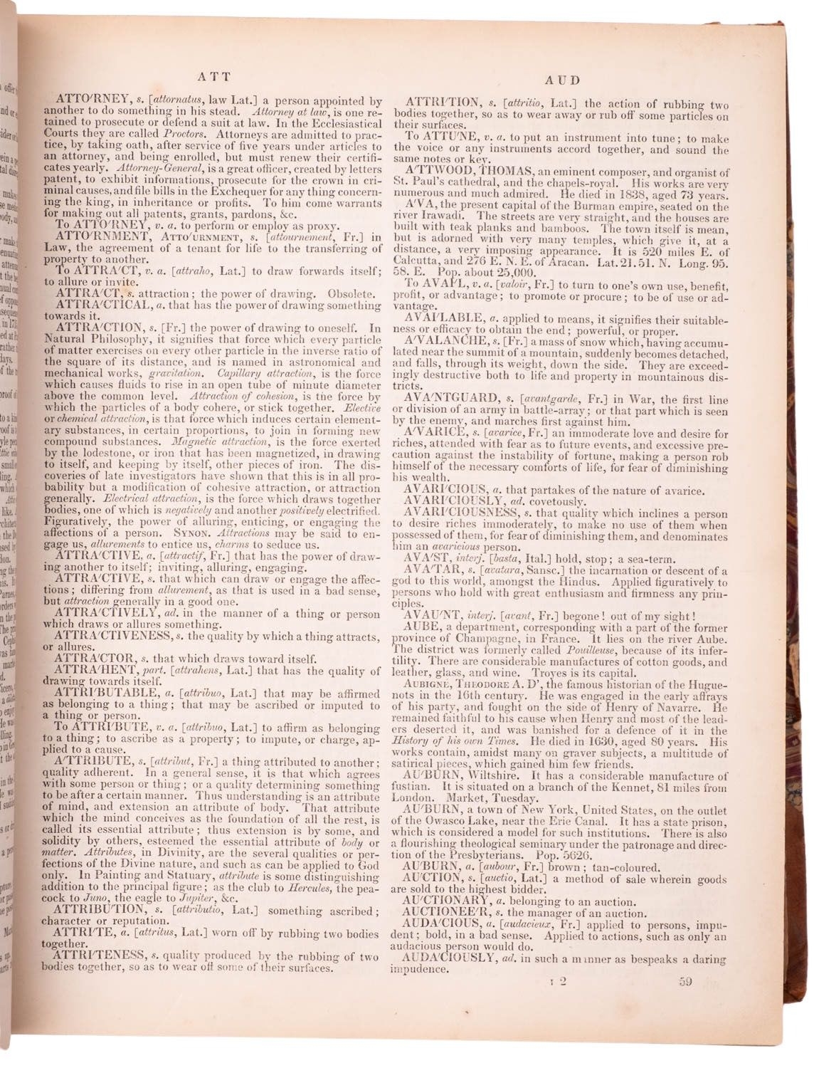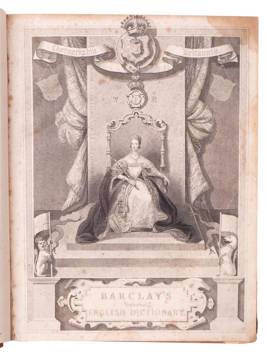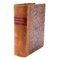 BARCLAY, James. A Complete and Universal Dictionary of the English Language, a new edition, London: George Virtue, nd [preface 1848], (lacks frontis.), engr. additional title, 21 engr. maps w. outline hand-colouring, 39 plates (one chipped and backed), red pencil marks to several pages, occasional chips and edge-tears, spotting and browning, final leaf of appendix (pp.983/4) torn with loss, contemp. half-calf over marbled boards, scuffed, later endpapers, red sprinkled edges, 4to.