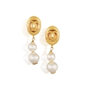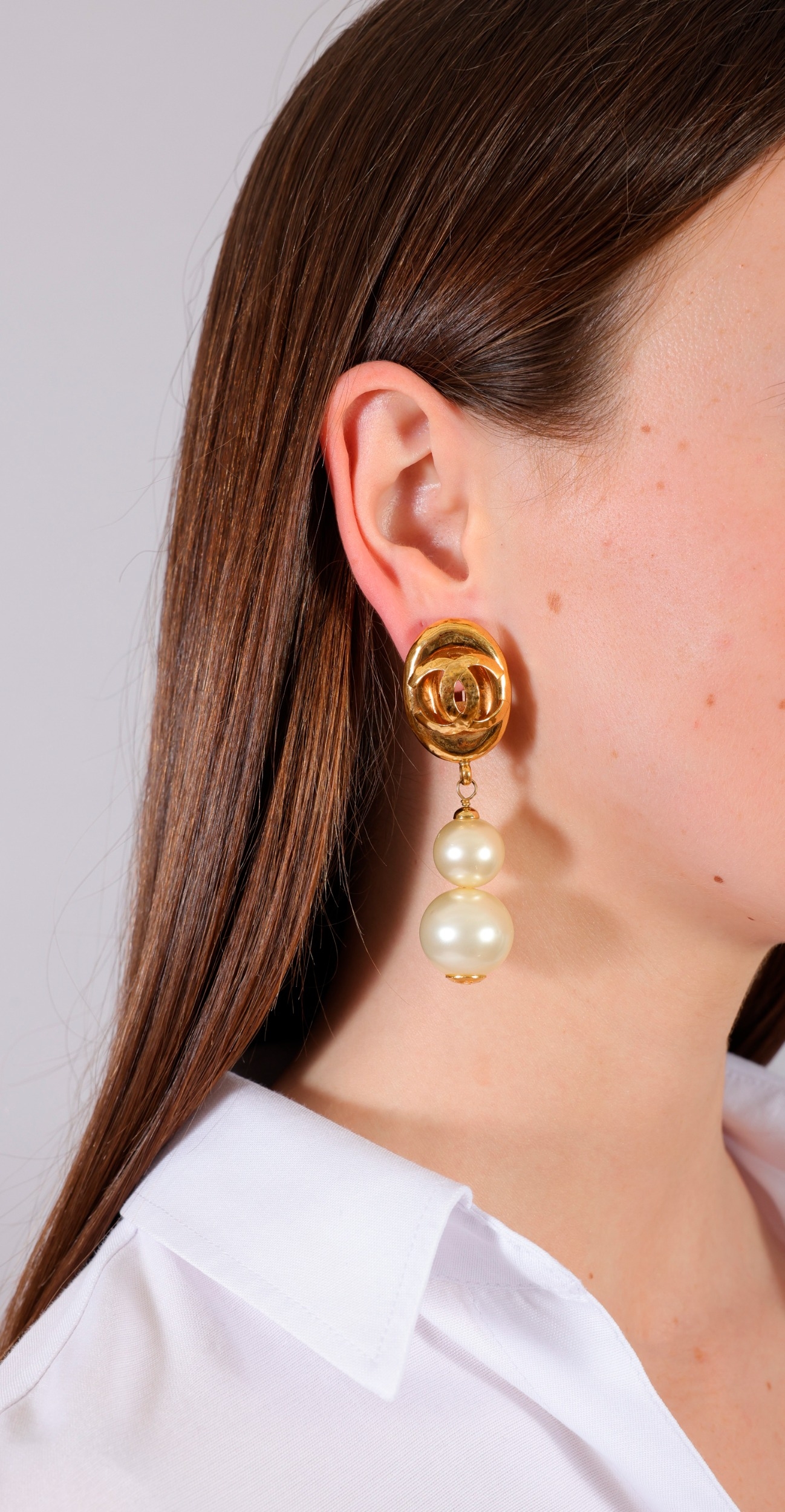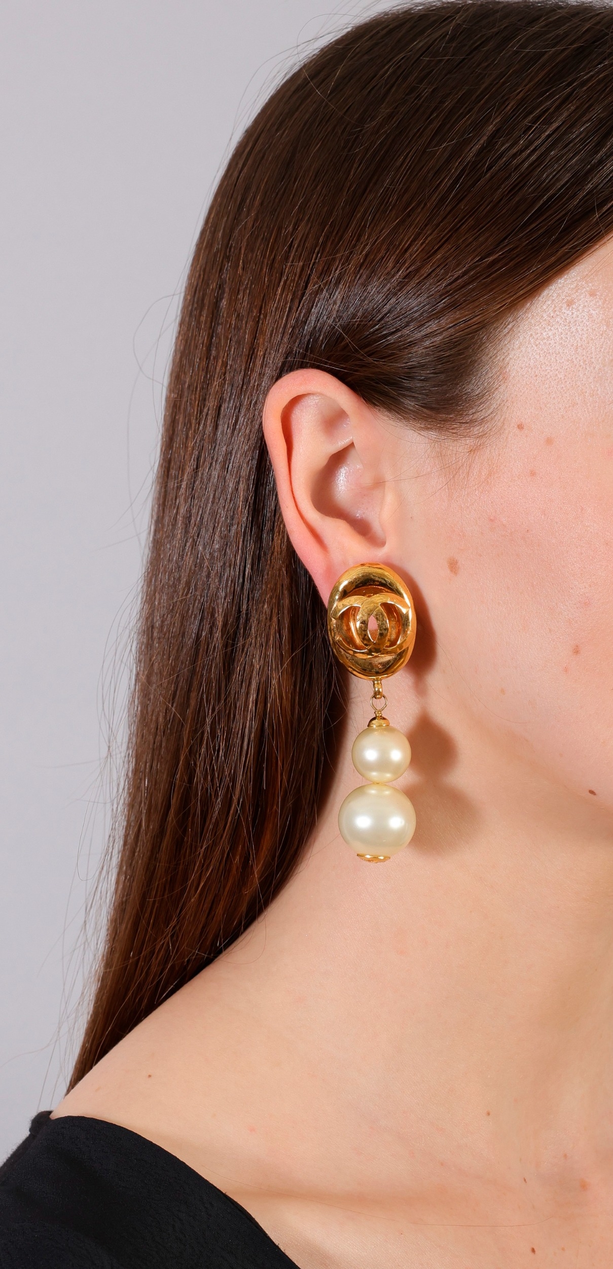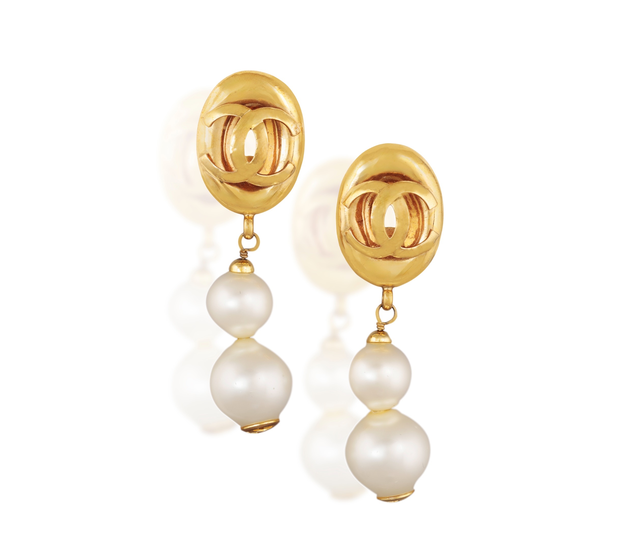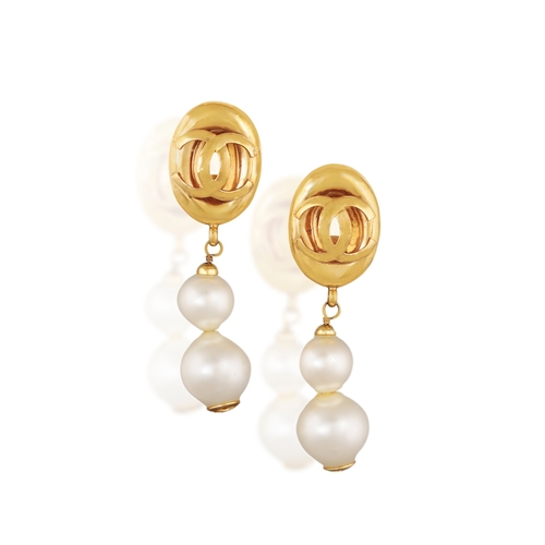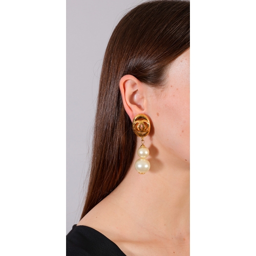 CHANEL: A PAIR OF BEAD PENDENT EARCLIPS Each oval-shaped surmount with Chanel logo ‘CC’, suspending two graduating beads of cream tint, measuring 15.8mm and 20.5mm, to a logo terminal, signed Chanel, maker’s mark, with maker’s case, length 8cm