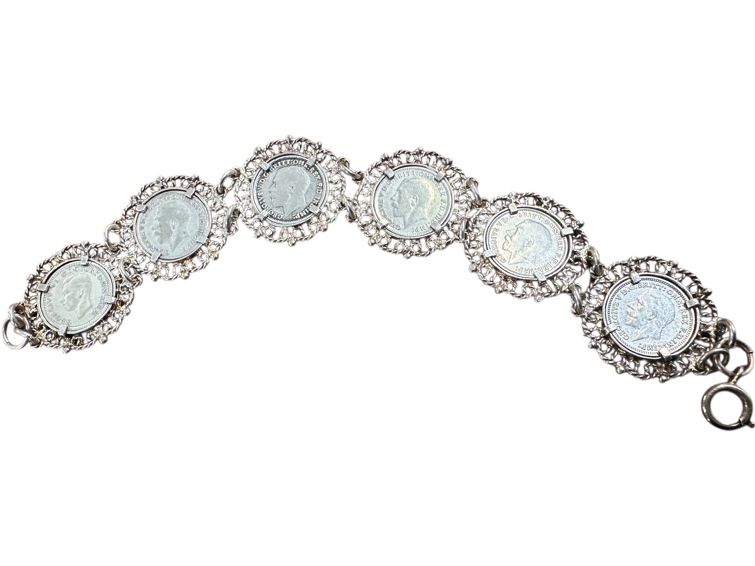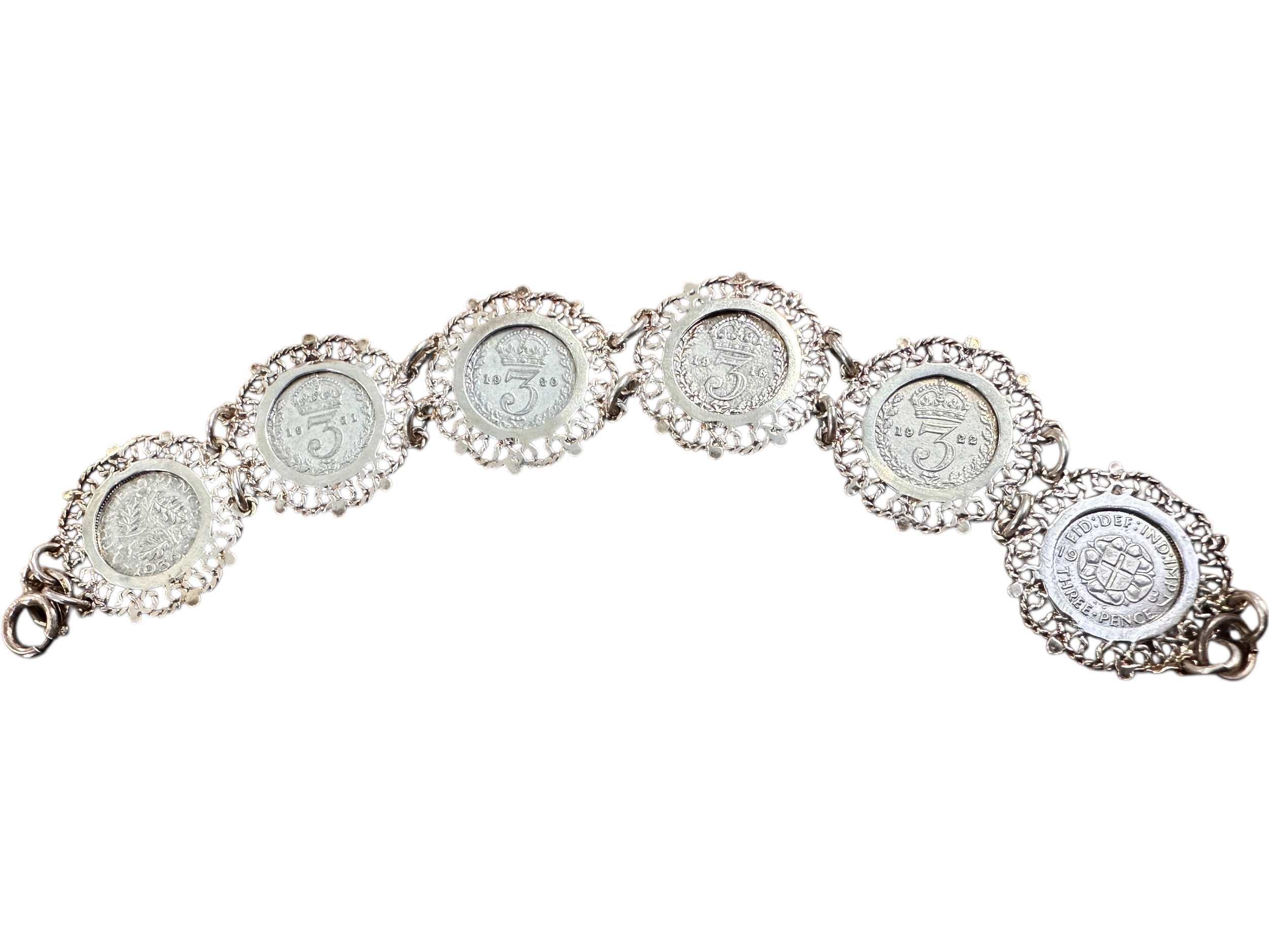 Silver 3D Coin Bracelet Set with 6 George V/GeorgeVI Threepenny Coins. Stamped 'Sterling' to Clasp. Length 7.5 inches. 24.3g