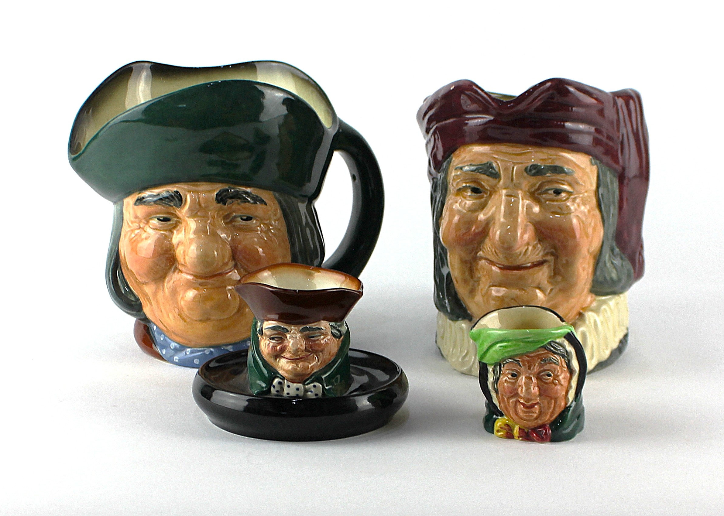 A Royal Doulton 'Old Charley' character bibelot, height 7.2cm, together with two Royal Doulton character jugs 'Simon the Cellerar', 'Toby Philpotts' and a miniature Royal Doulton 'Sairey Gamp' character match holder/ jug, height 5.2cm (4)