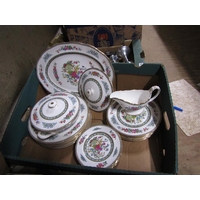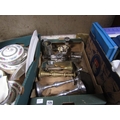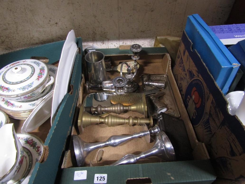 BOX OF MIXED METALWARE TO INCL CANDLESTICKS, DRESSING TABLE ETC