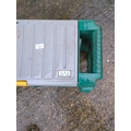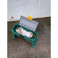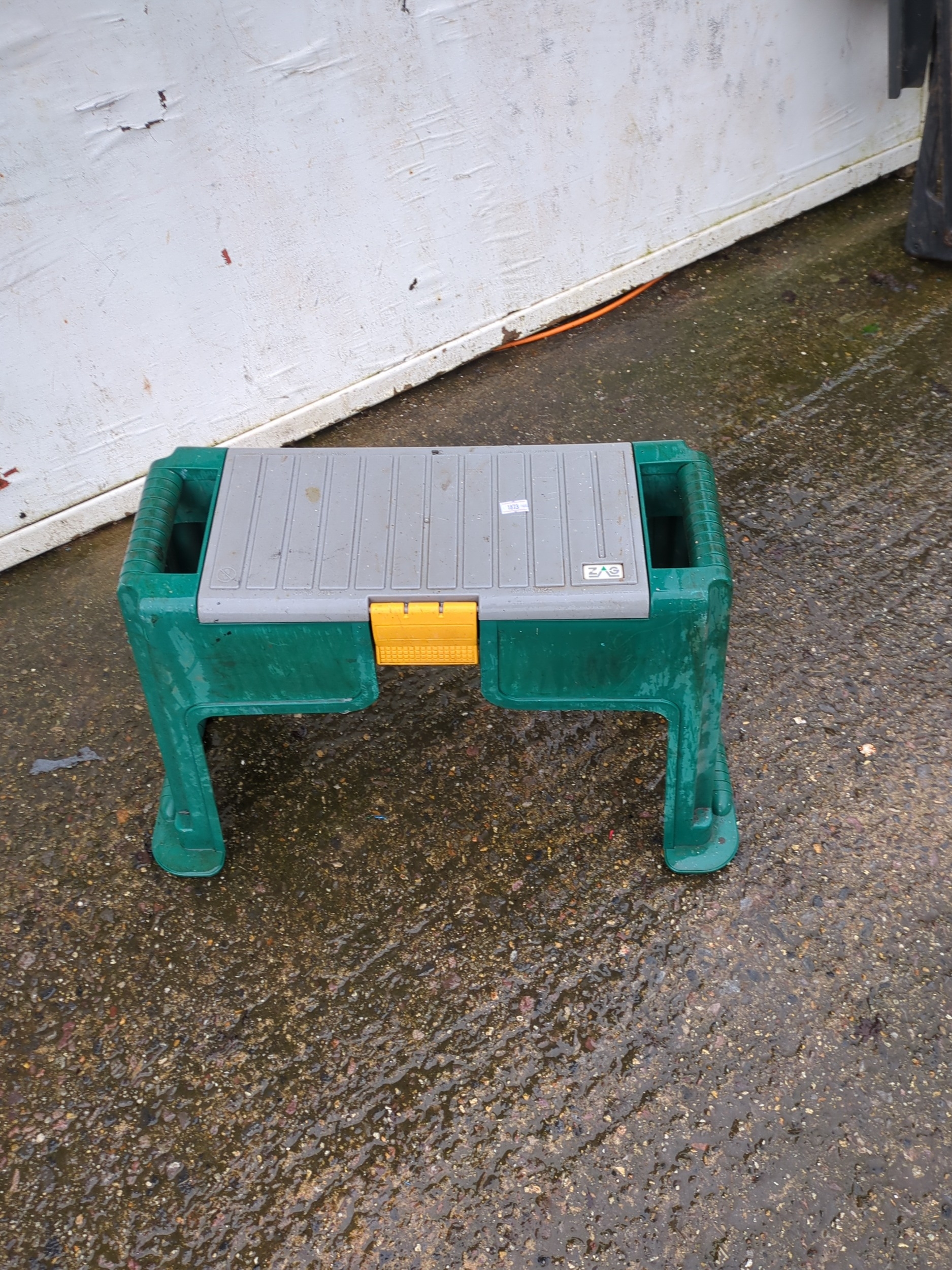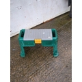 This EVA product functions as a dual-purpose kneeler and stool, designed specifically for garden use. It features a durable green plastic frame and a grey top that opens to reveal a convenient storage compartment for gardening tools. The product includes a handle for easy carrying and a sturdy build to support weight when used as a seat or kneeler.