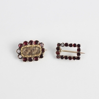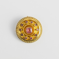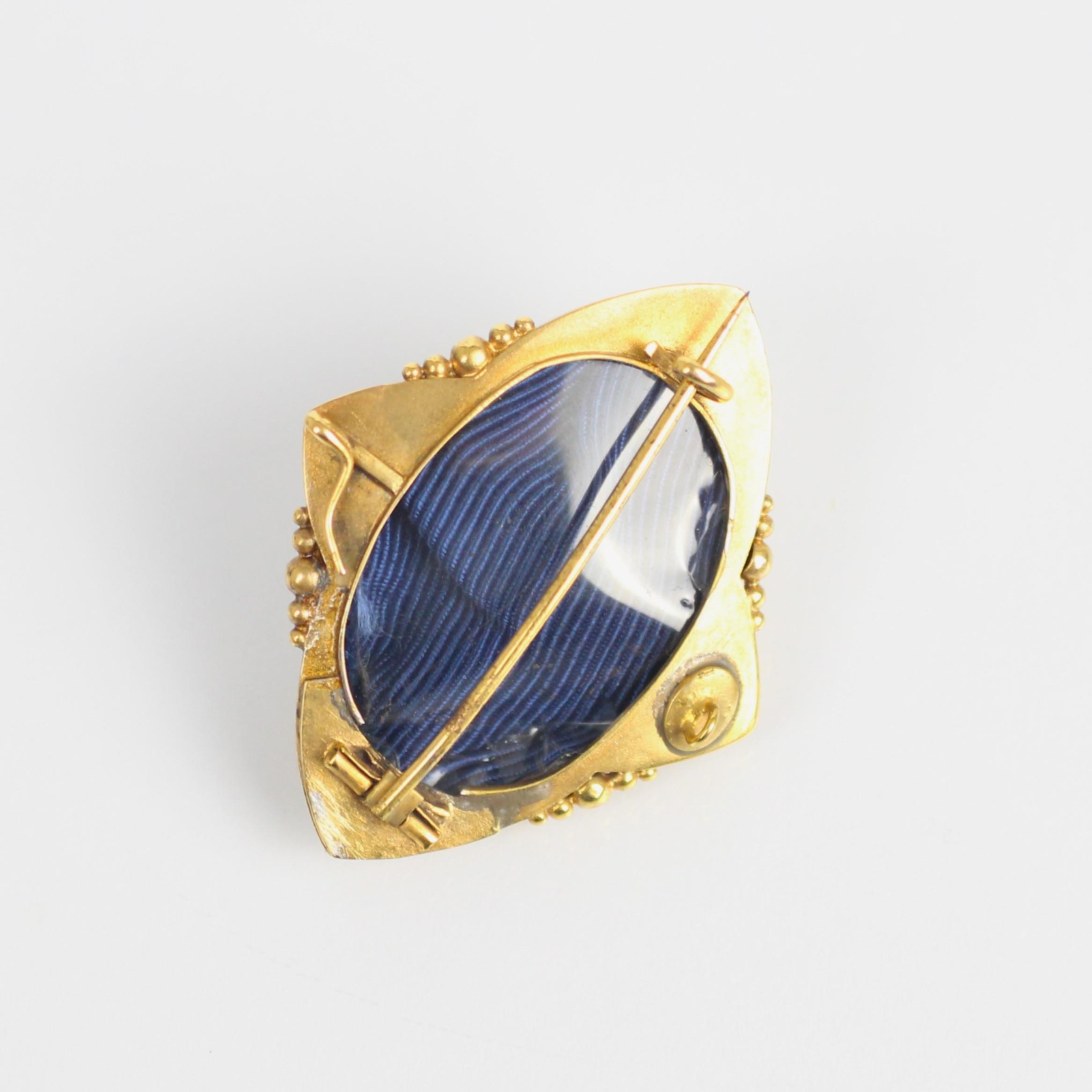 A 19th century gold coloured enamel and split pearl brooch/pendant, the shaped brooch with raised central channel of split pearls with blue enamel borders, above spherical detail to brooch, vacant aperture, hinge pin and pendant bale to reverse, unmarked, 4.5cm wide, 8.8gms (at fault)