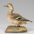 AN EARLY 20TH CENTURY TAXIDERMY TEAL UPON A NATURALISTIC BASE.