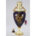 Coalport two handled urn in cobalt with raised gilt embellishments with central lozenge handpainted depicting fruit with lid appears unsigned in the manner of Chivers with bespoke wooden fitted case, approx. 30cm high
