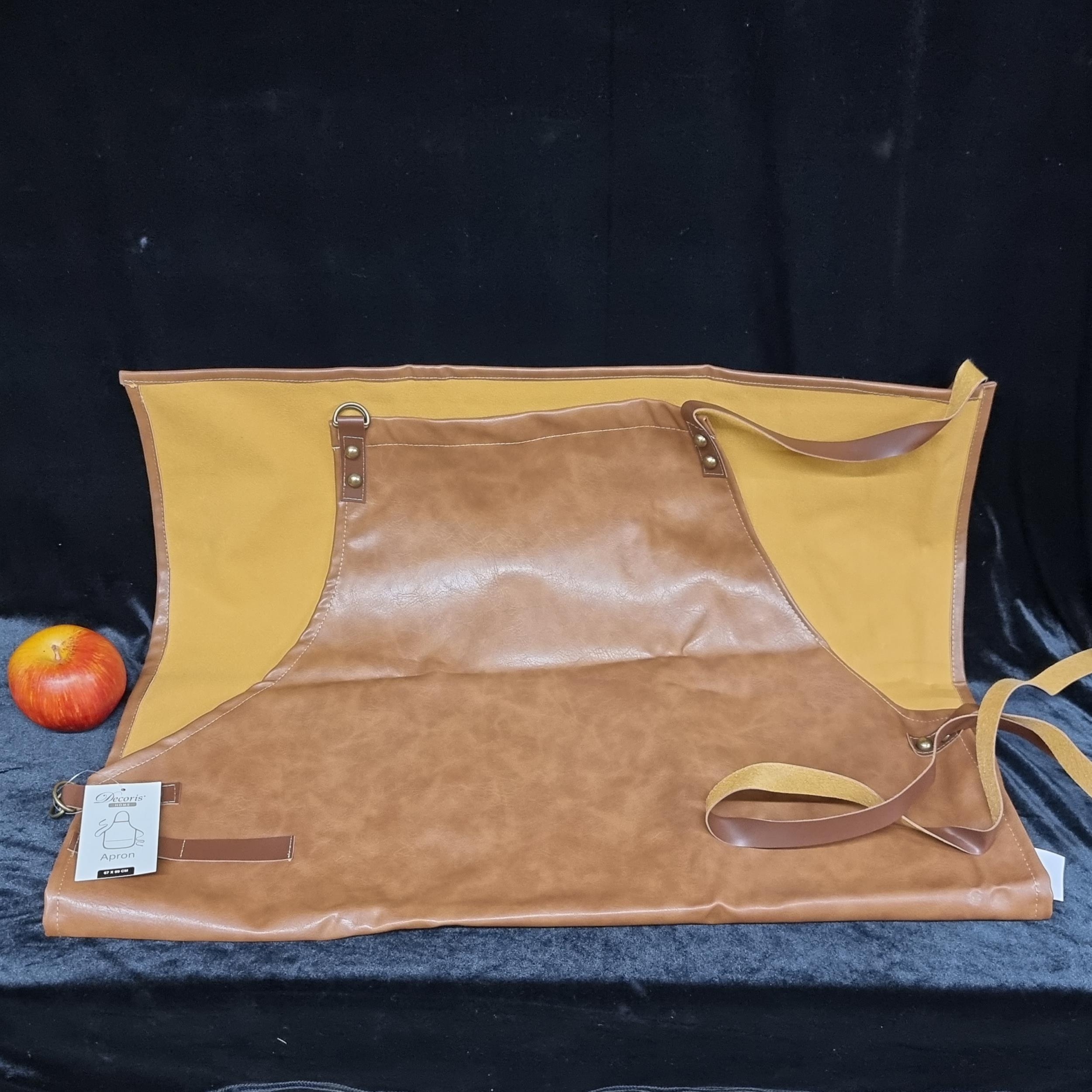 A Brown Leatherette apron with tie-strings by ''Decoris Home'' H99cm x W67cm. Brand new with tags.